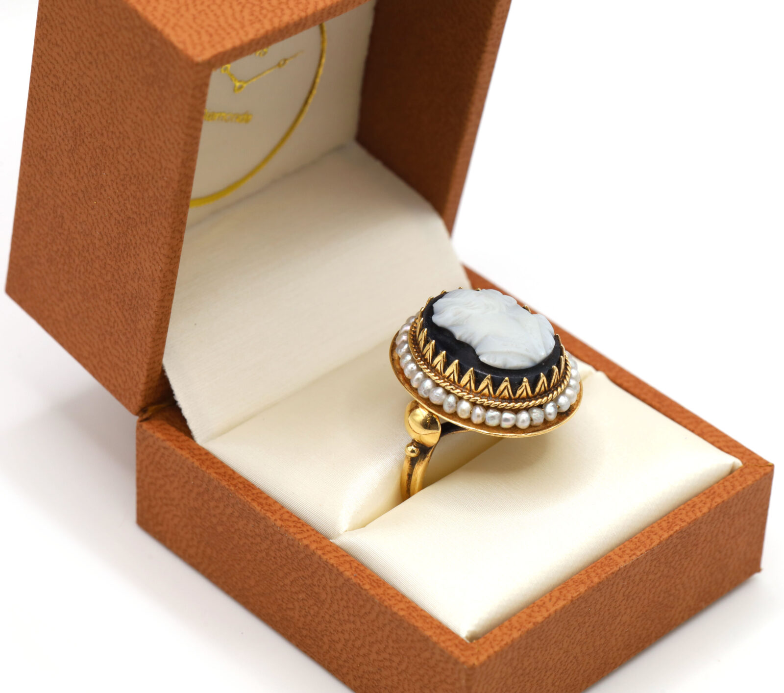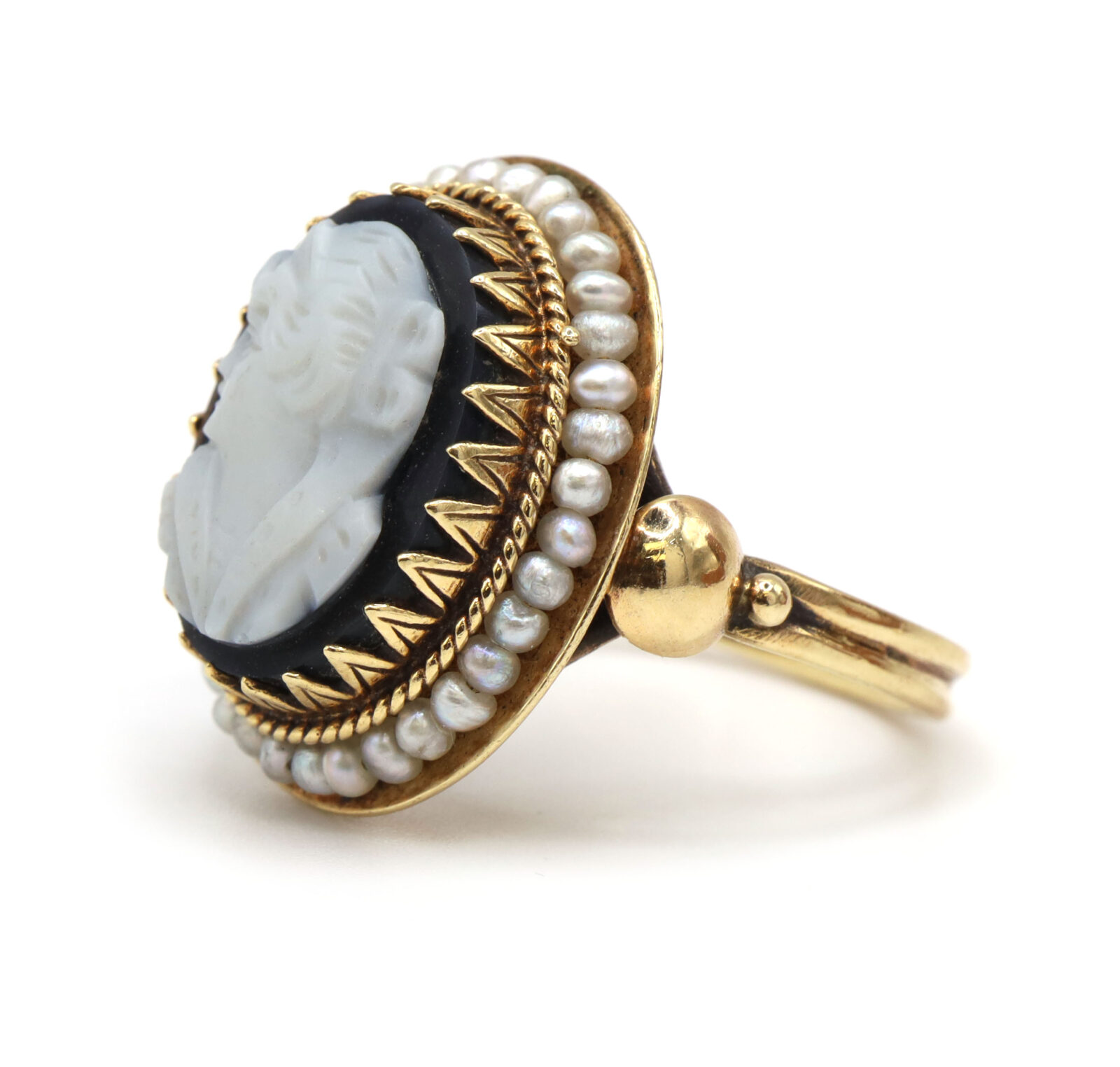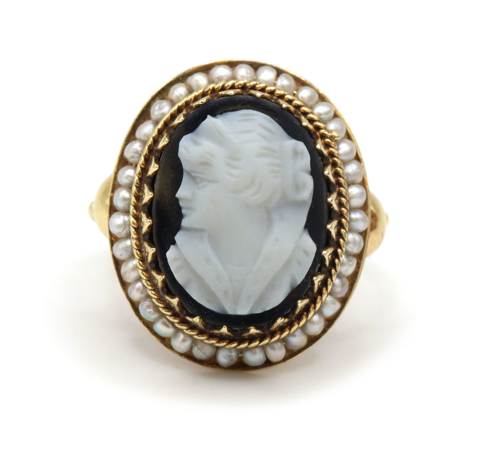 Ring Size: 7.5 Material: 14k Yellow Gold Width of Front: 22mm Width of Back: 2.5mm Weight: 6.85 grams Condition: Vintage Stone: Onyx & Pearl