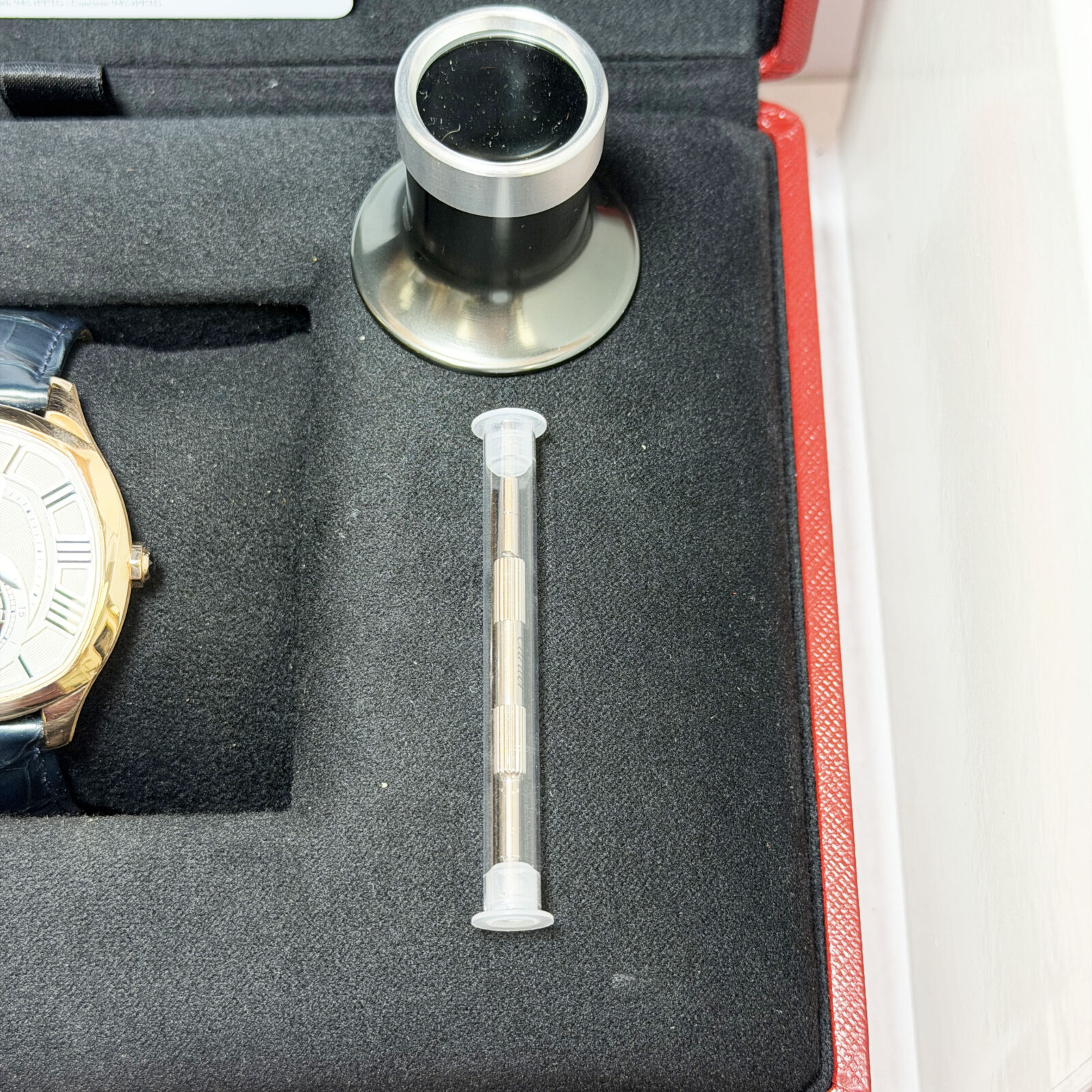 This Cartier watch comes with its box, booklets, hangtag, brand accessories, and warranty card. The photos shown are of the exact watch being sold and accurately represent its condition. This watch is in stock and ready to ship immediately!