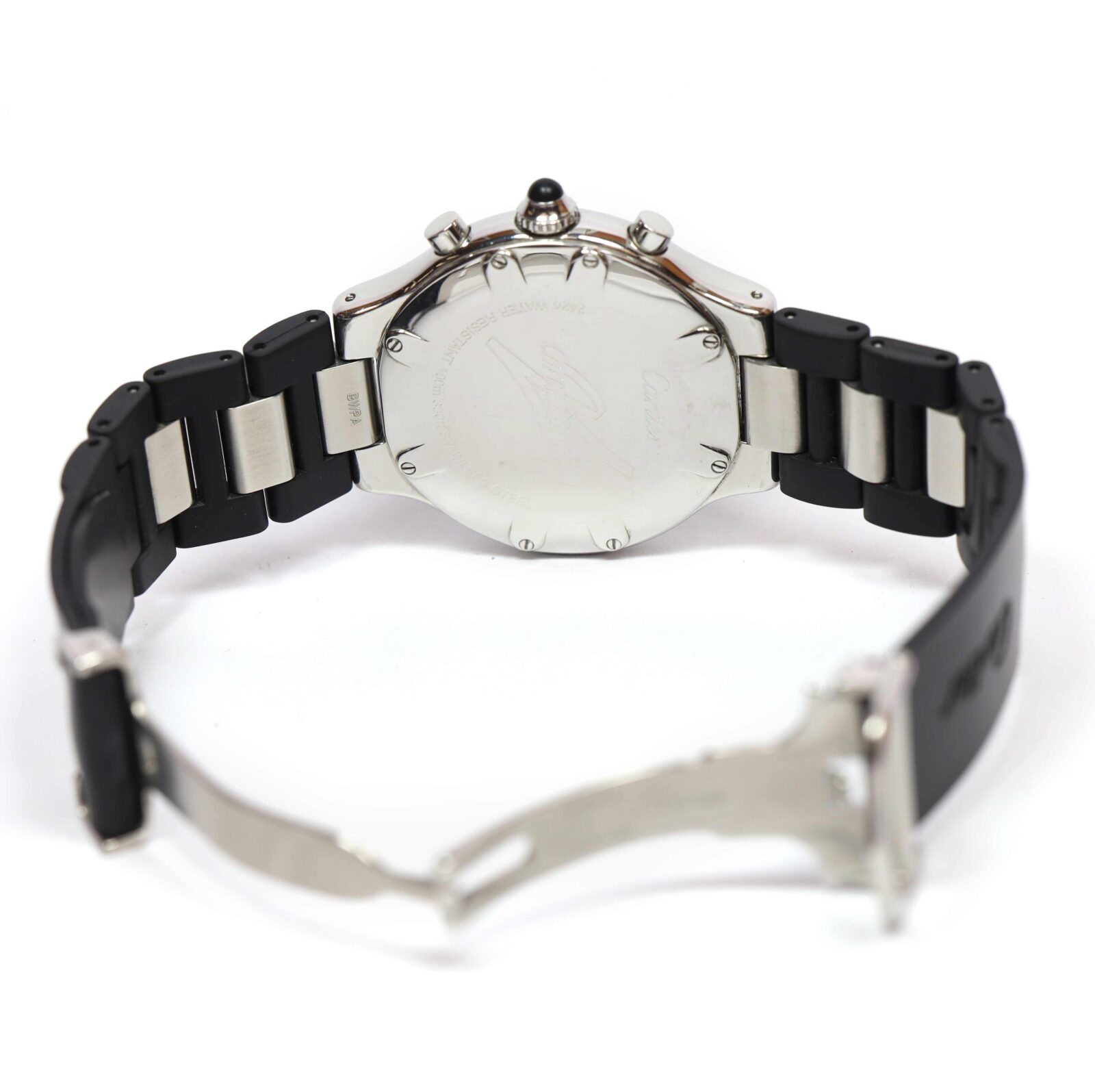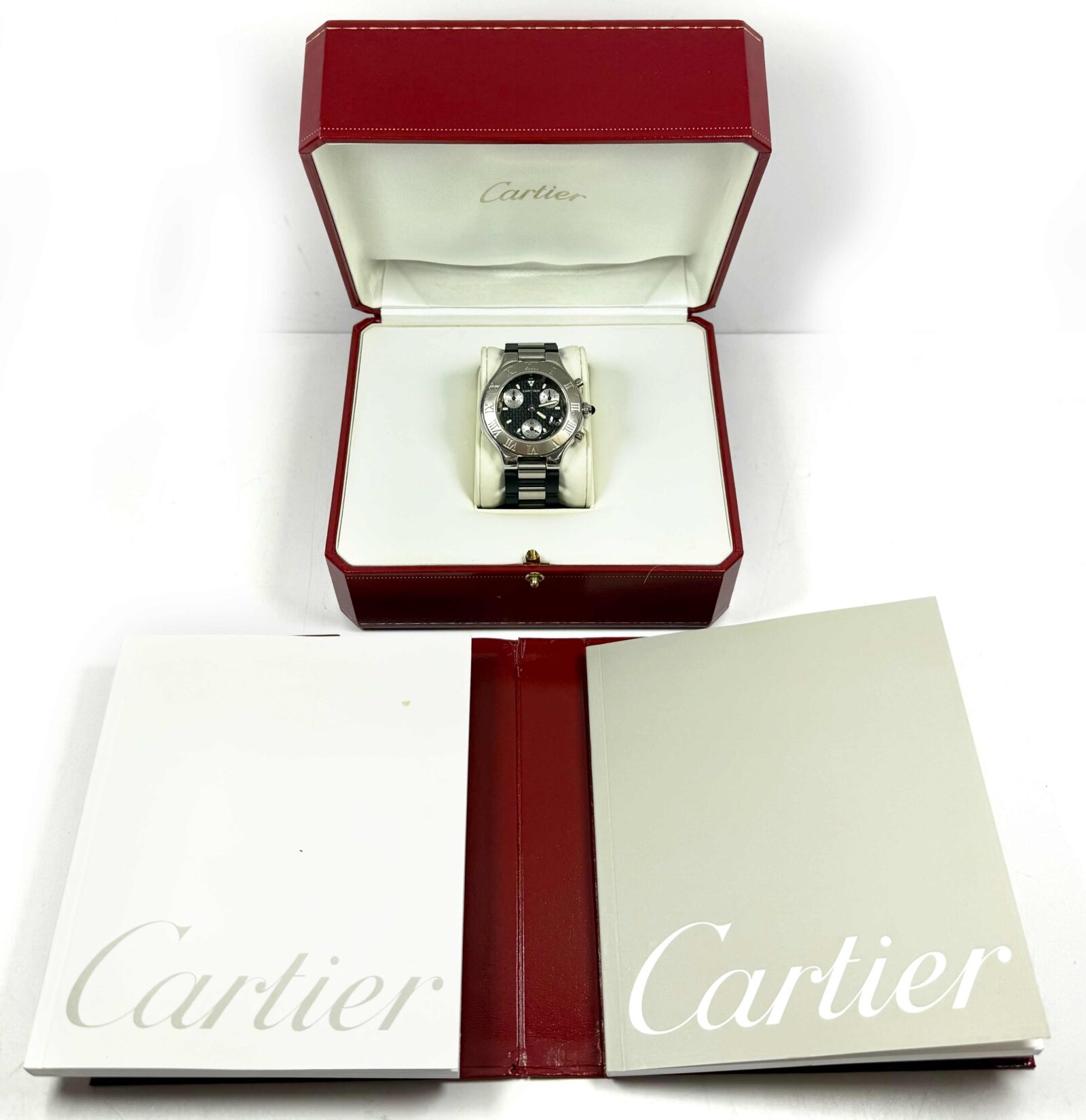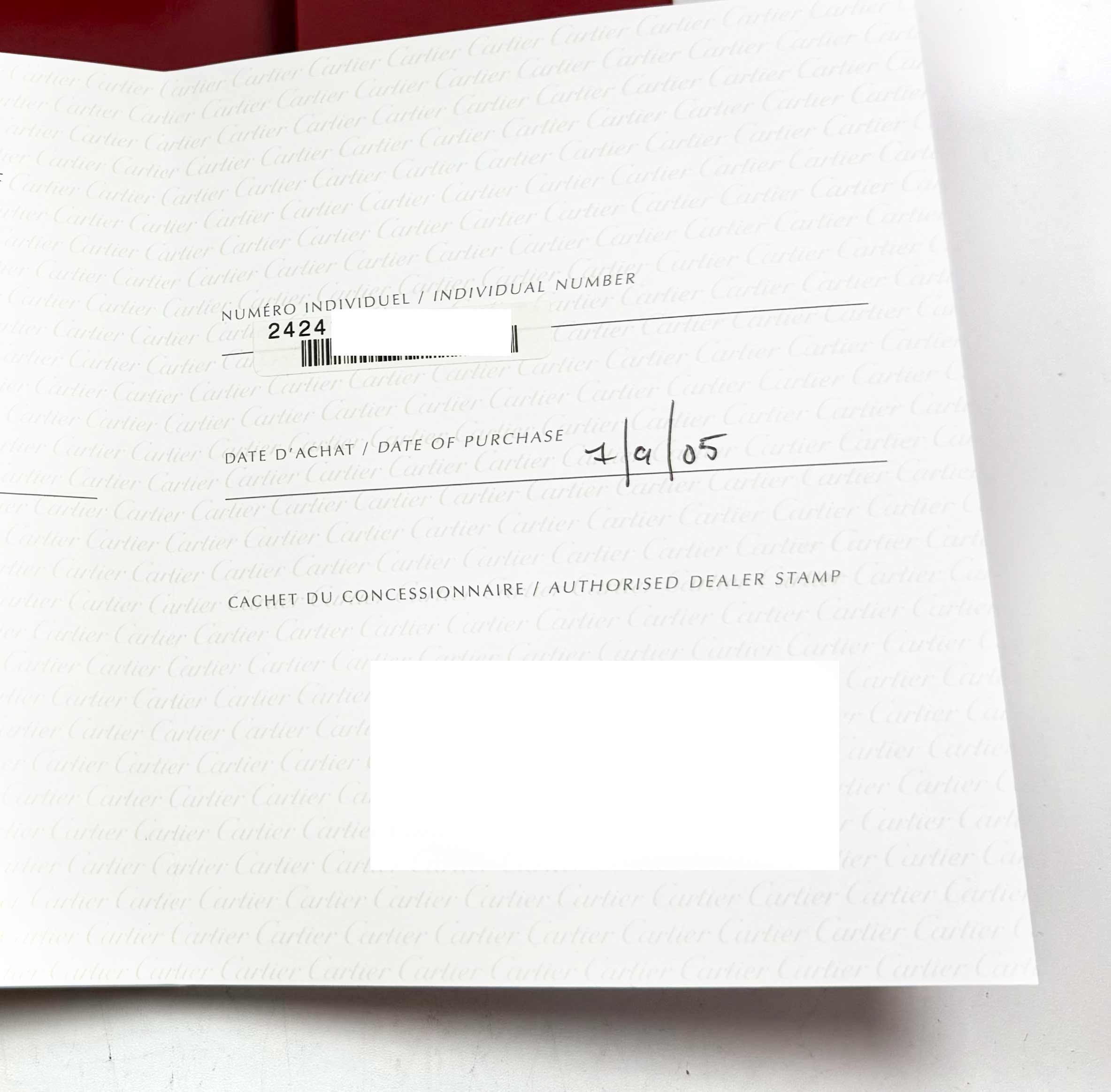 This cartier watch is in good overall condition showing signs of surface wear consistent with preowned watches. This comes with its box, booklets, and warranty paper dated july 9th, 2005 as shown in the pictures attached. This watch is in stock and available t...