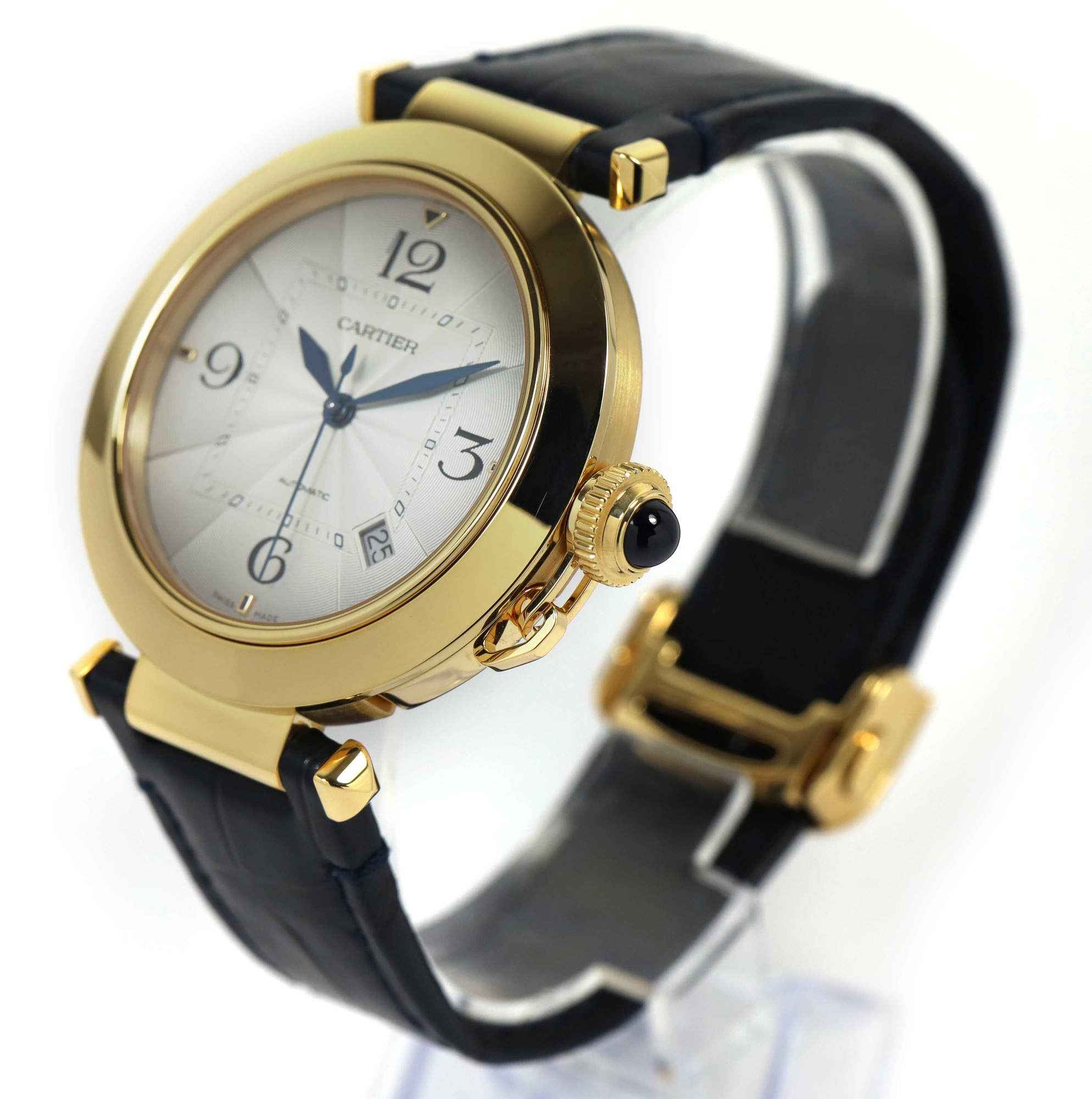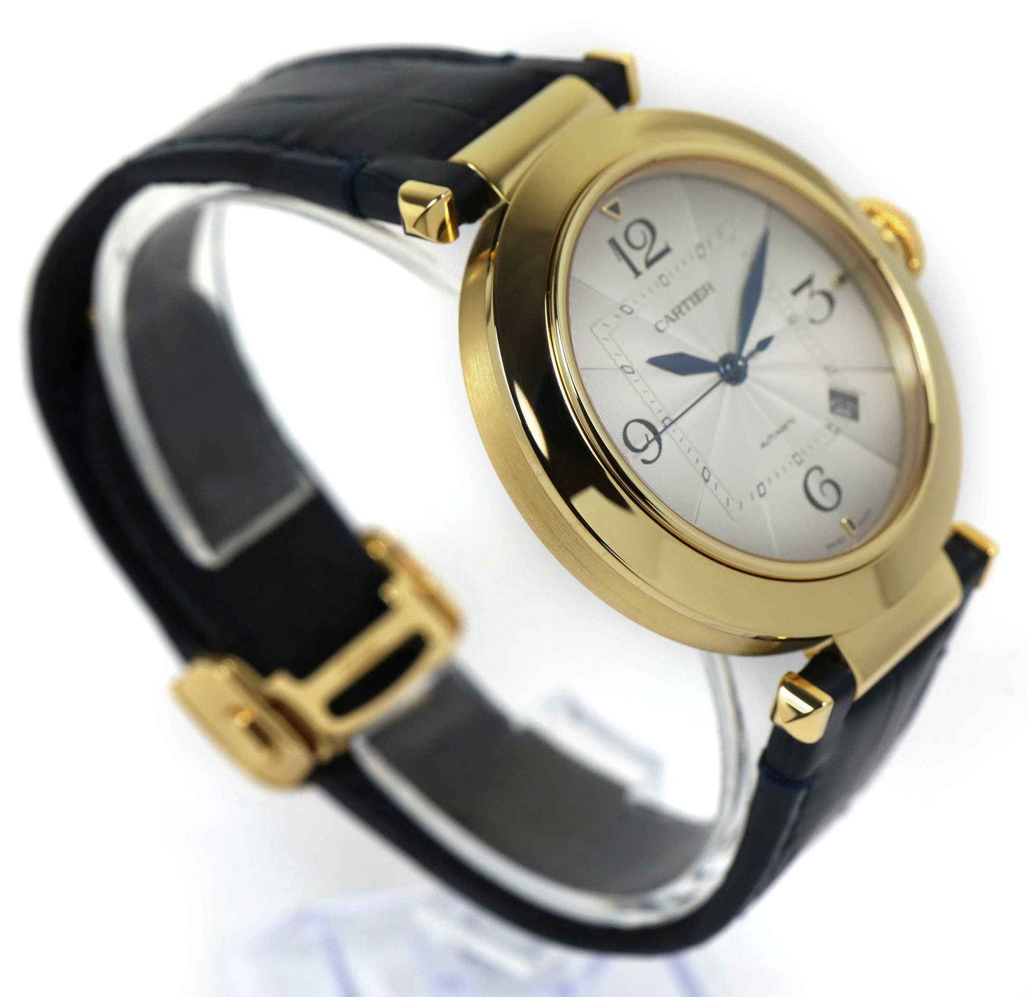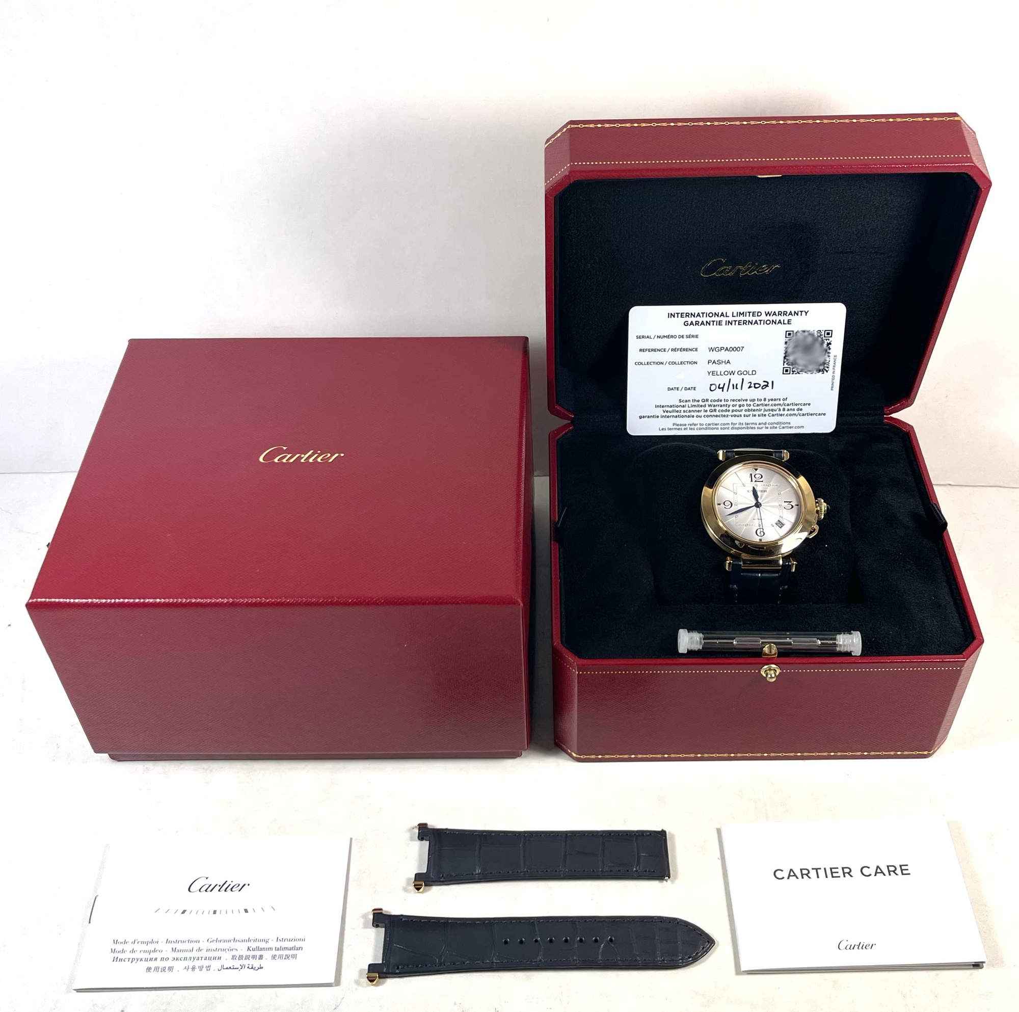 Read Morethis cartier watch is in 99% lnib condition. The warranty card is dated in 2021 and the customer never wore the watch. If looking at the watch super closely, you may find a tiny speck of handling wear, but the watch is in 99% condition and the strap shows zero wear. It comes with its box, papers, one additional leather strap, cartier tool, and warranty card dated april 11th, 2021 as shown in the pictures attached. This watch features a 41mm 18k yellow gold case that surrounds a silver dial and comes on a blue cartier leather strap. This watch is in stock and available to ship immediately!