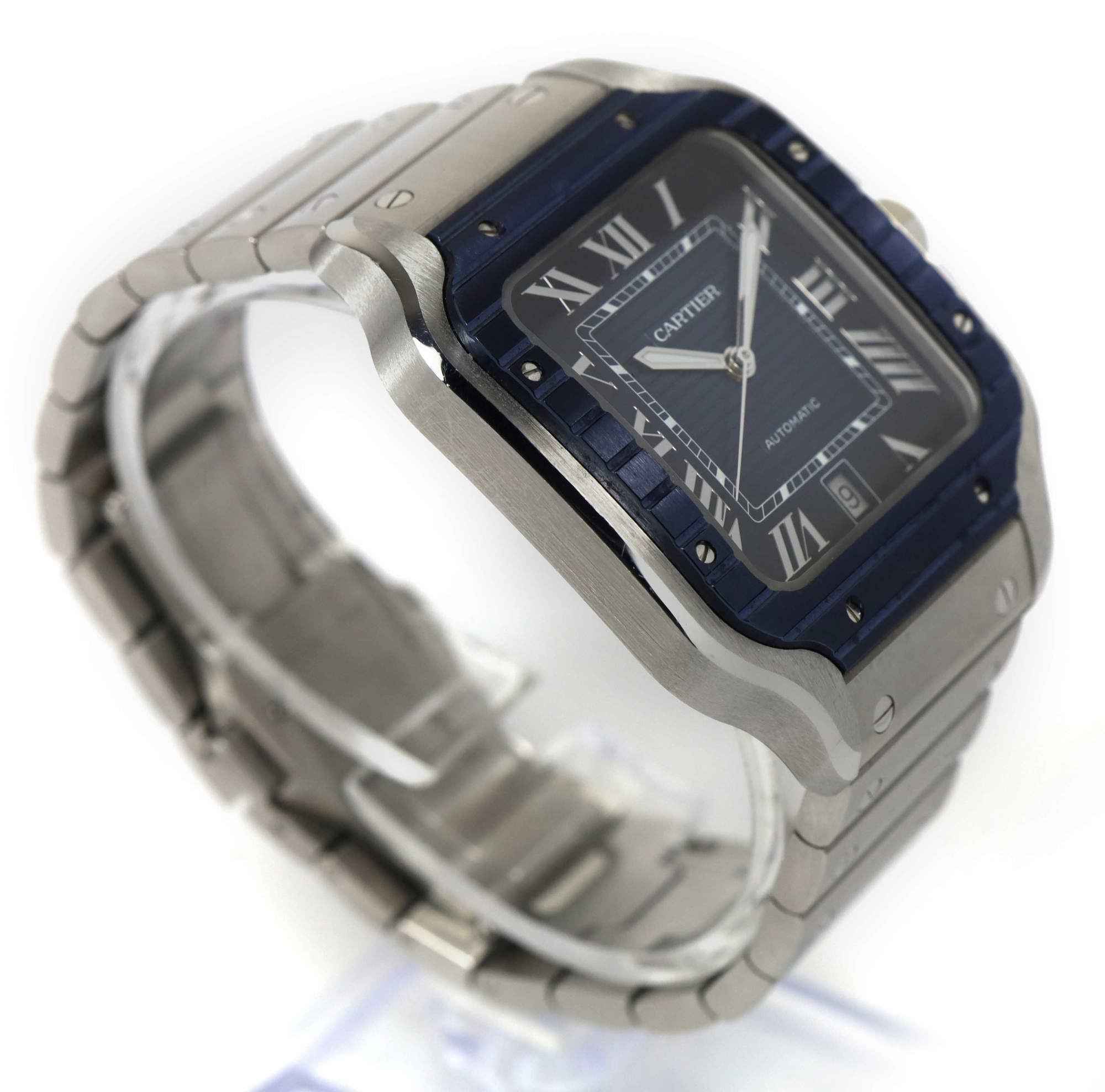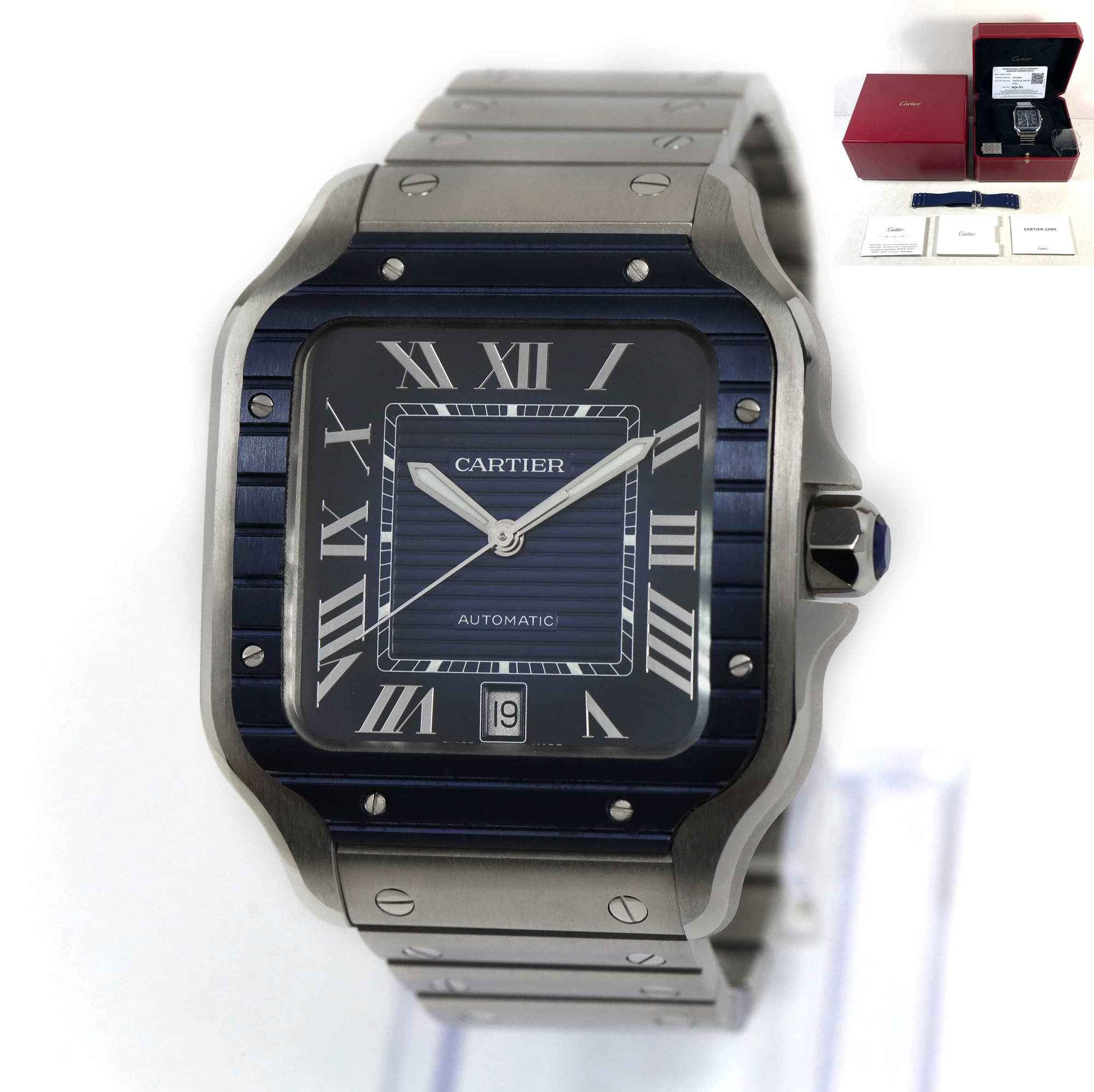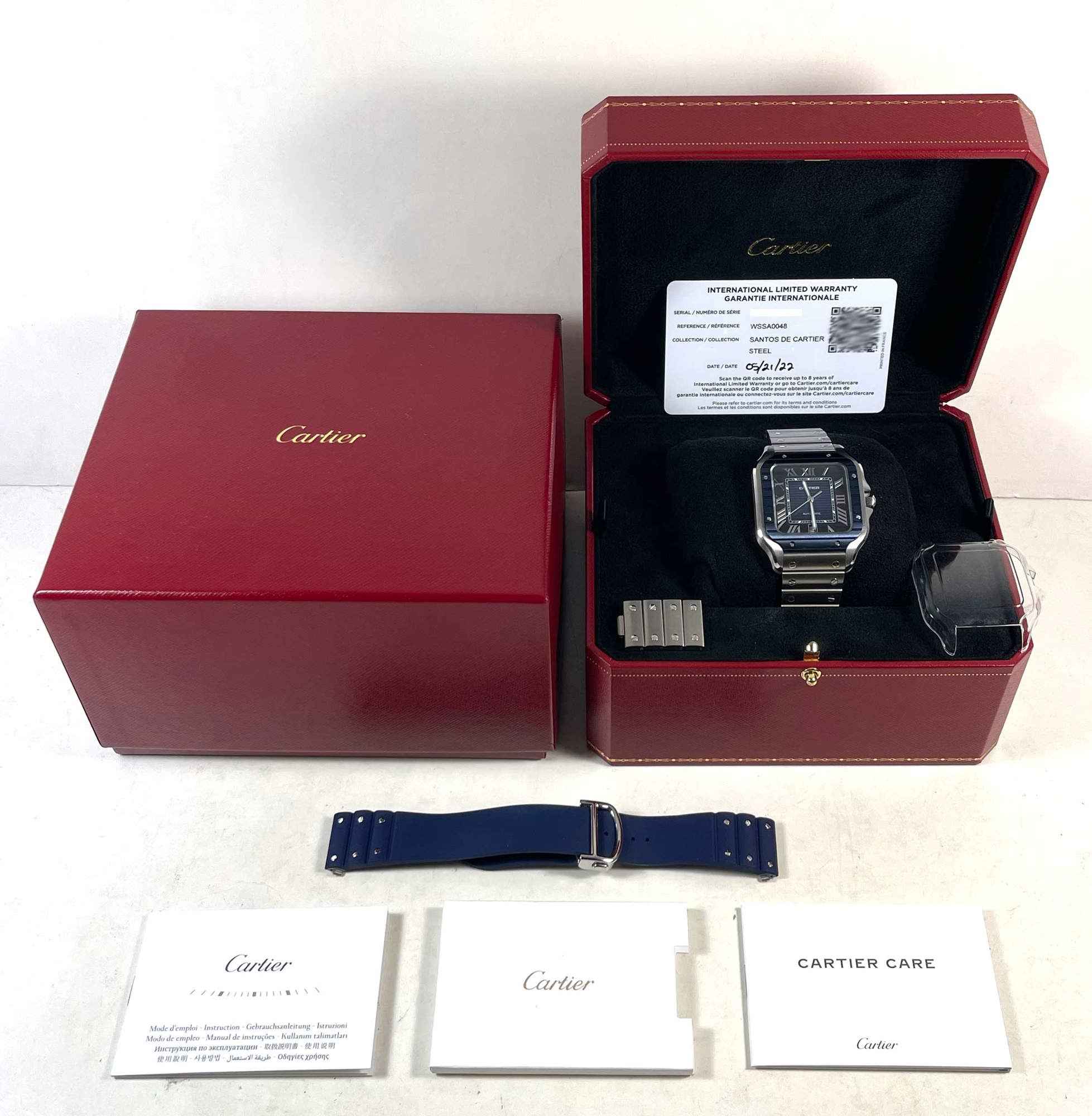THIS CARTIER SANTOS IS IN EXCELLENT OVERALL CONDITION AND COMES WITH ITS BOX, PAPERS, BEZEL PROTECTOR, SPARE LINKS, ONE ADDITIONAL BLUE RUBBER STRAP, AND WARRANTY CARD DATED MY 21ST, 2022 AS SHOWN IN THE PICTURES ATTACHED. THIS WATCH IS IN STOCK AND AVAILAB...