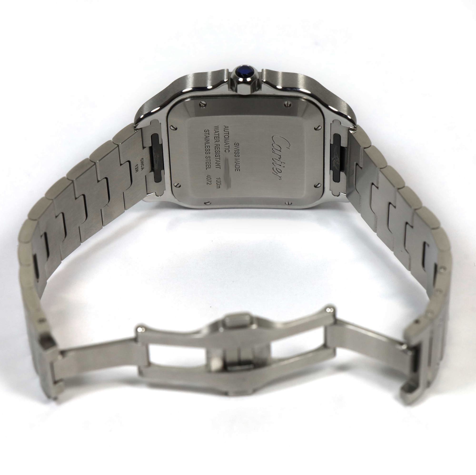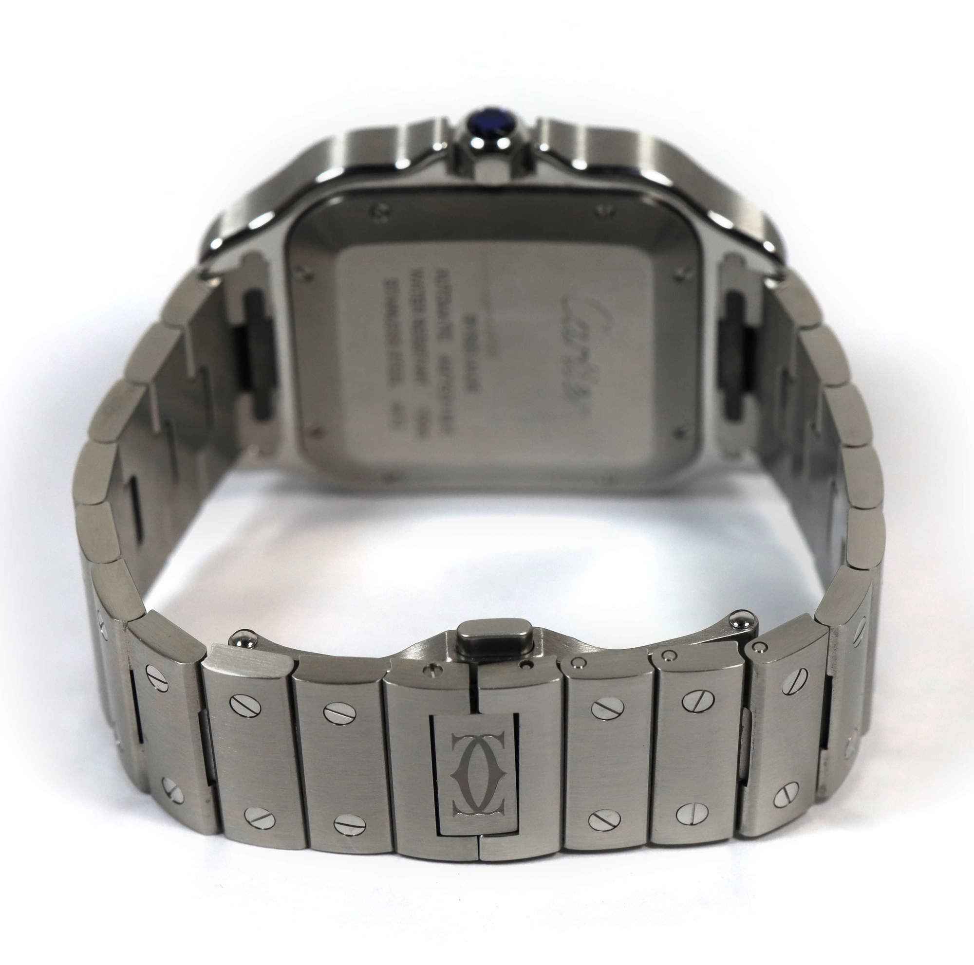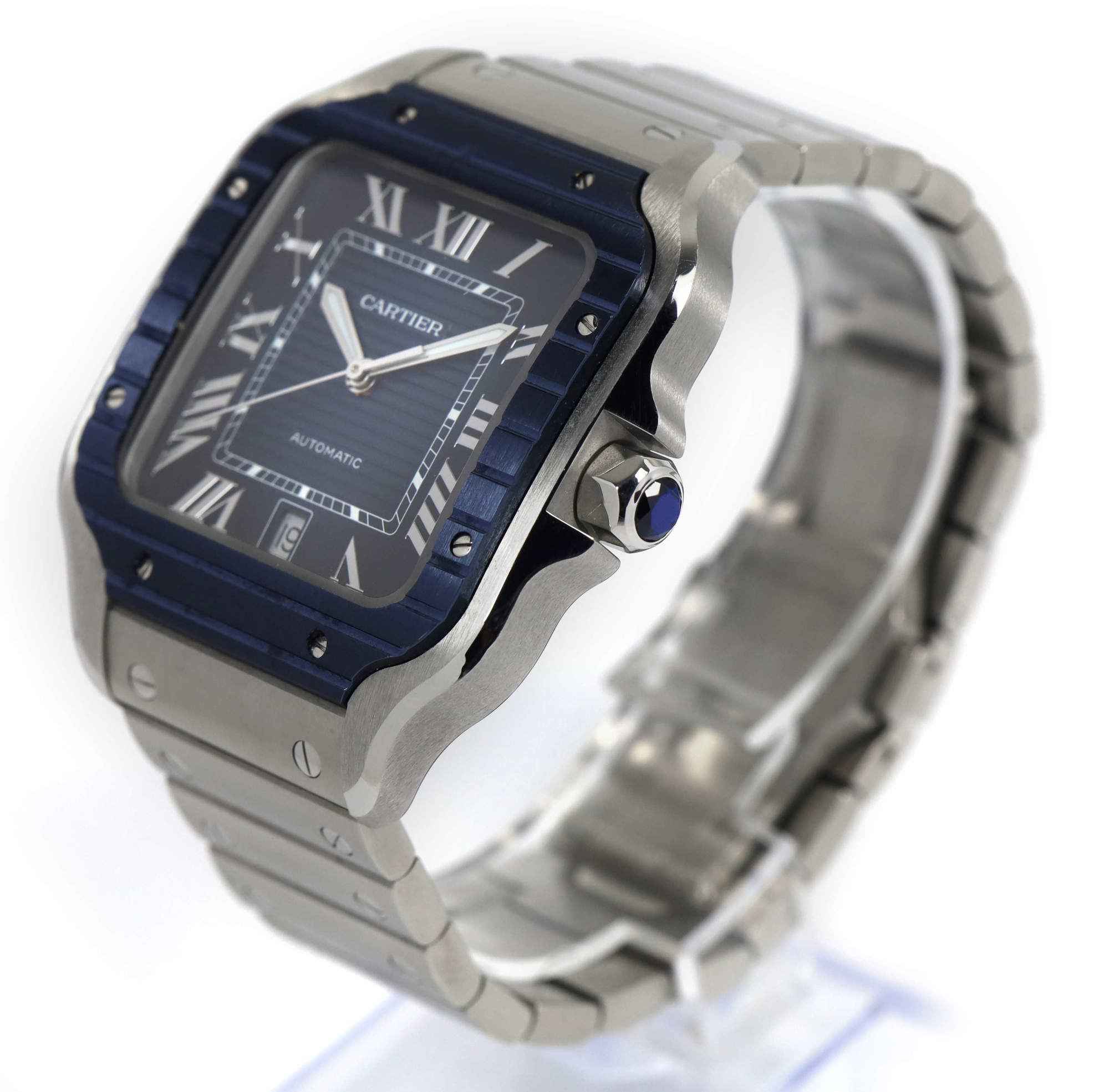 THIS CARTIER SANTOS IS IN EXCELLENT OVERALL CONDITION AND COMES WITH ITS BOX, PAPERS, BEZEL PROTECTOR, SPARE LINKS, ONE ADDITIONAL BLUE RUBBER STRAP, AND WARRANTY CARD DATED MY 21ST, 2022 AS SHOWN IN THE PICTURES ATTACHED. THIS WATCH IS IN STOCK AND AVAILAB...