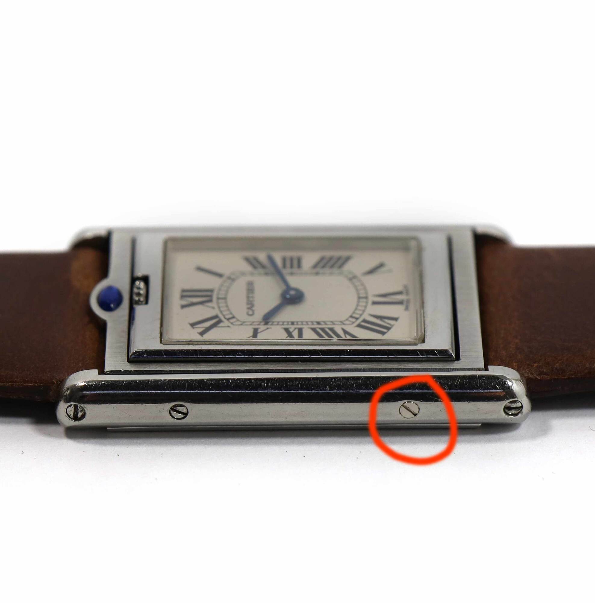 Read Morethis cartier is in great overall condition showing some normal signs of wear for a preowned watch. This comes as watch only as shown in the pictures attached. The band on this watch is brand new/unworn but is aftermarket with an original cartier tang buckle. The case has one aftermarket screw on the side as shown in the pictures circled in red. This watch is in stock and available to ship immediately!