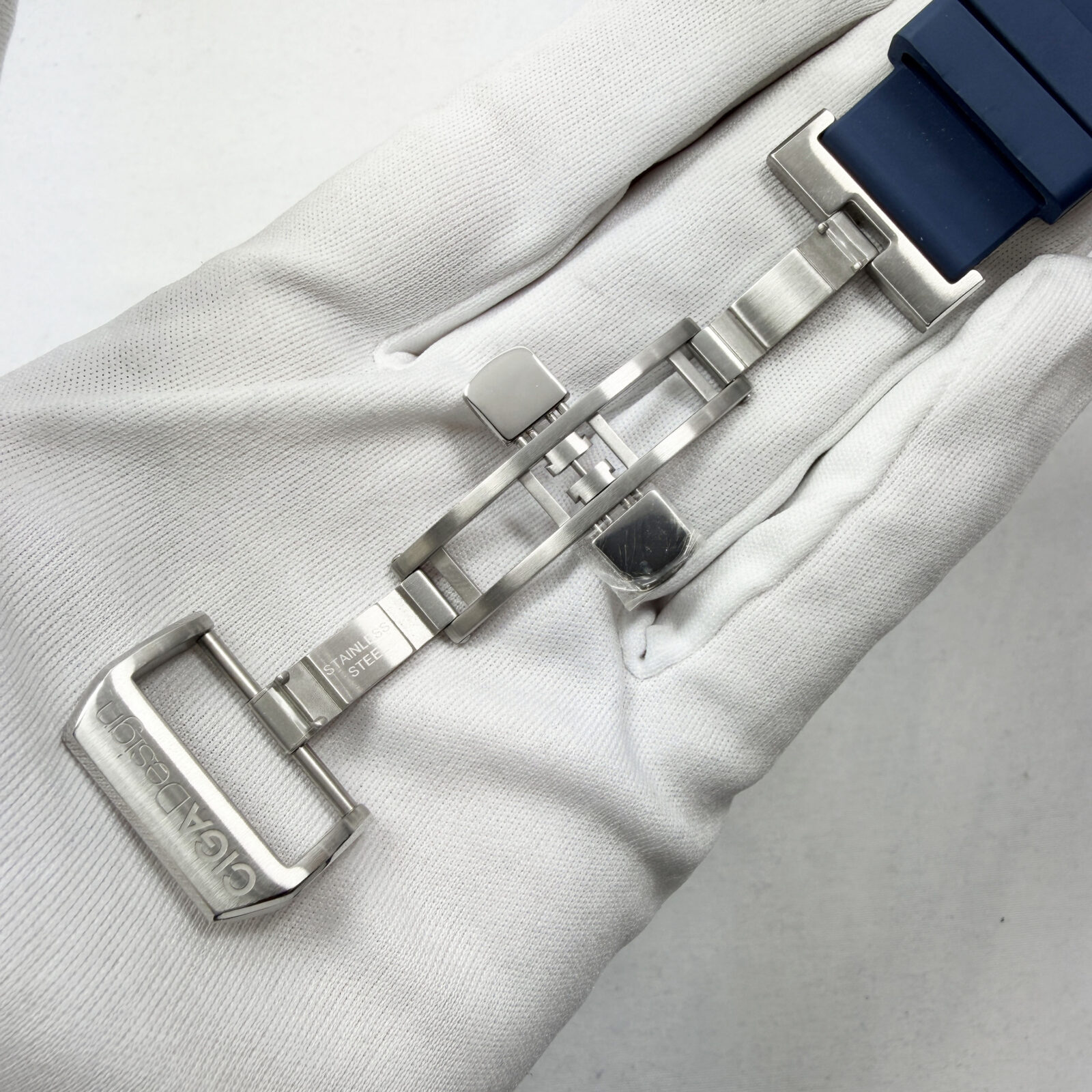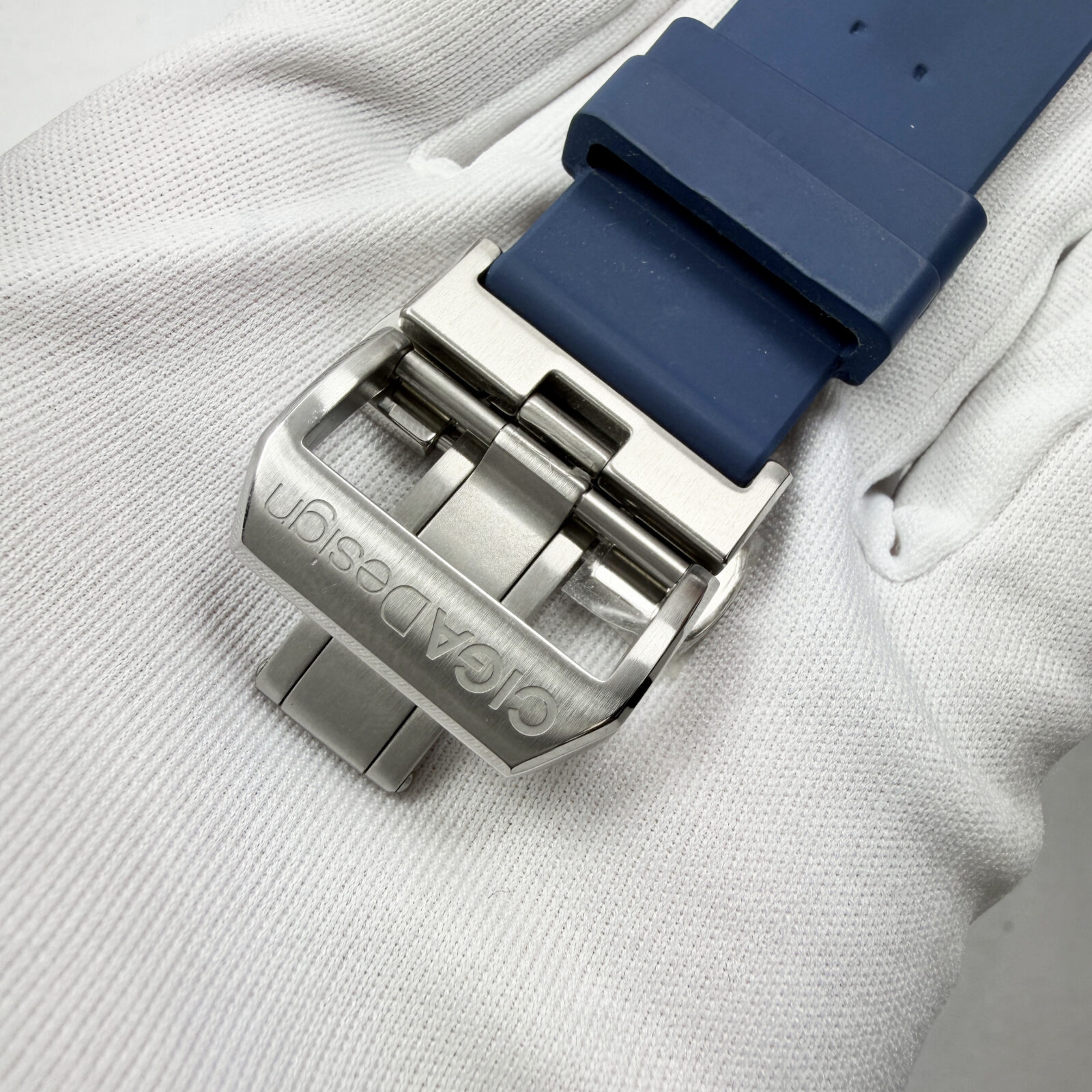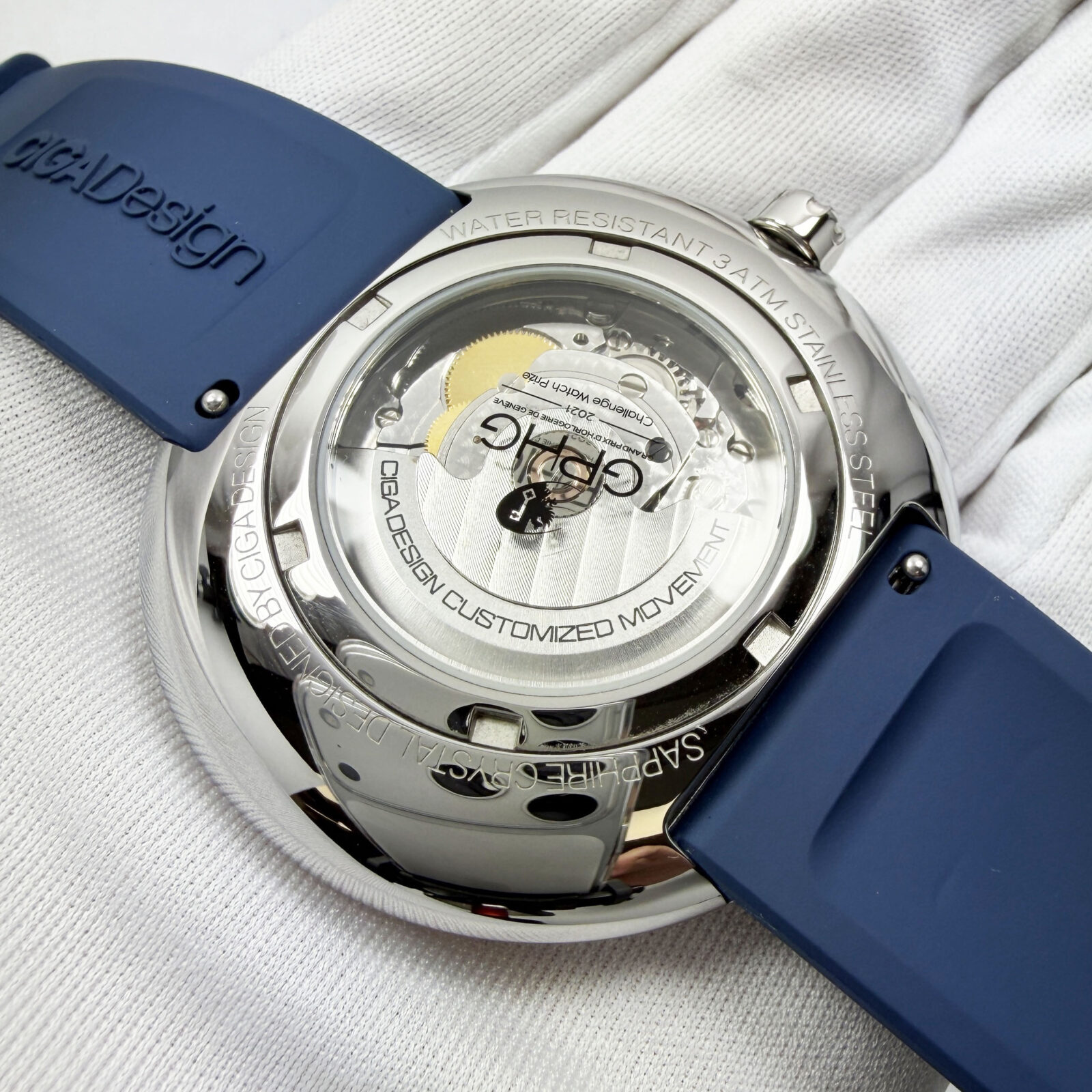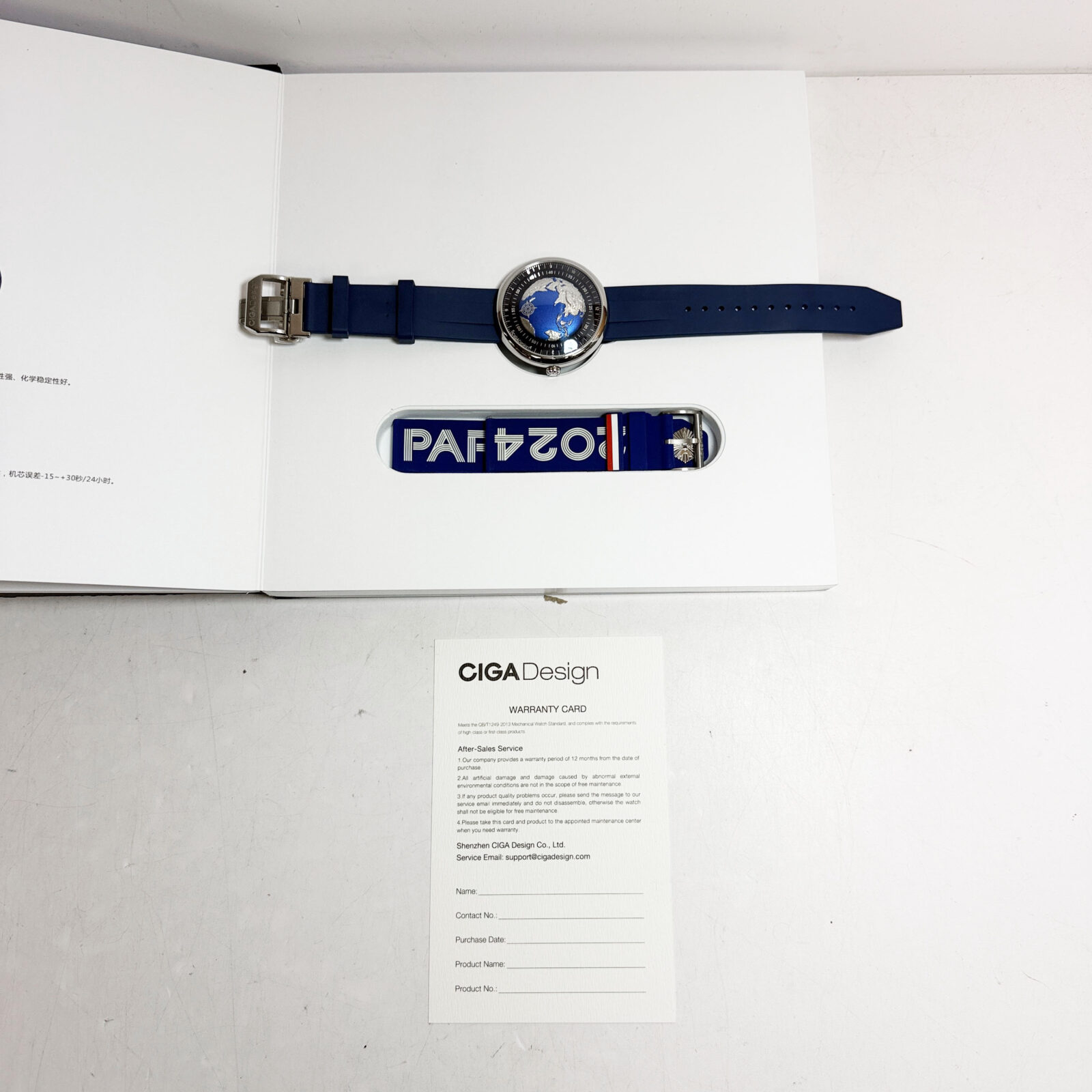 This Ciga Design watch comes with its box, extra straps, and warranty paper. The photos shown are of the exact watch being sold and accurately represent its condition. This watch is in stock and ready to ship immediately!