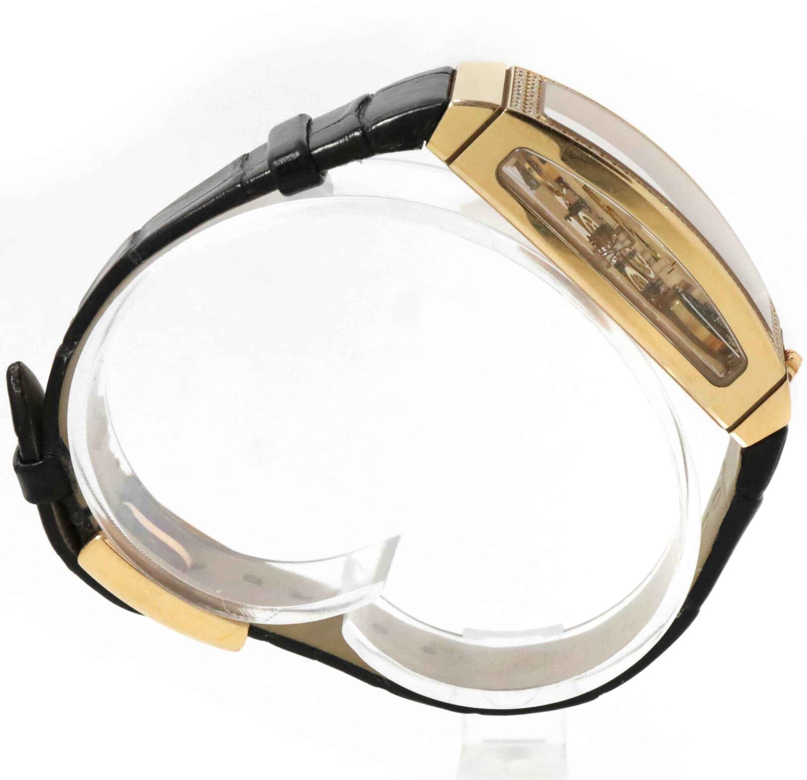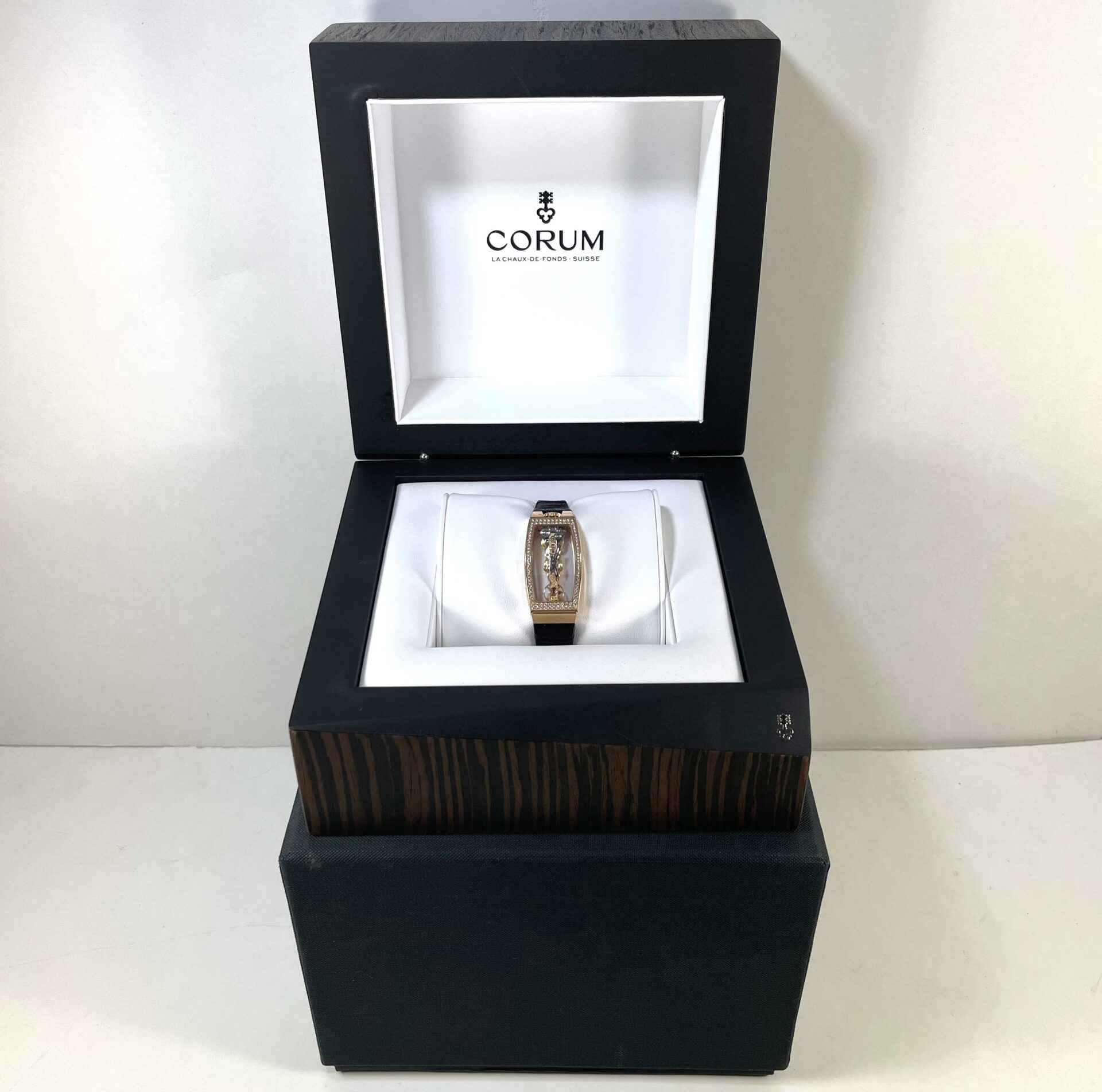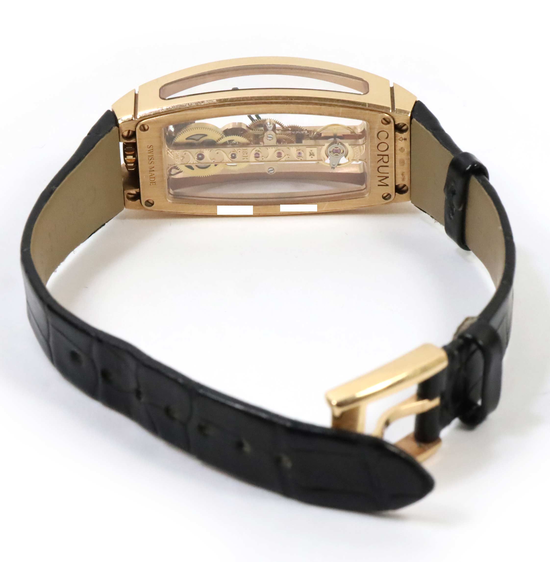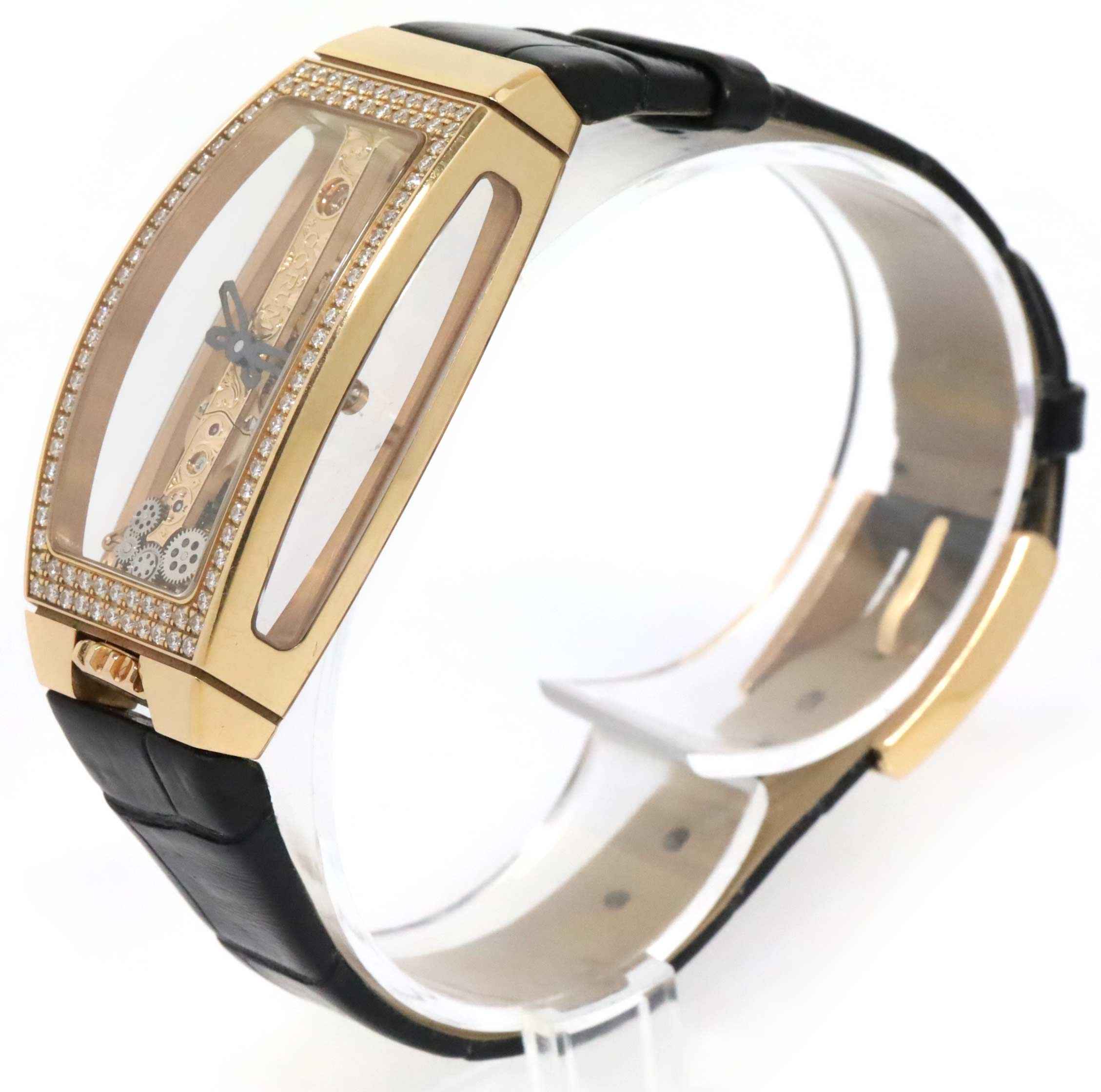Read Morethis corum watch is in excellent condition and comes with its inner and outer box only. This watch features a rose gold case with a diamond bezel surrounding a skeleton dial on a black alligator strap with an 18k rose gold buckle. This watch is in stock and available to ship immediately!