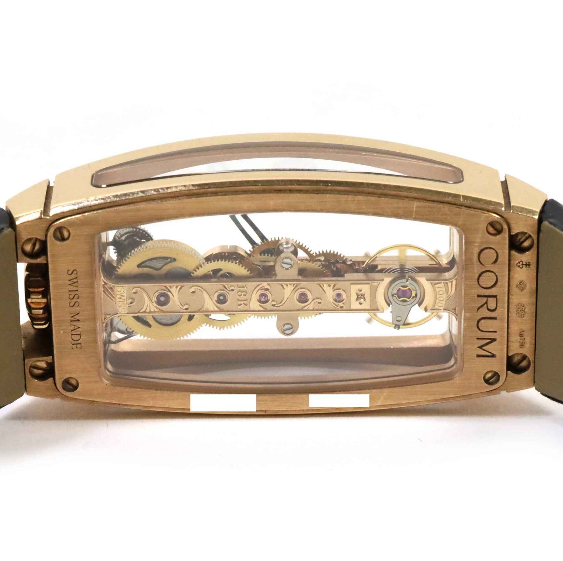 This Corum watch is in excellent condition and comes with its inner and outer box only. This watch features a rose gold case with a diamond bezel surrounding a skeleton dial on a black alligator strap with an 18k rose gol...