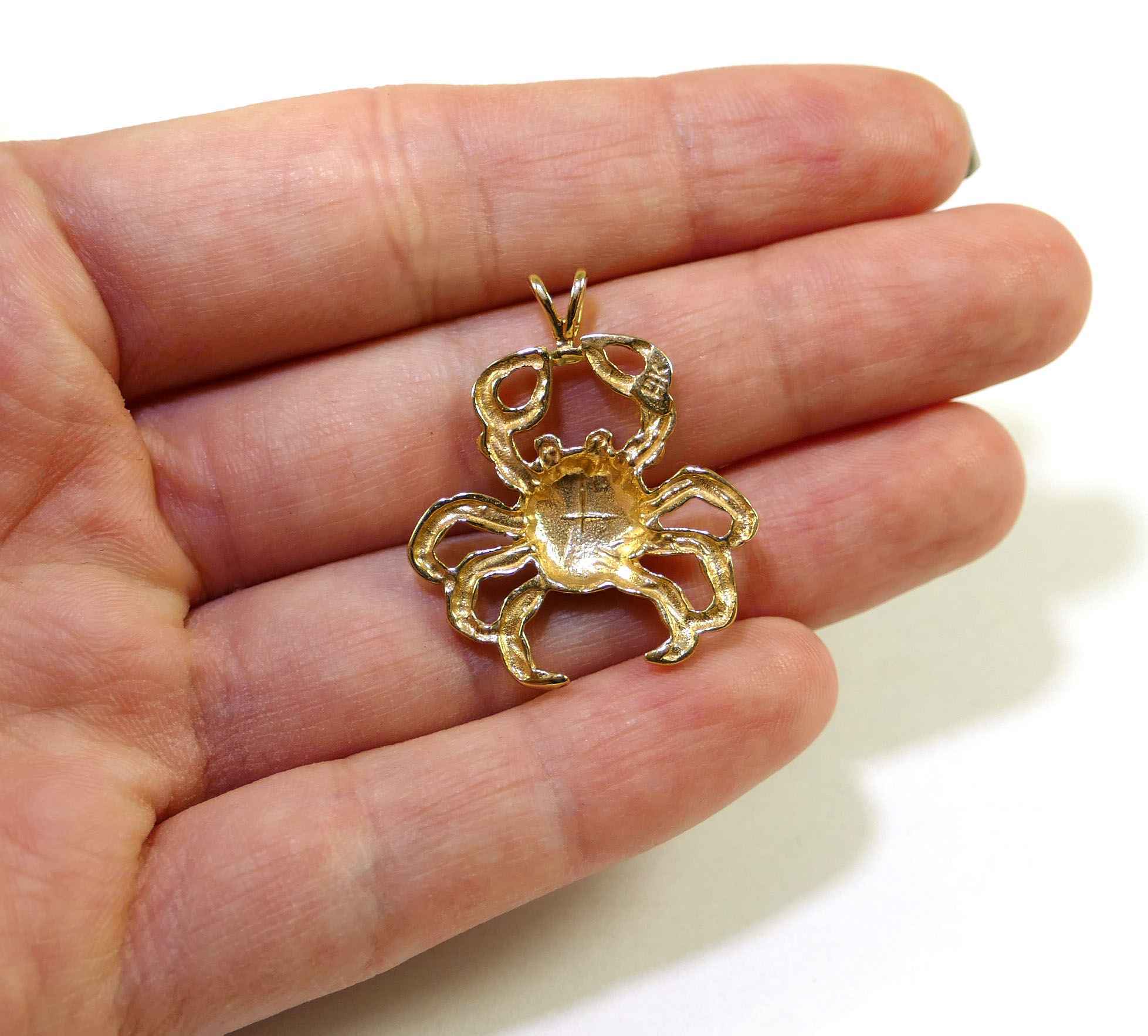 this crab pendant is detailed beautifully in 14k yellow gold, and has two red rubies as the eyes. This pendant does not come with a chain, so please feel free to contact us and we will find a perfect chain for your style and budget!