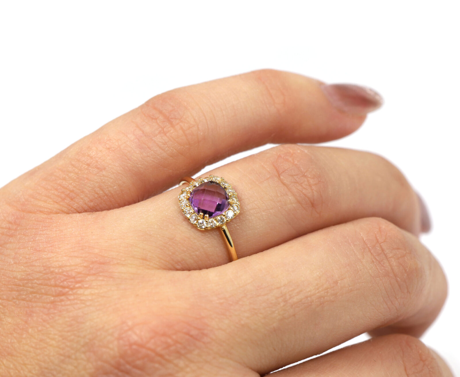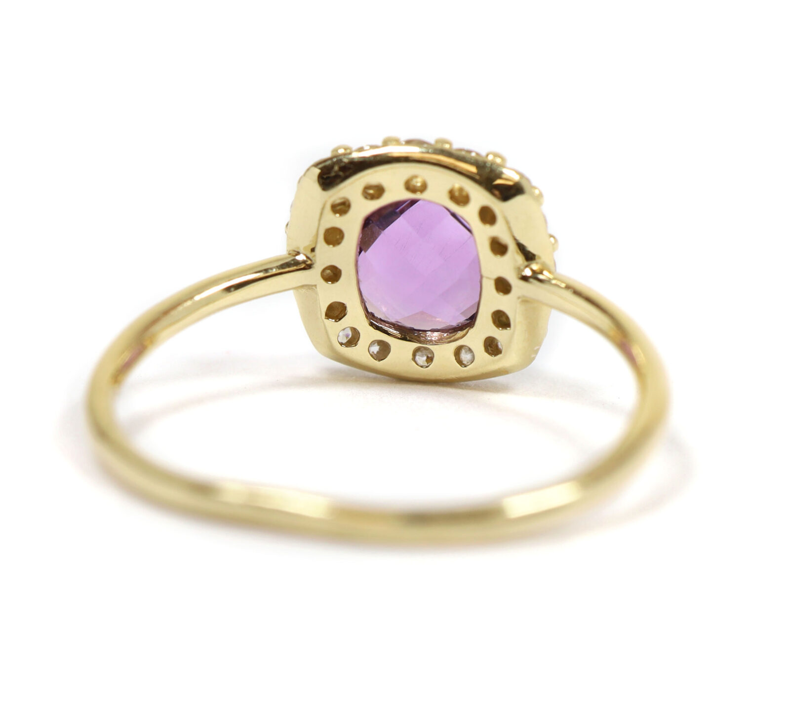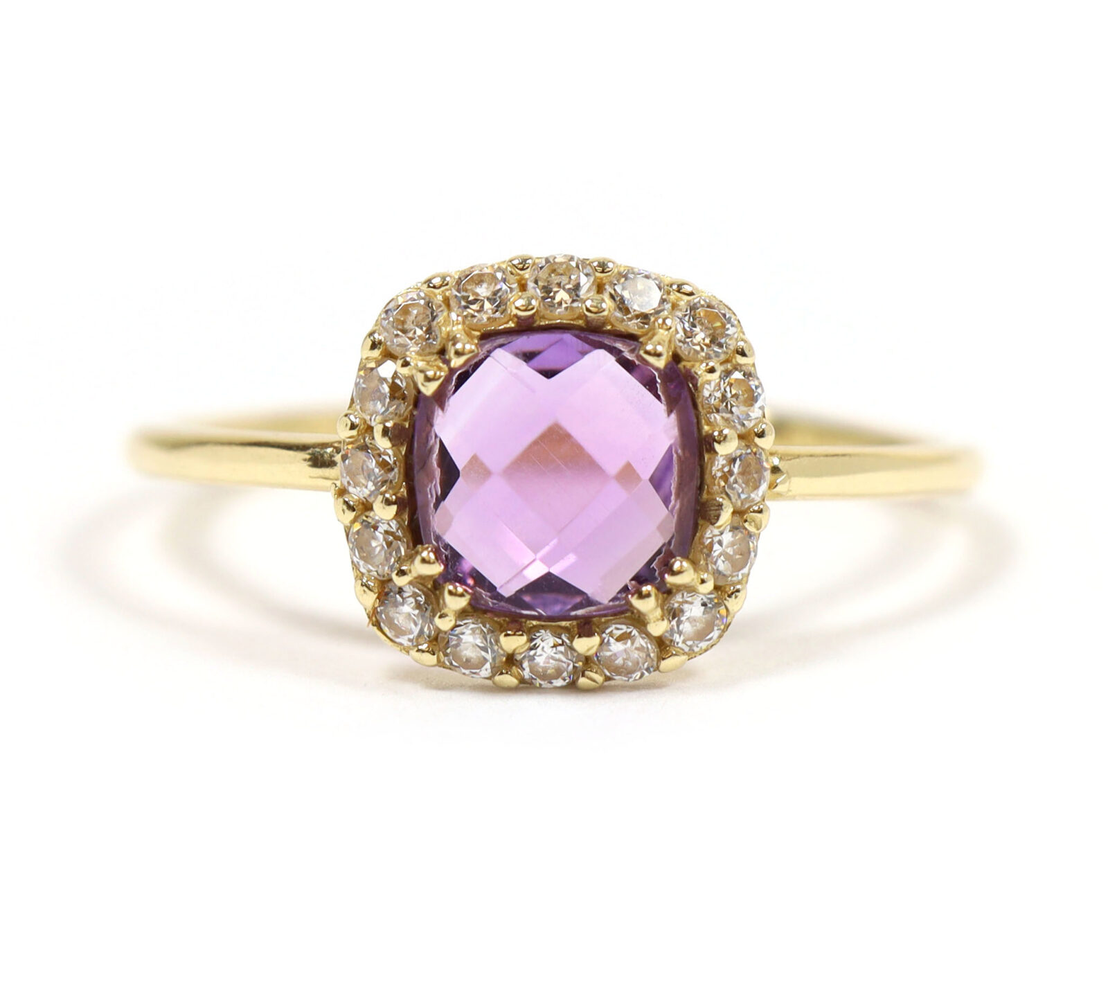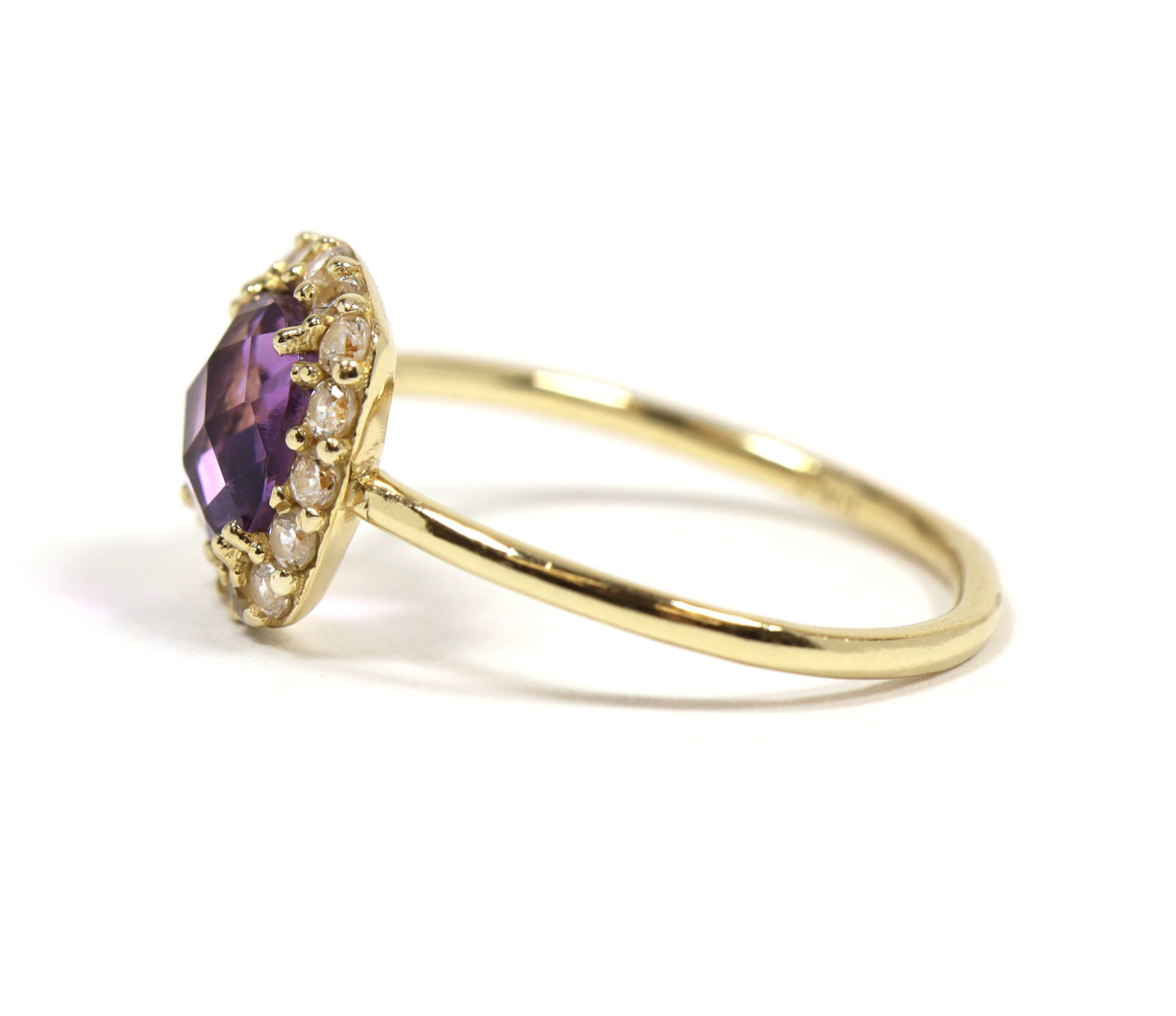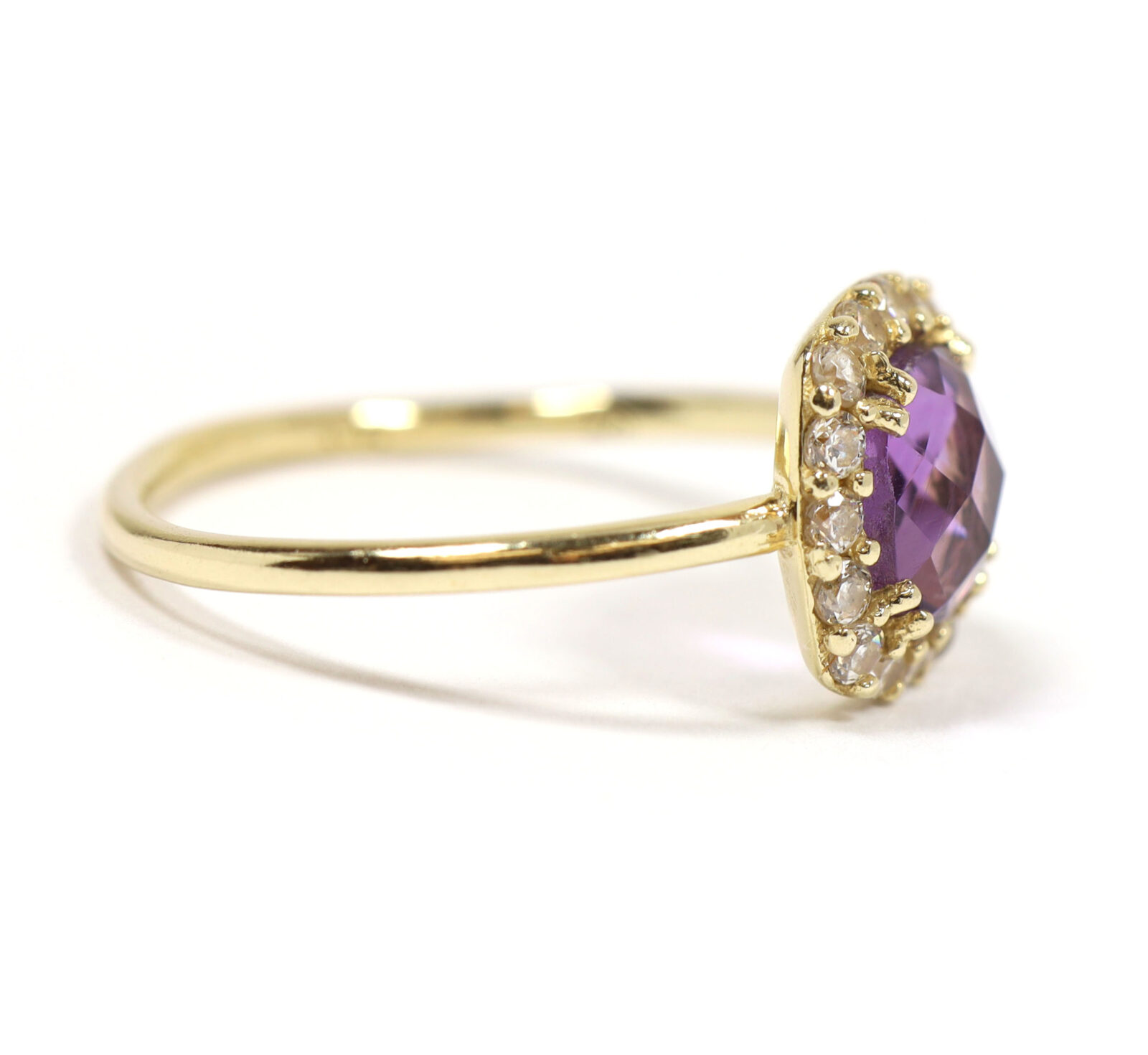 Read Moremetal: 14k yellow gold gemstone: amethyst and diamond ring size: 5 band width: 1mm center stone gemstone: amethyst cut: rose cut cushion center stone measurements: 6mm side stones gemstone: diamond cut: round side stone carat weight: approximately 0.32 carats total buy with confidence from tns diamonds, a trusted and established jeweler with a brick-and-mortar storefront and over 40 years of combined experience in the ethical watch and jewelry trade. At tns diamonds, we are proud to have trusted gia graduate gemologists on staff, ensuring that every piece of jewelry meets the highest standards of quality and craftsmanship. With our expertise and commitment to ethical practices, you can shop with peace of mind knowing you’re receiving a genuine product. If you have any questions or need further assistance, please don’t hesitate to reach out!