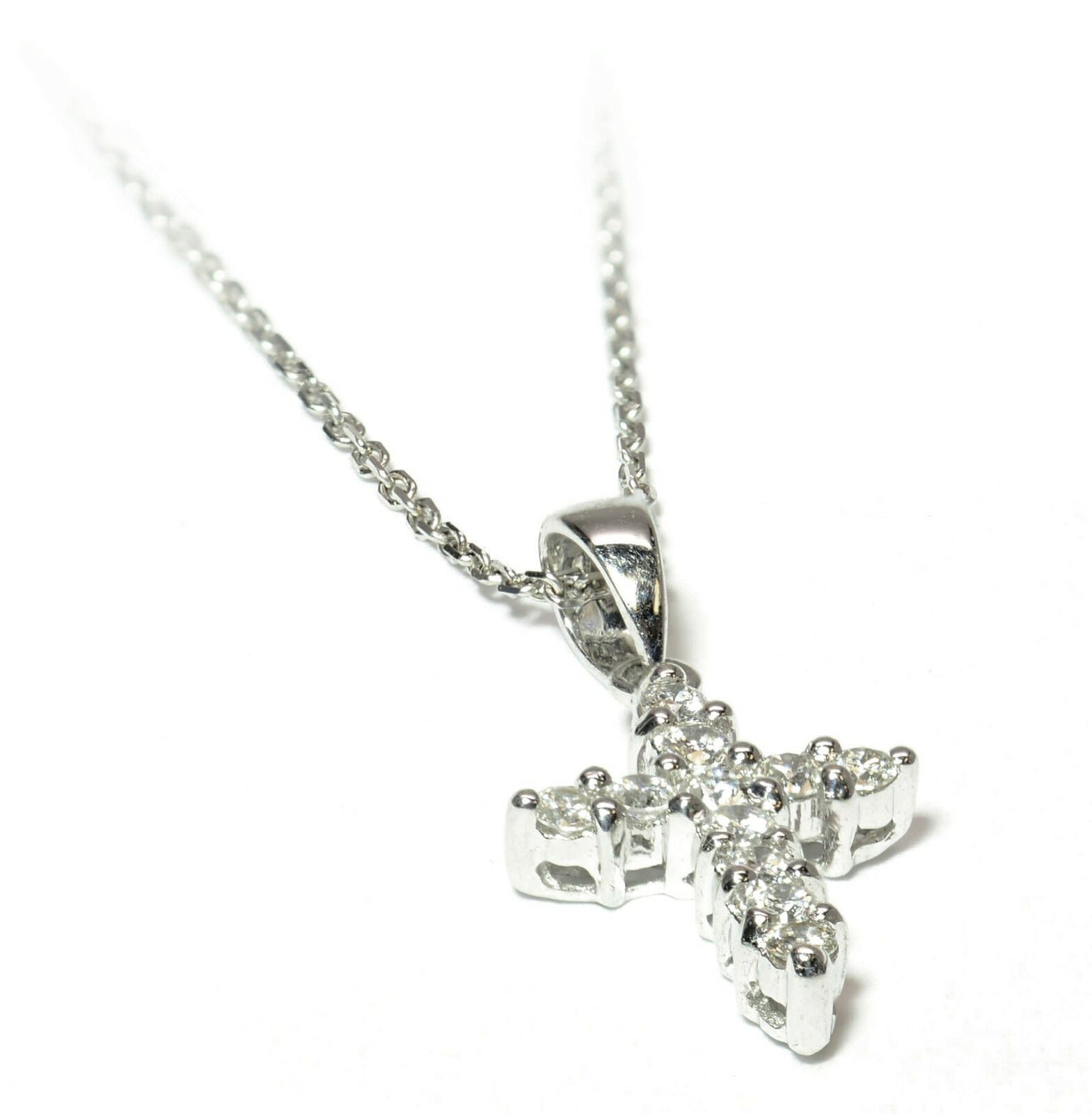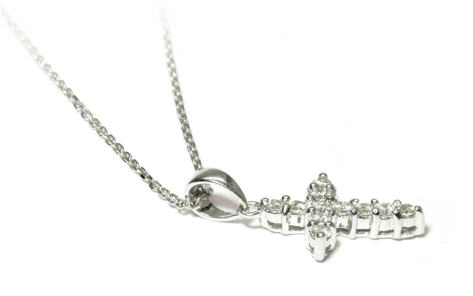 this cute cross pendant feautures 11 round diamonds of vs quality and f/g color. It hangs from an 18 inch gold necklace.