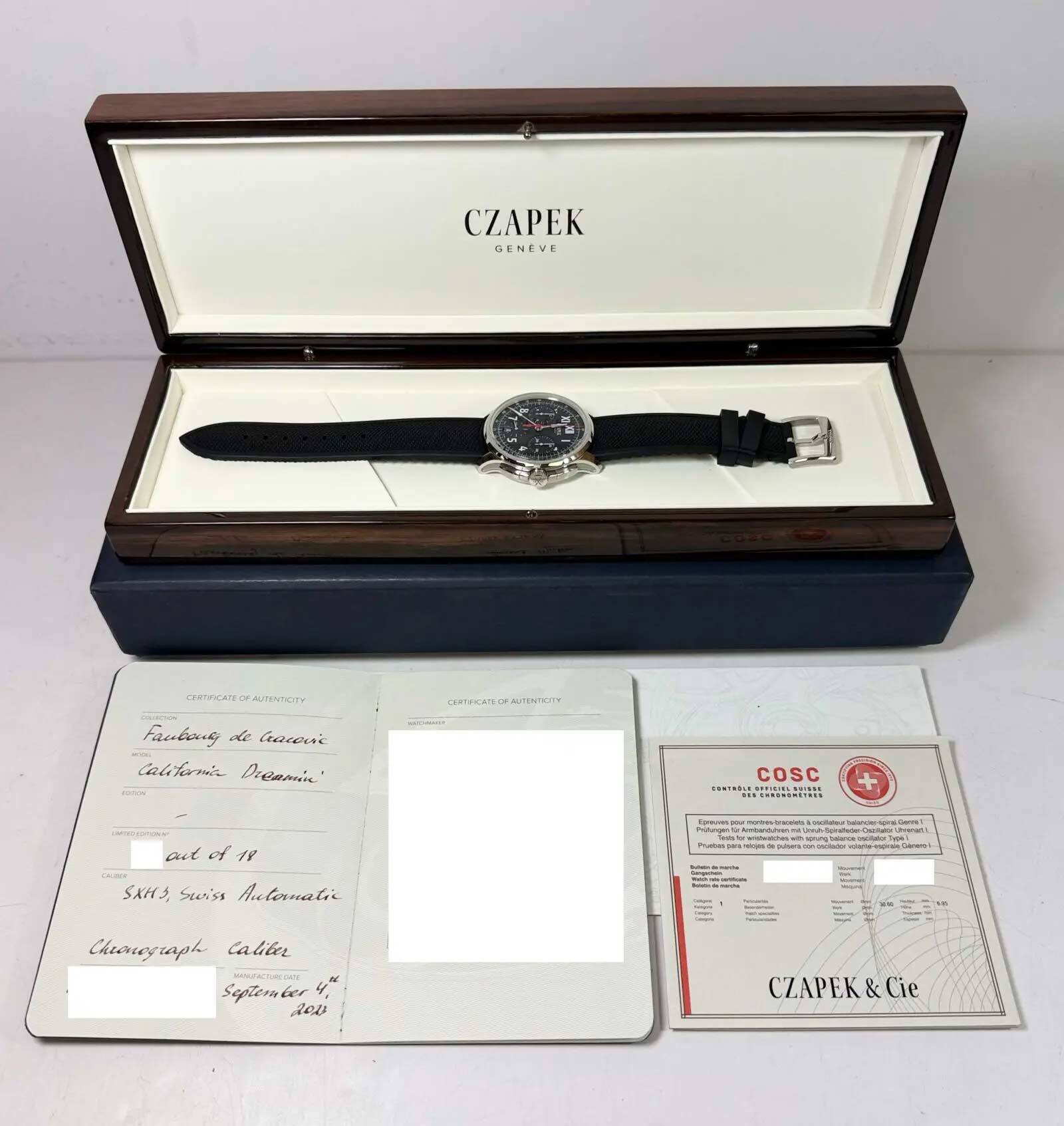 this czapek watch is in excellent overall condition showing some light signs of surface wear consistent with preowned watches. This comes with its box, booklets, and warranty paper dated september 4th, 2023 as shown in the pictures attached. This watch is part of a very limited edition with only 18 total pieces produced in this model. This watch is in stock and available to ship immediately!