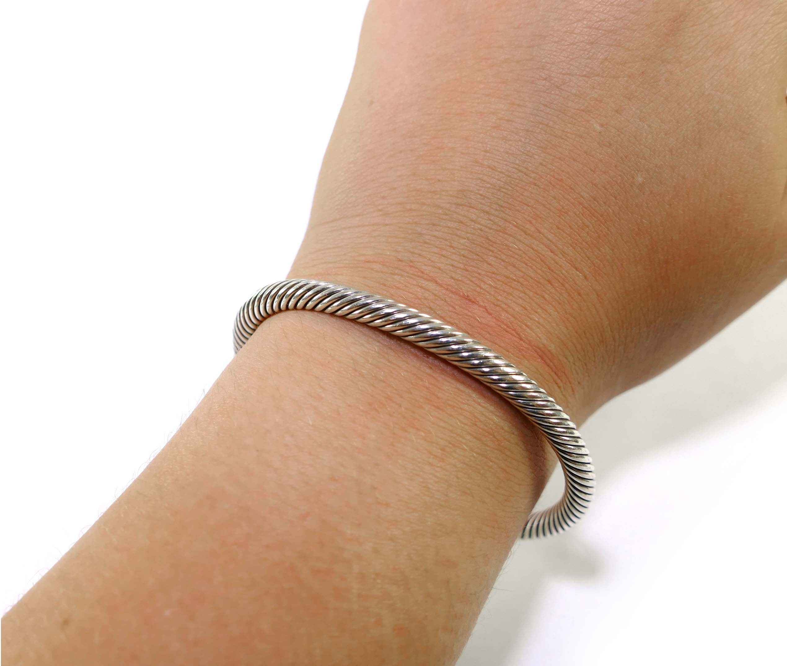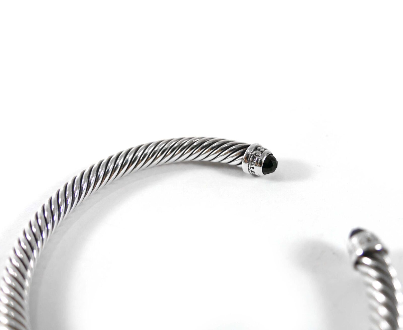 Product Description: This David Yurman Bangle Bracelet is made out of sterling silver in the style of their cable collection. There's a gap in between the ends, and the ends of the bracelet hold 2 black onyx st...