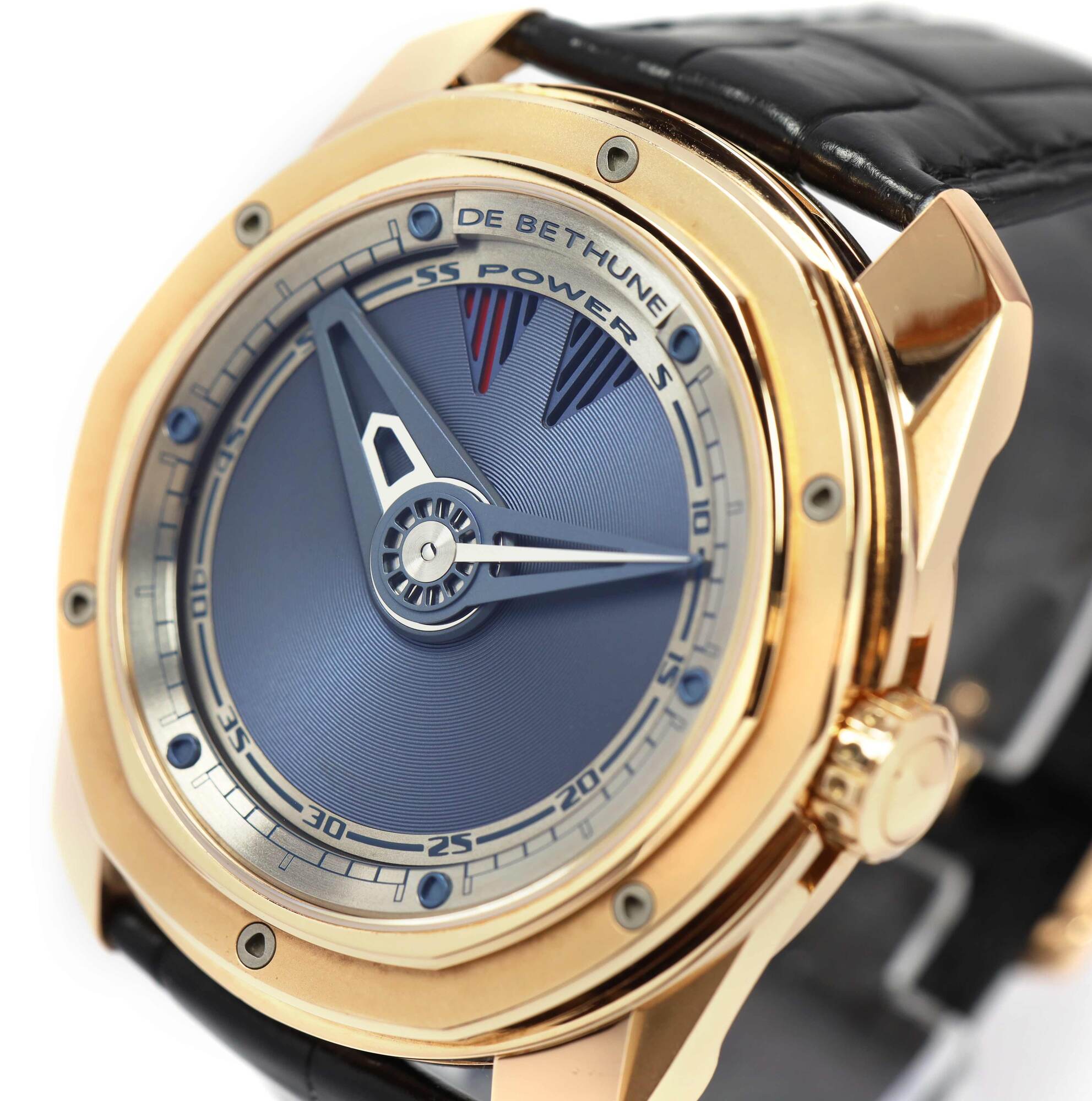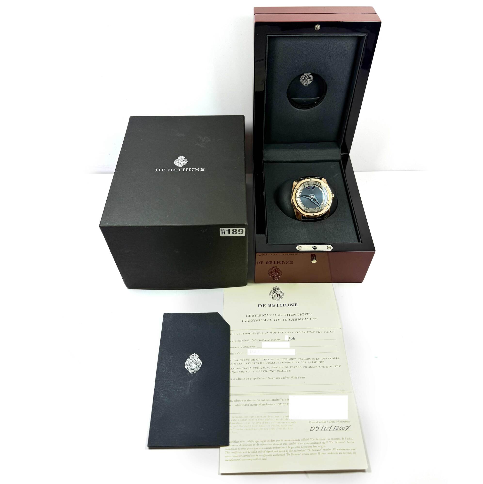 this de bethune watch is in mint overall condition for the age of the watch and comes with its box and warranty paper dated may 1st, 2007 as shown in the pictures attached. This watch is in stock and available to ship immediately!