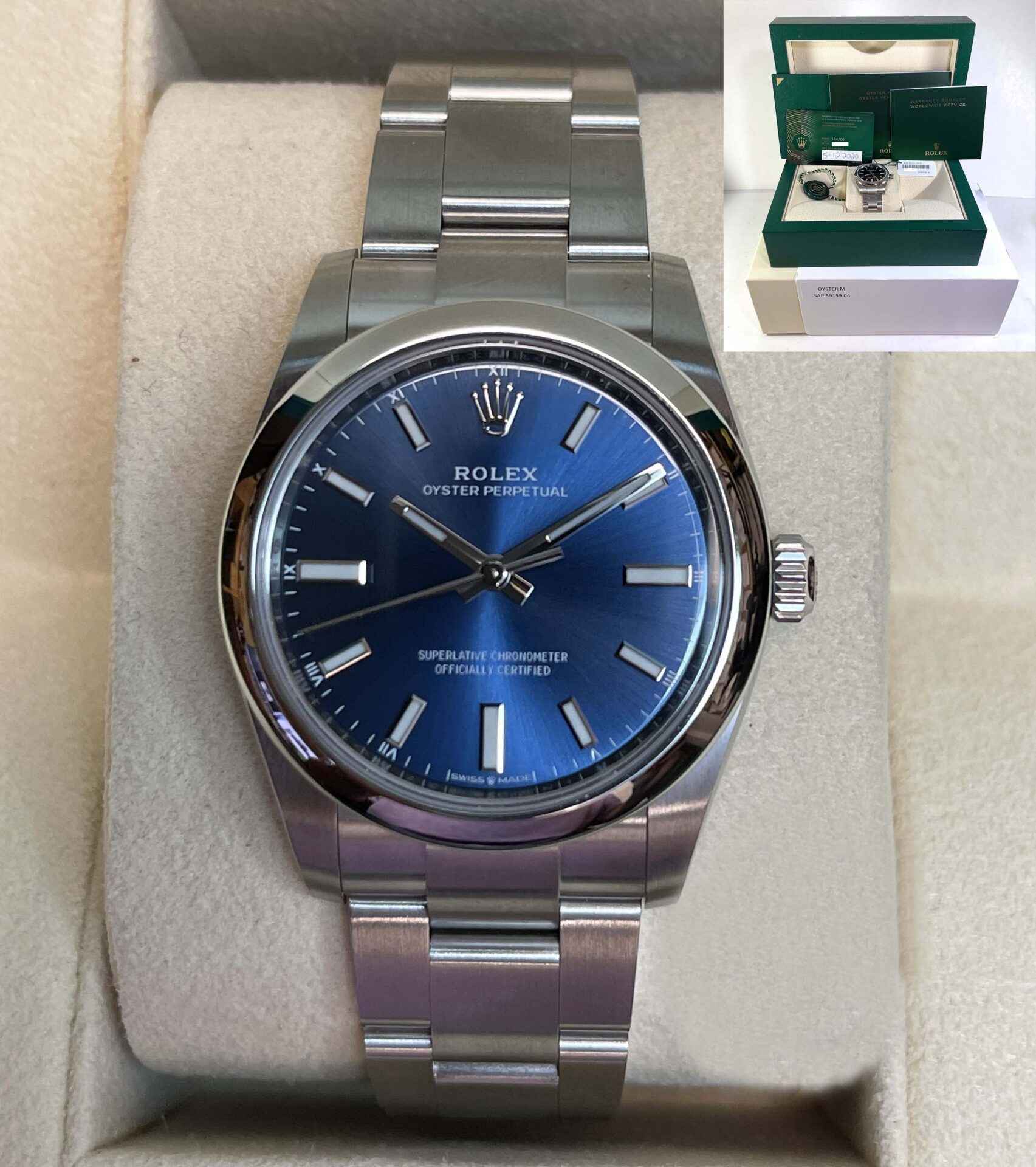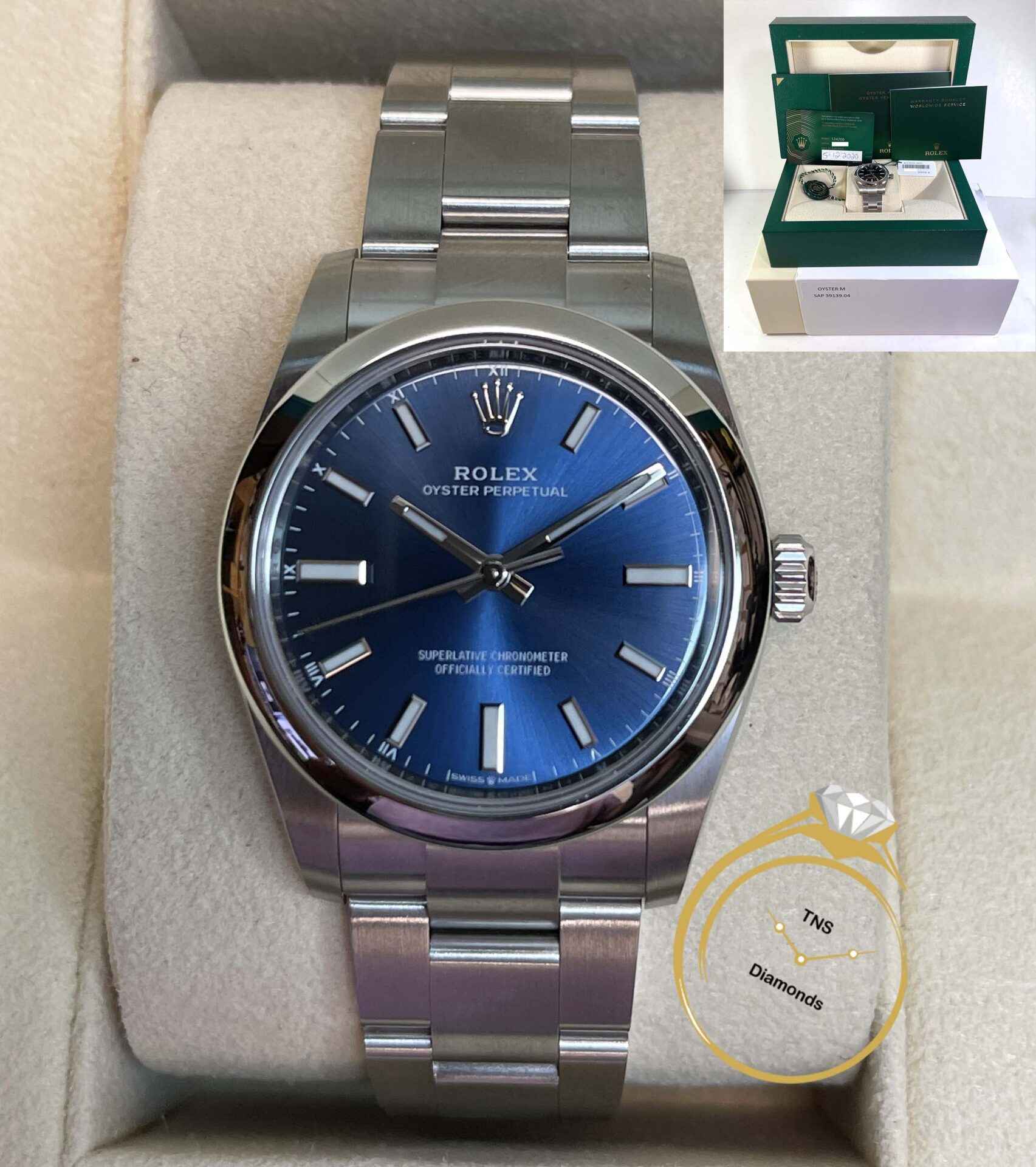 this watch is brand new and comes with its complete set of box, booklets, warranty card and hang tags. The warranty card is dated december 5th 2020, and has never been worn. The watch features a beautiful blue dial.