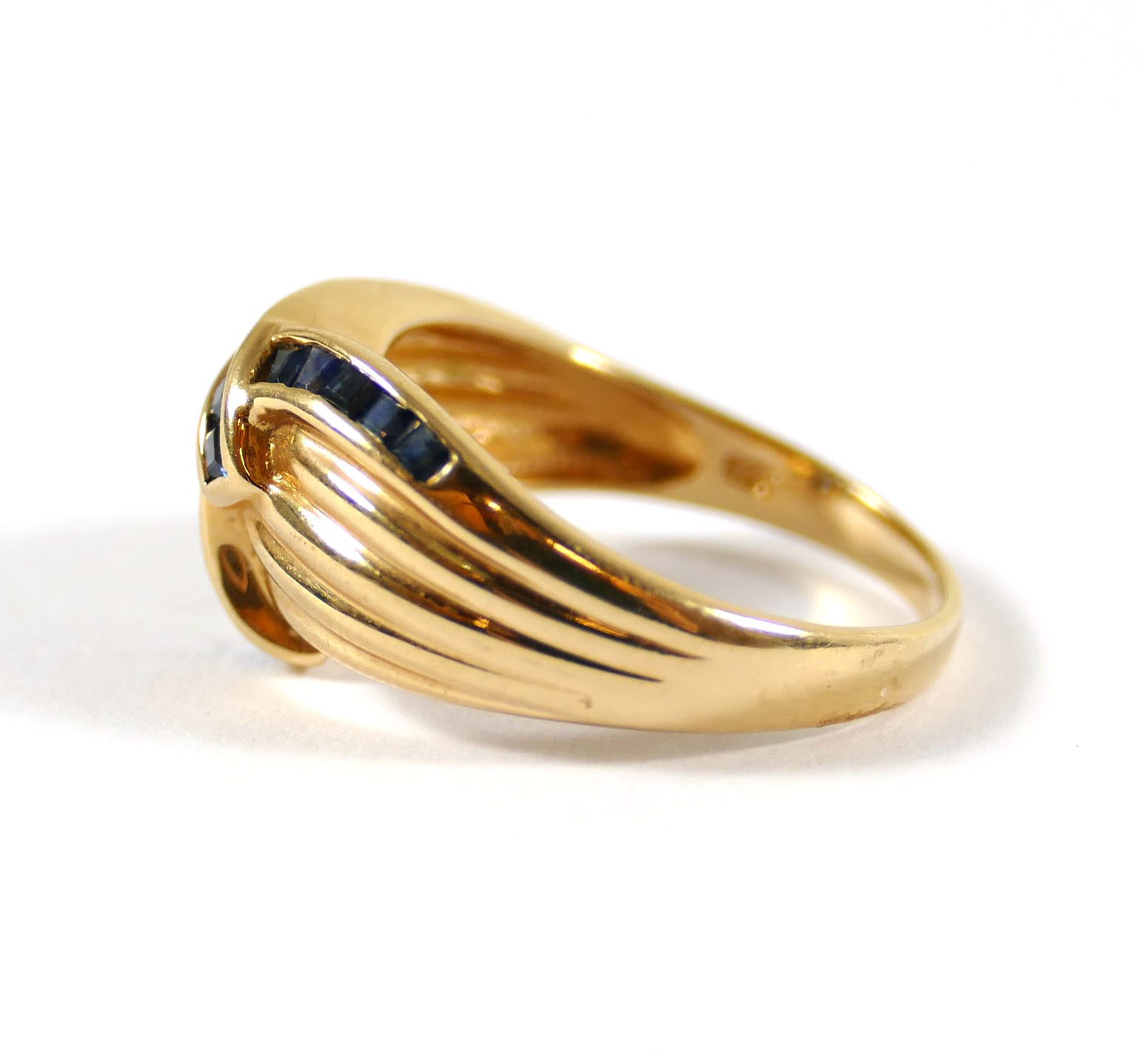 this ring holds deep blue sapphires, cut into baguettes. They are set into the ring to make a unique shape, right as the center piece of the 14k yellow gold. The gold has horizontal ridges on the sides of the center piece, accenting the blue sapphires and making them stand out!