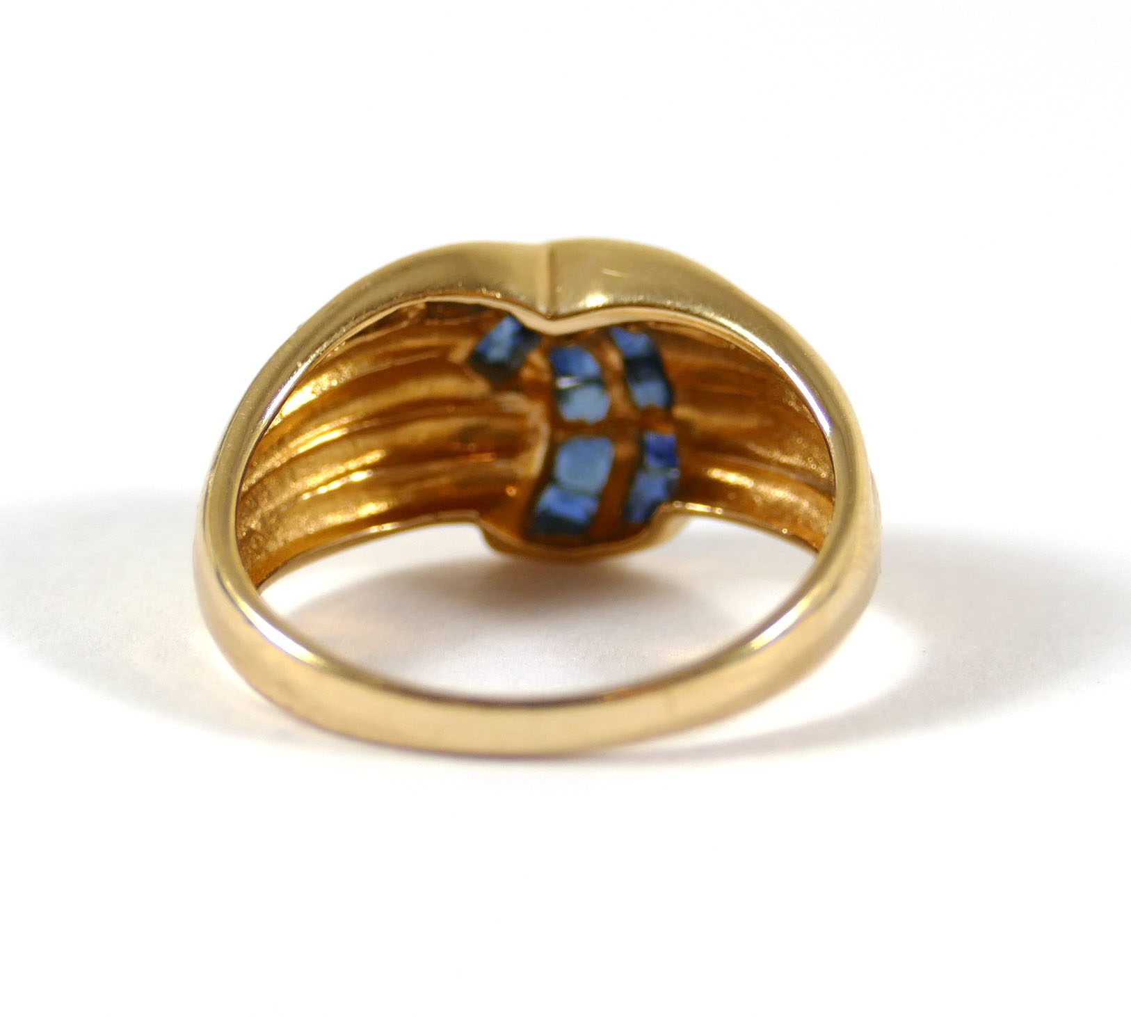 Product Description: This ring holds deep blue sapphires, cut into baguettes. They are set into the ring to make a unique shape, right as the center piece of the 14k yellow gold. The gold has horizontal ridges on the side...