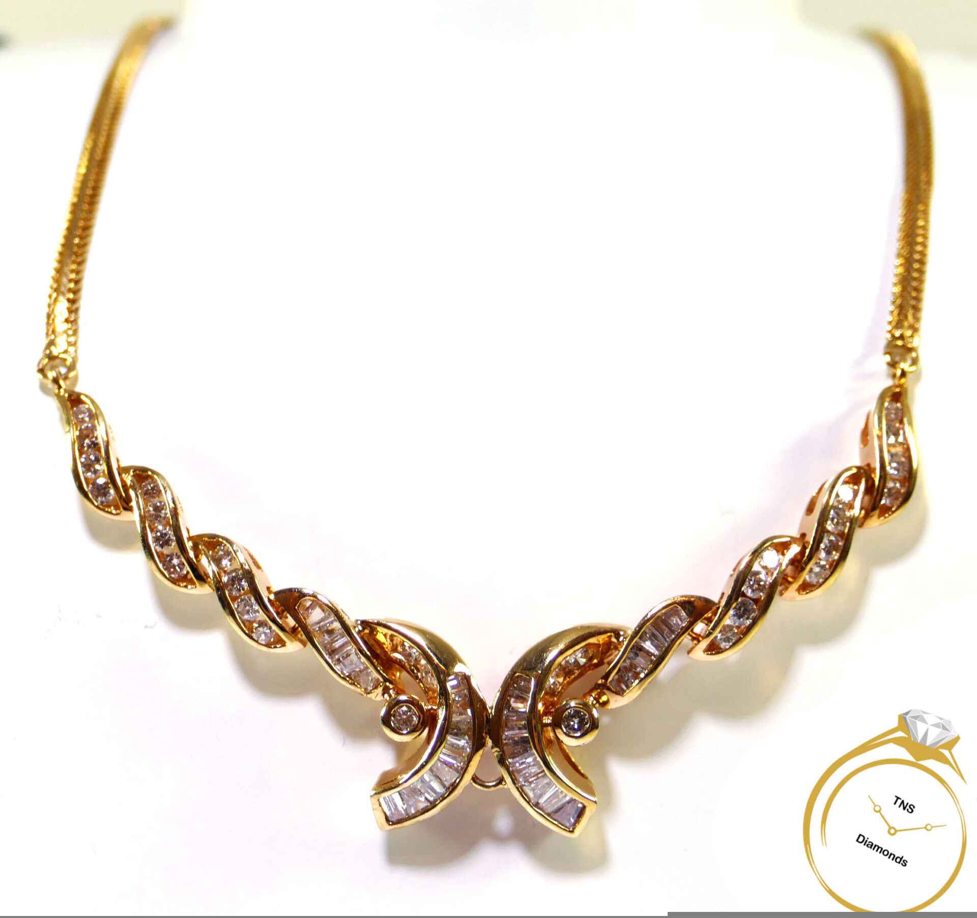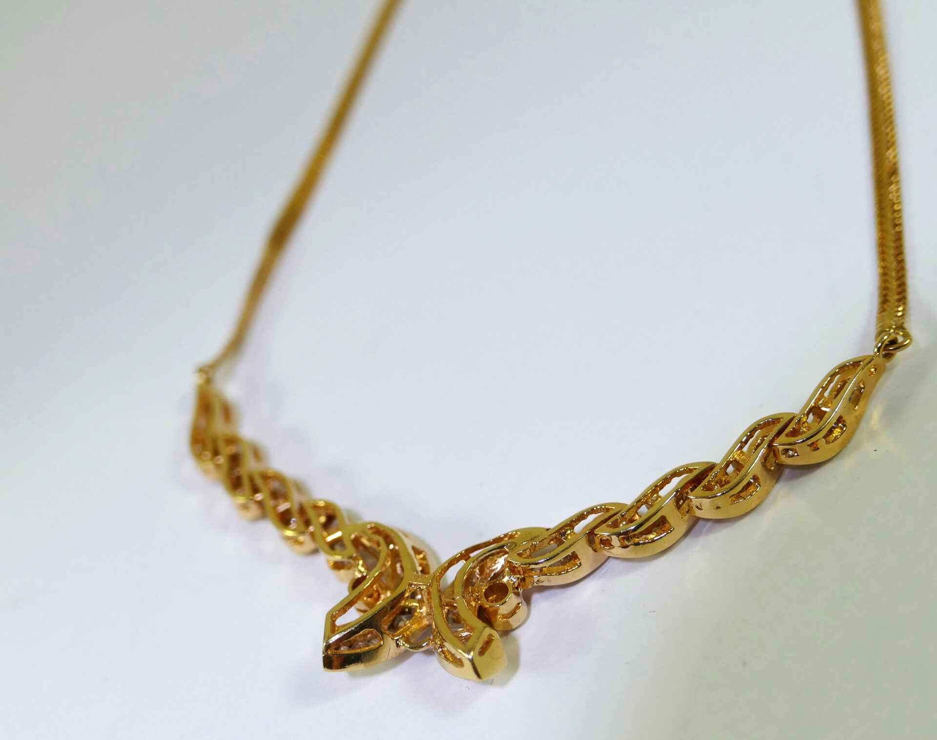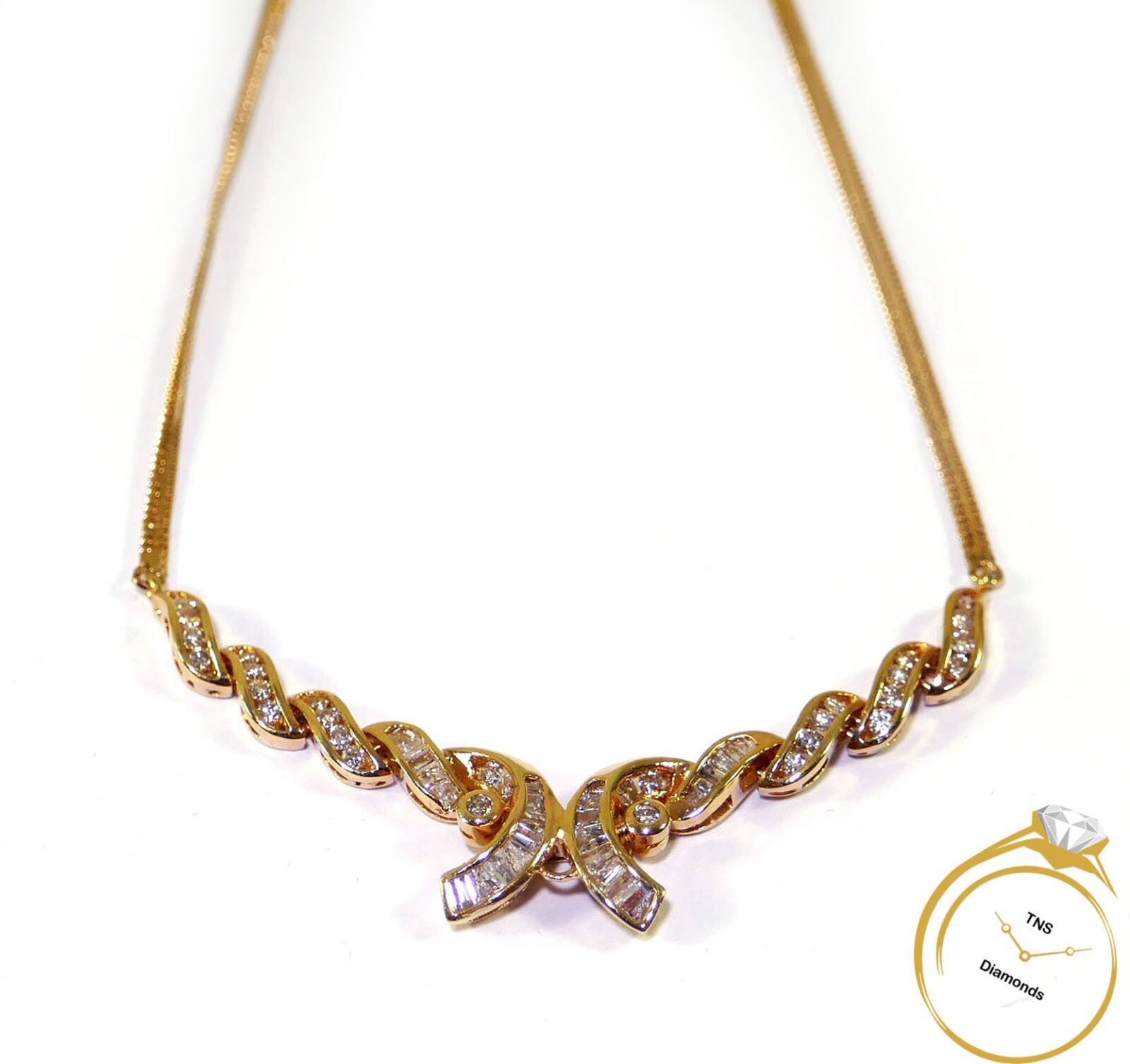 Read Morethis necklace is crafted in 18k yellow gold and diamonds. The pendant’s length is approximately 76mm, and the width of the widest part of the pendant is 15mm. This necklace weighs 12.3 grams.