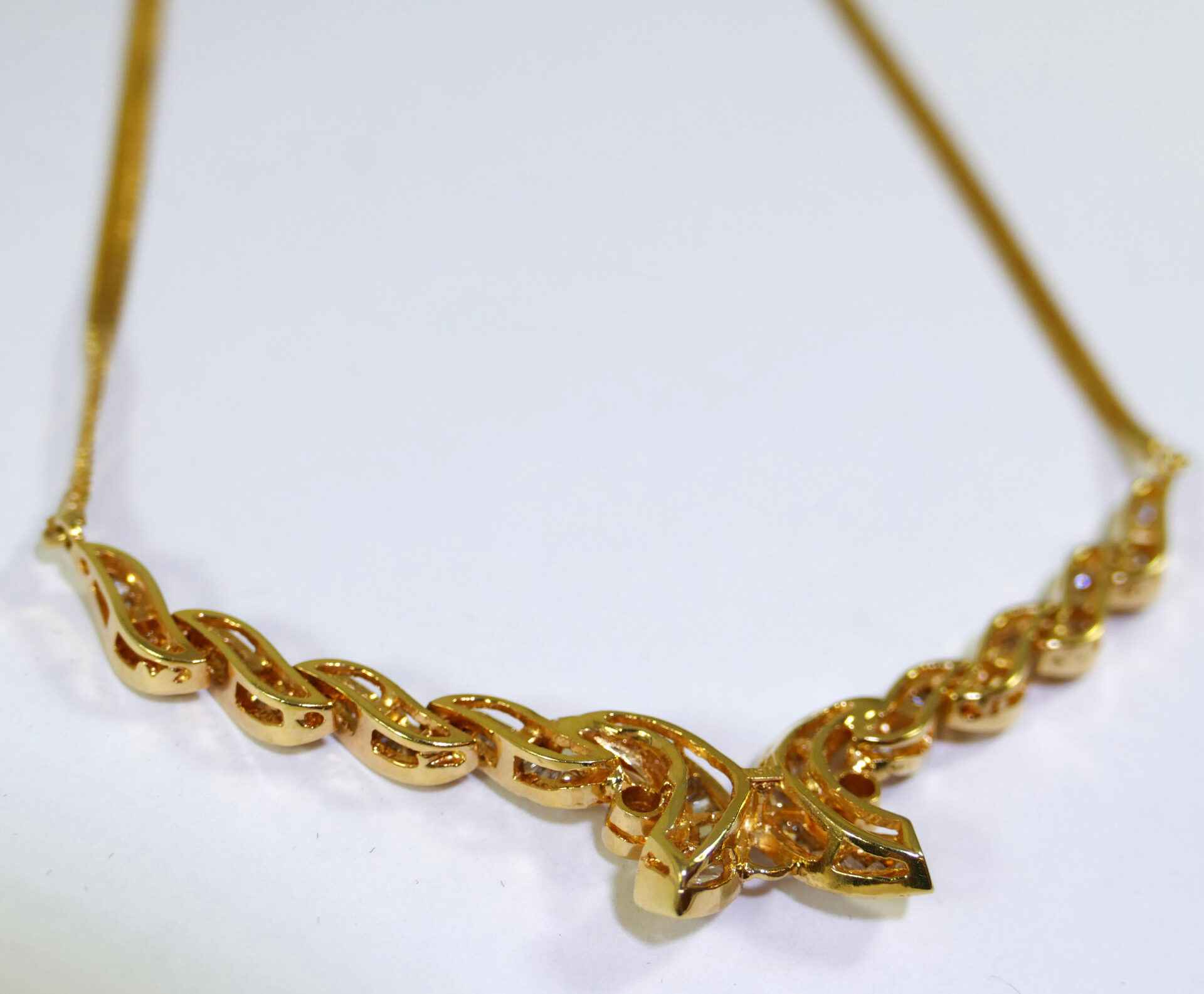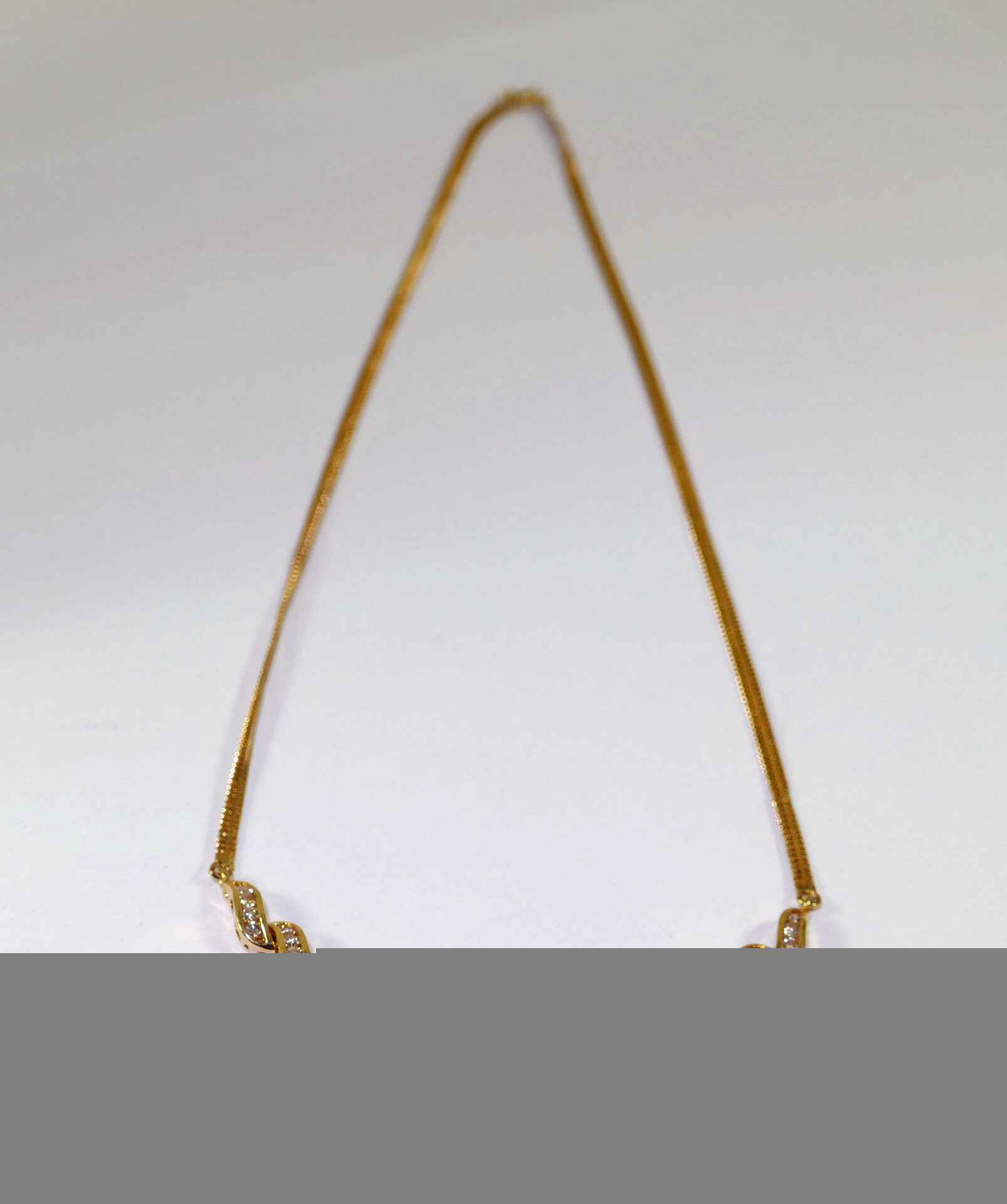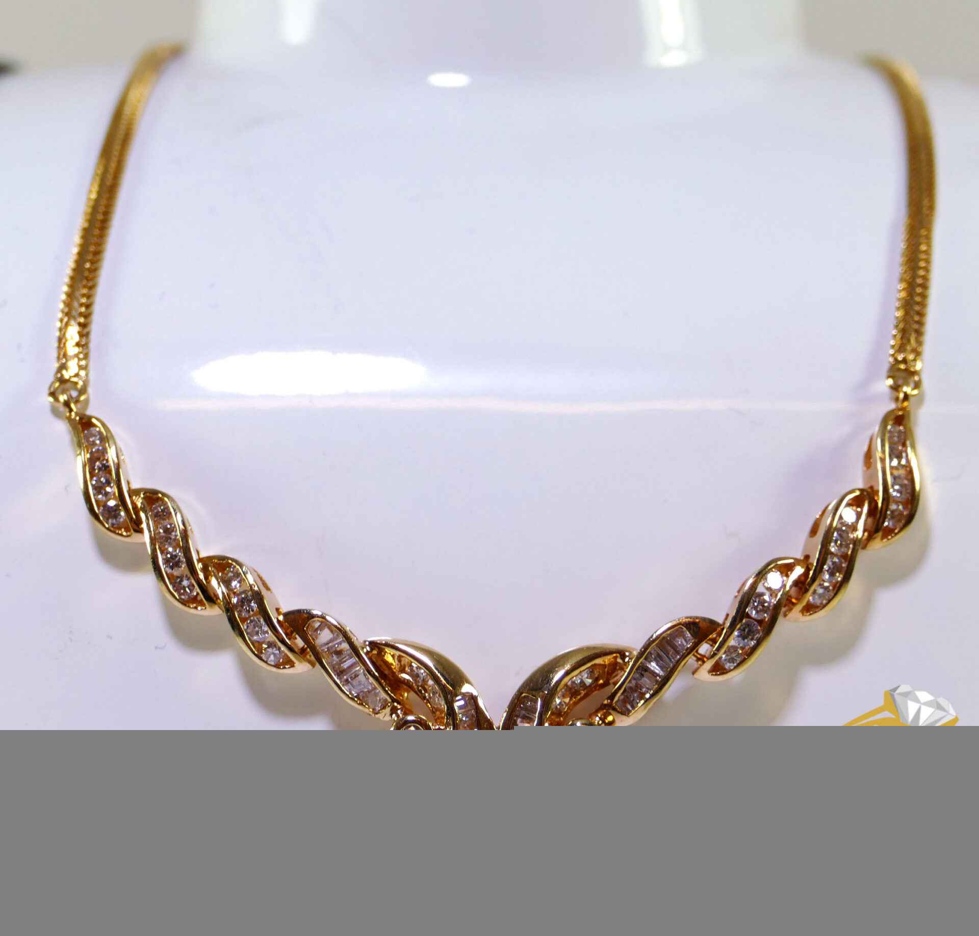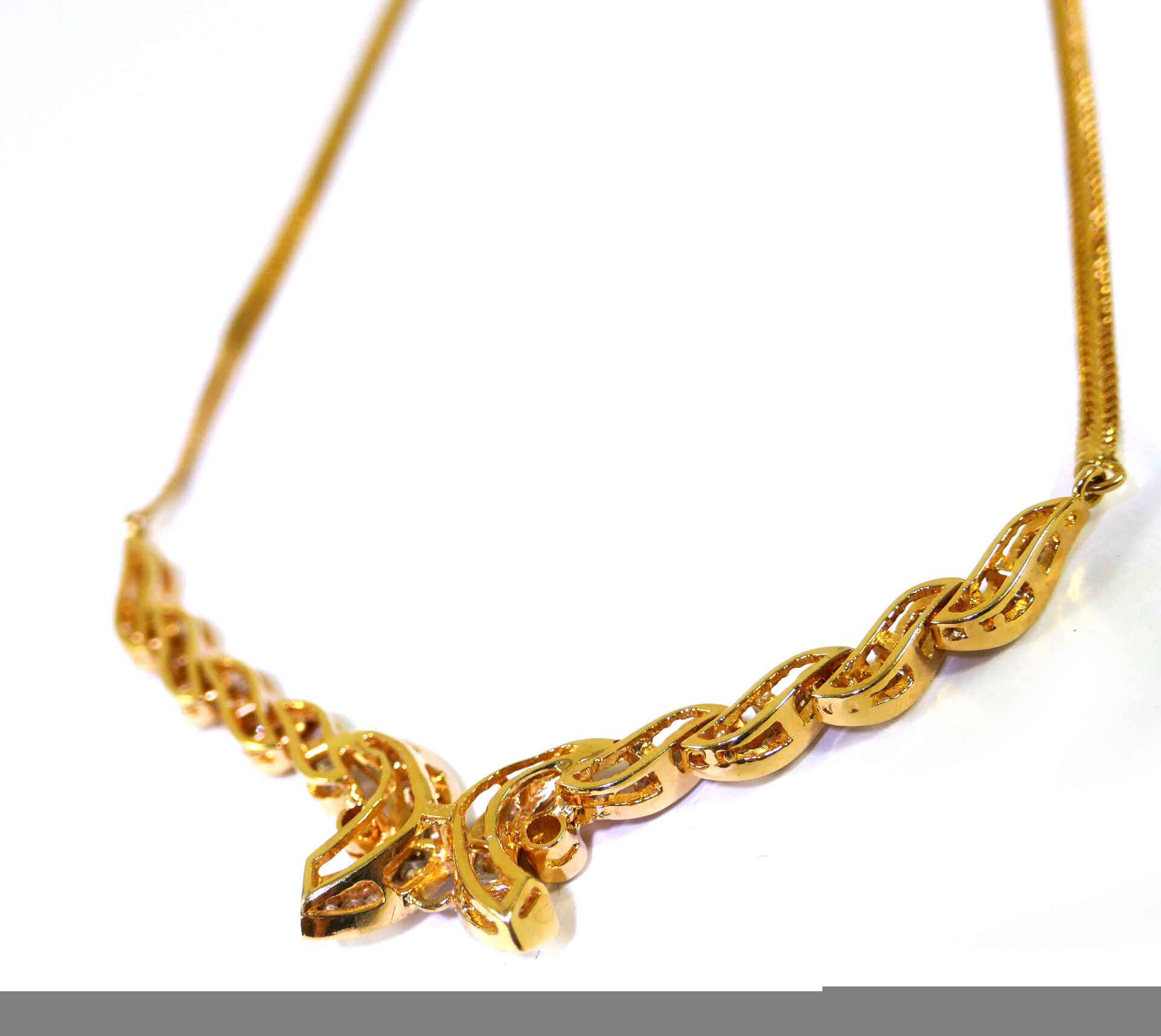Read Morethis necklace is crafted in 18k yellow gold and diamonds. The pendant’s length is approximately 76mm, and the width of the widest part of the pendant is 15mm. This necklace weighs 12.3 grams.