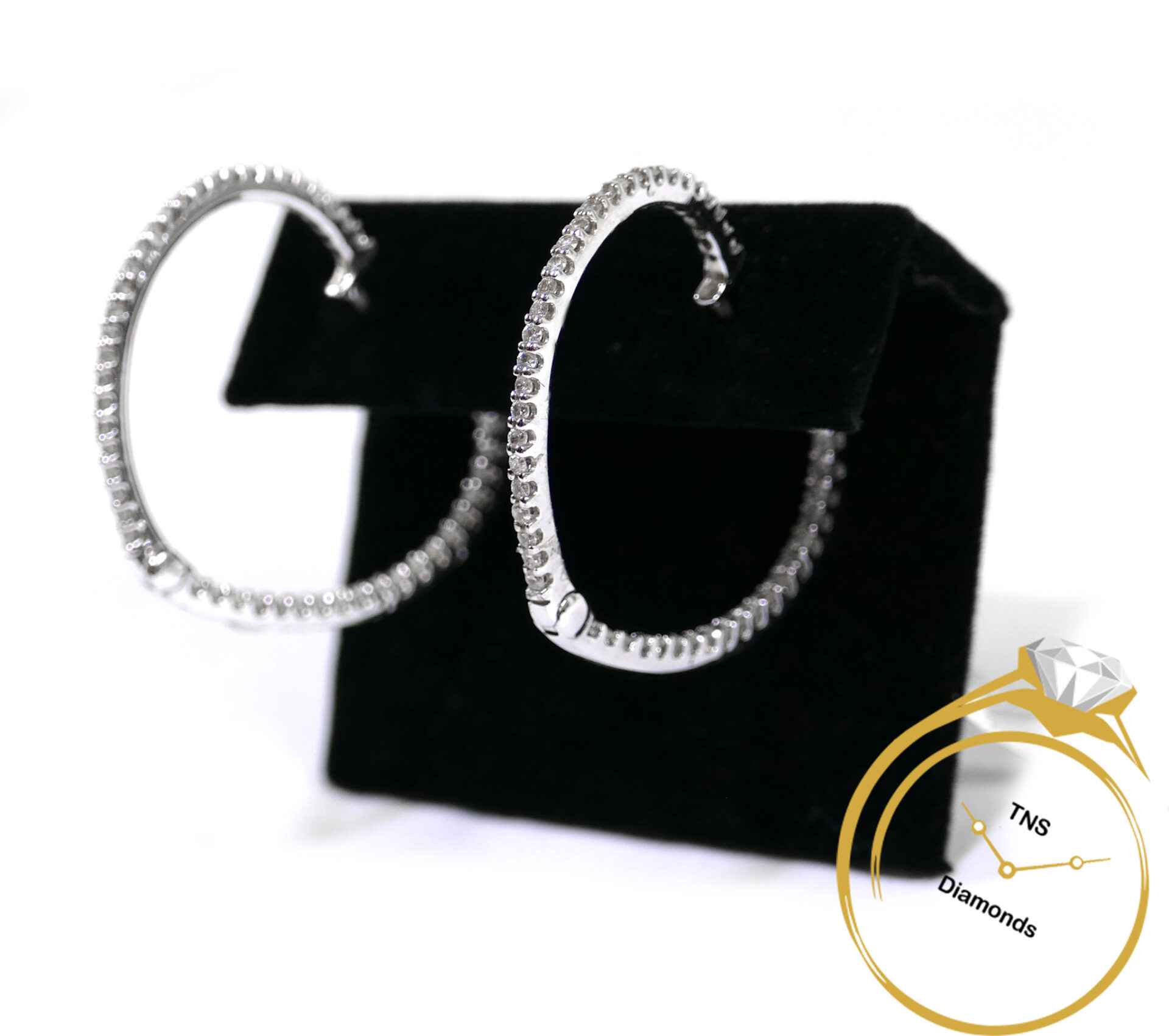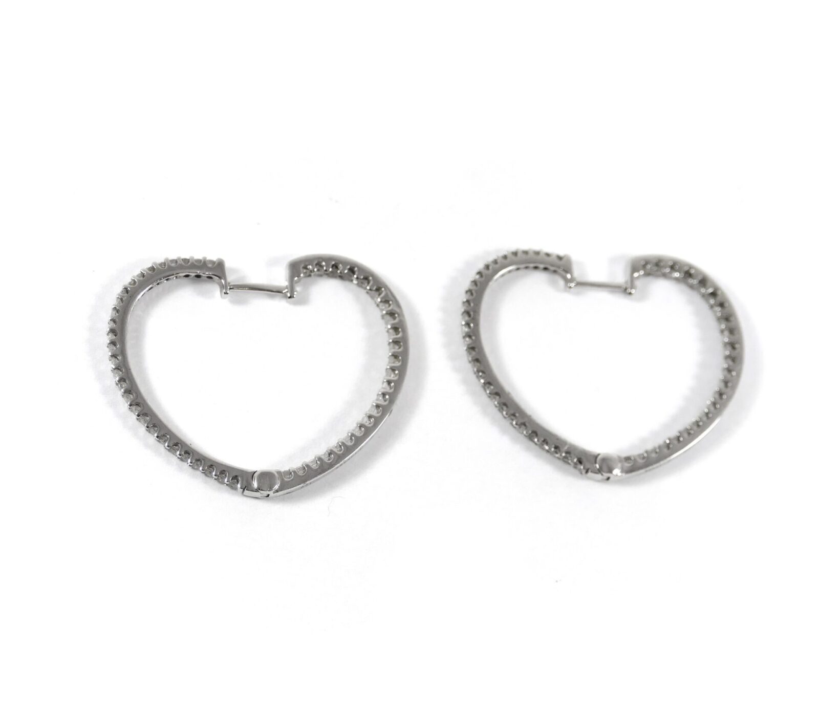these big diamond incrusted hoops are in the shape of hearts! they are unique because one side of the earring has diamonds on the front, and the back of the earrings have diamonds on the insides of the back! they have locking posts, which make them comfortable and secure on the ear. They designed in 14k white gold, and are absolutely stunning.
