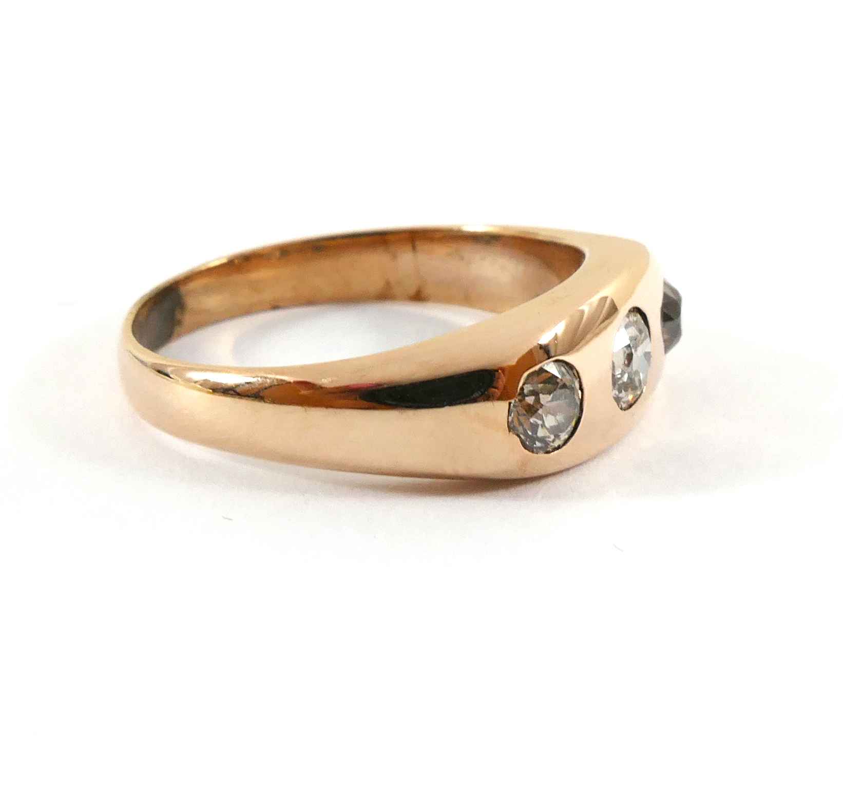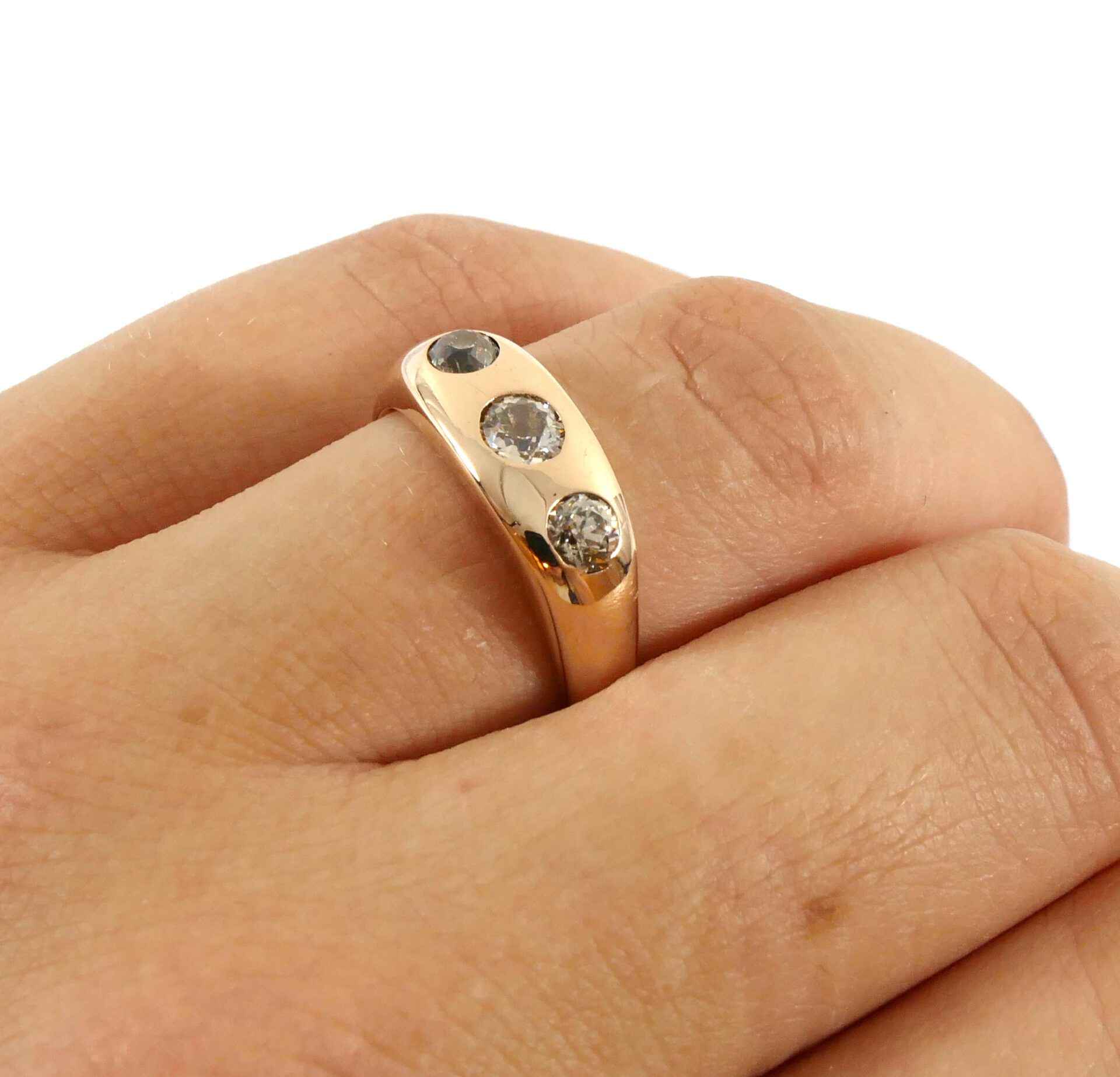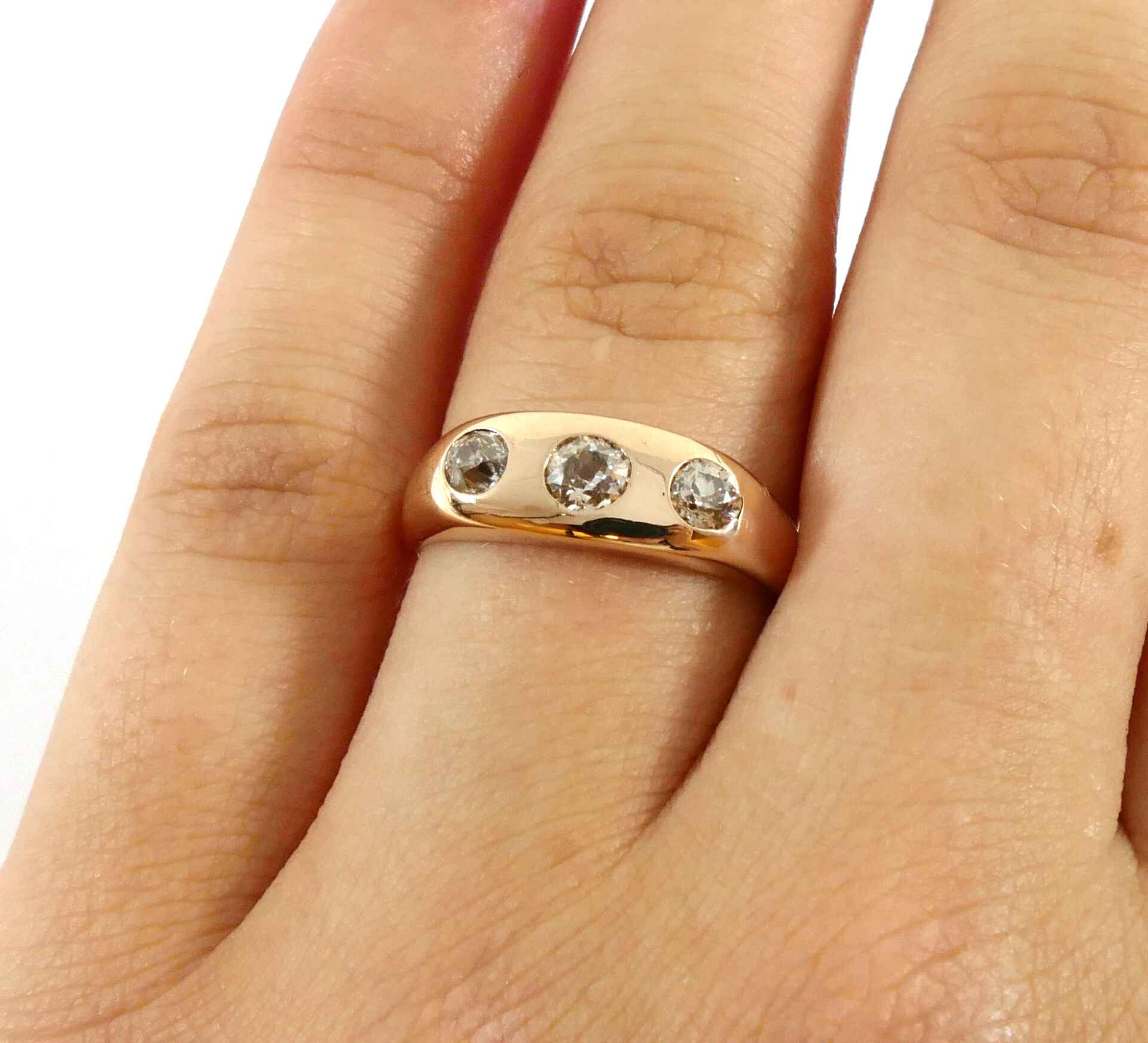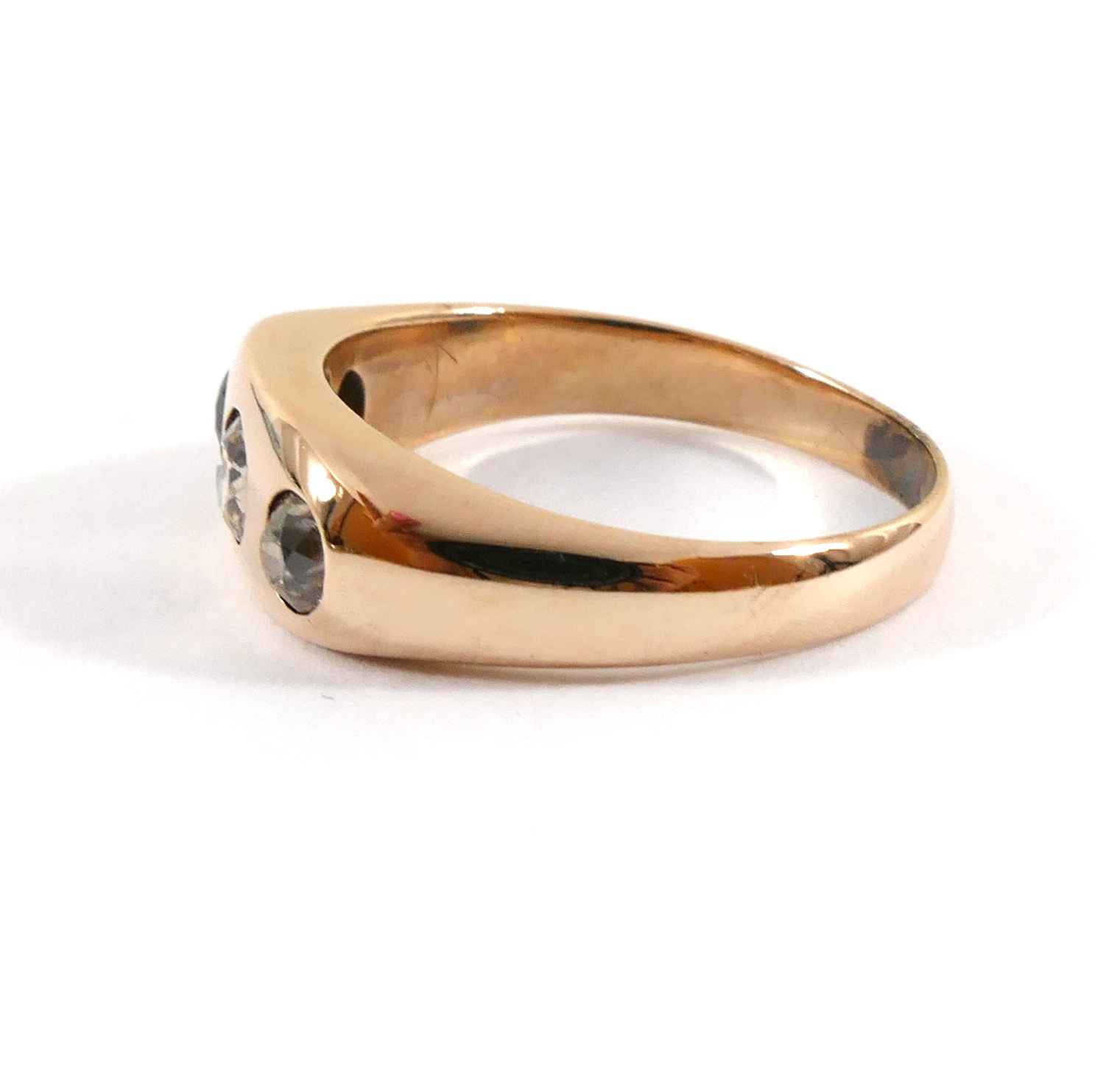 this is a gypsy set diamond ring, sitting in solid 14k yellow gold.