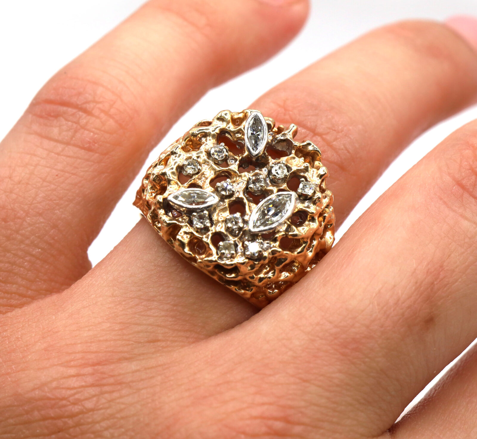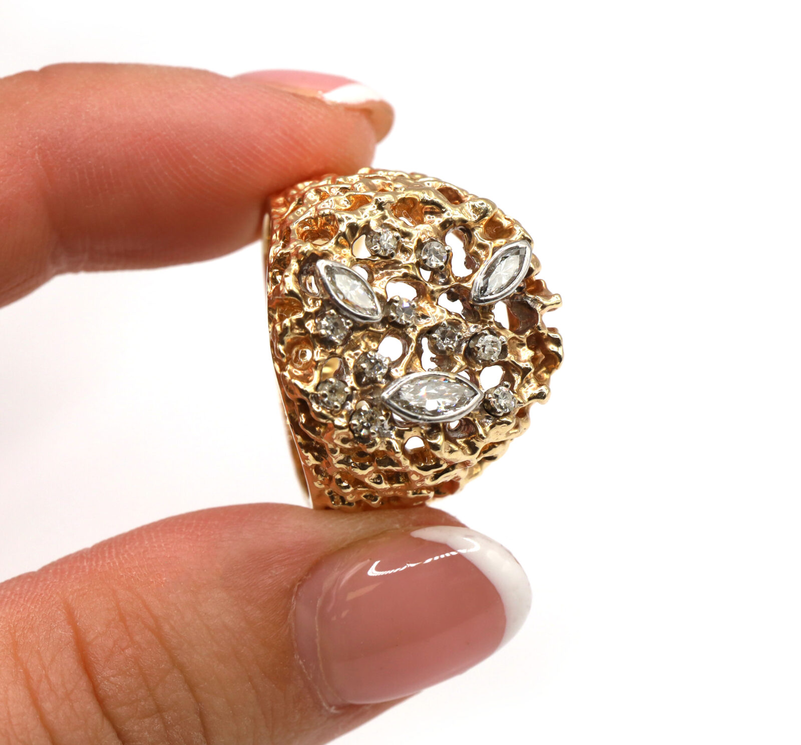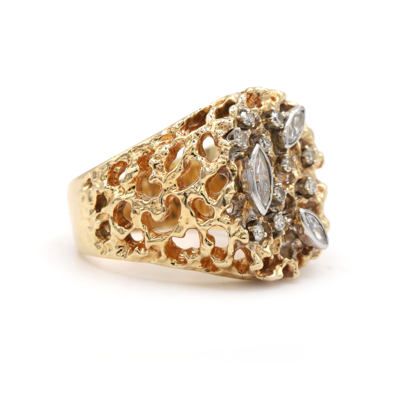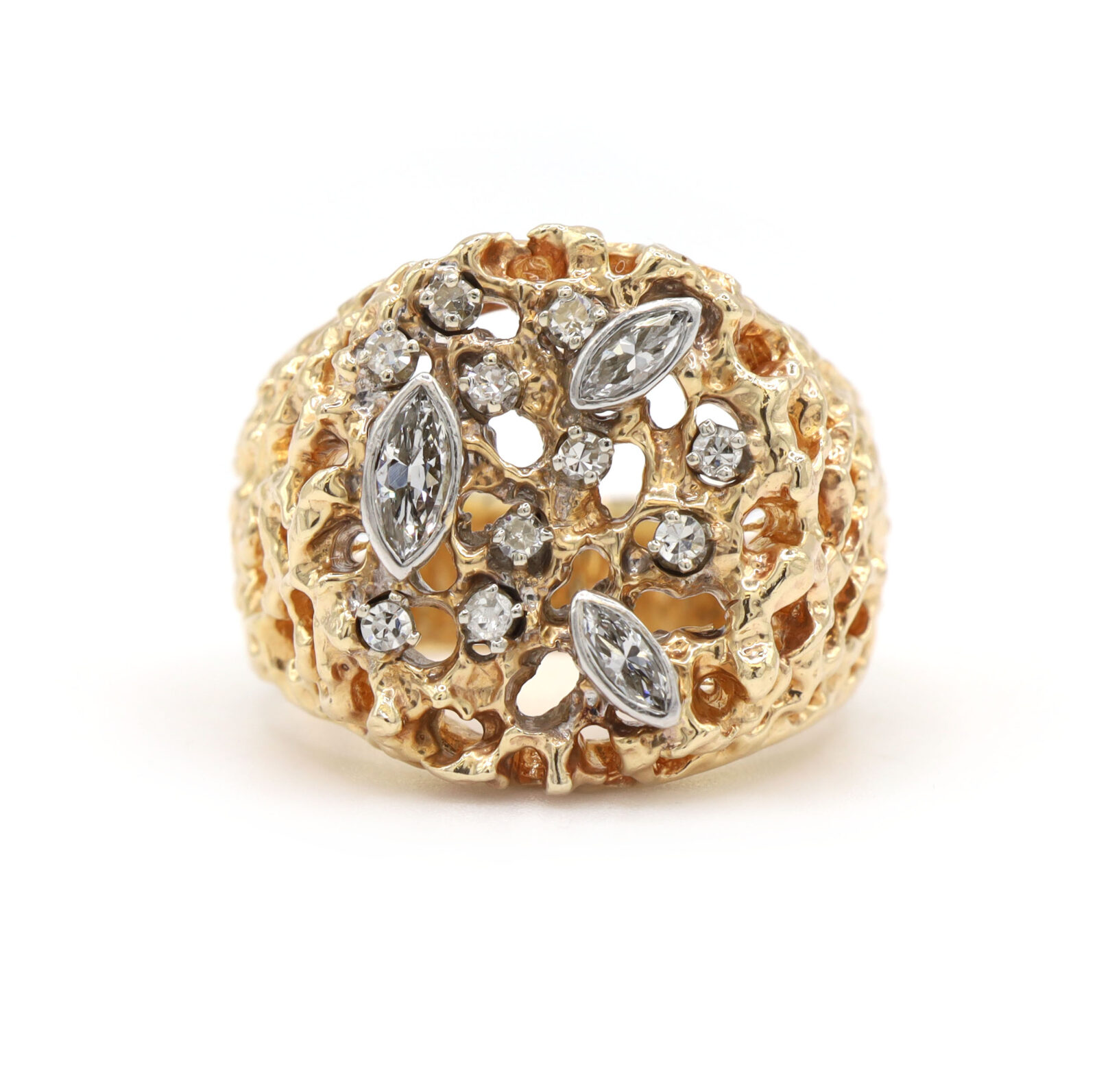 Material: 14k Yellow Gold Size: 8.25 Gemstone: Natural Diamond Carat Weight: Approximately 0.84ct Cut: Round Brilliant Clarity: SI1 Color: F Front Width: 19mm Band Width: 5.5mm Weight: 13.7 Grams