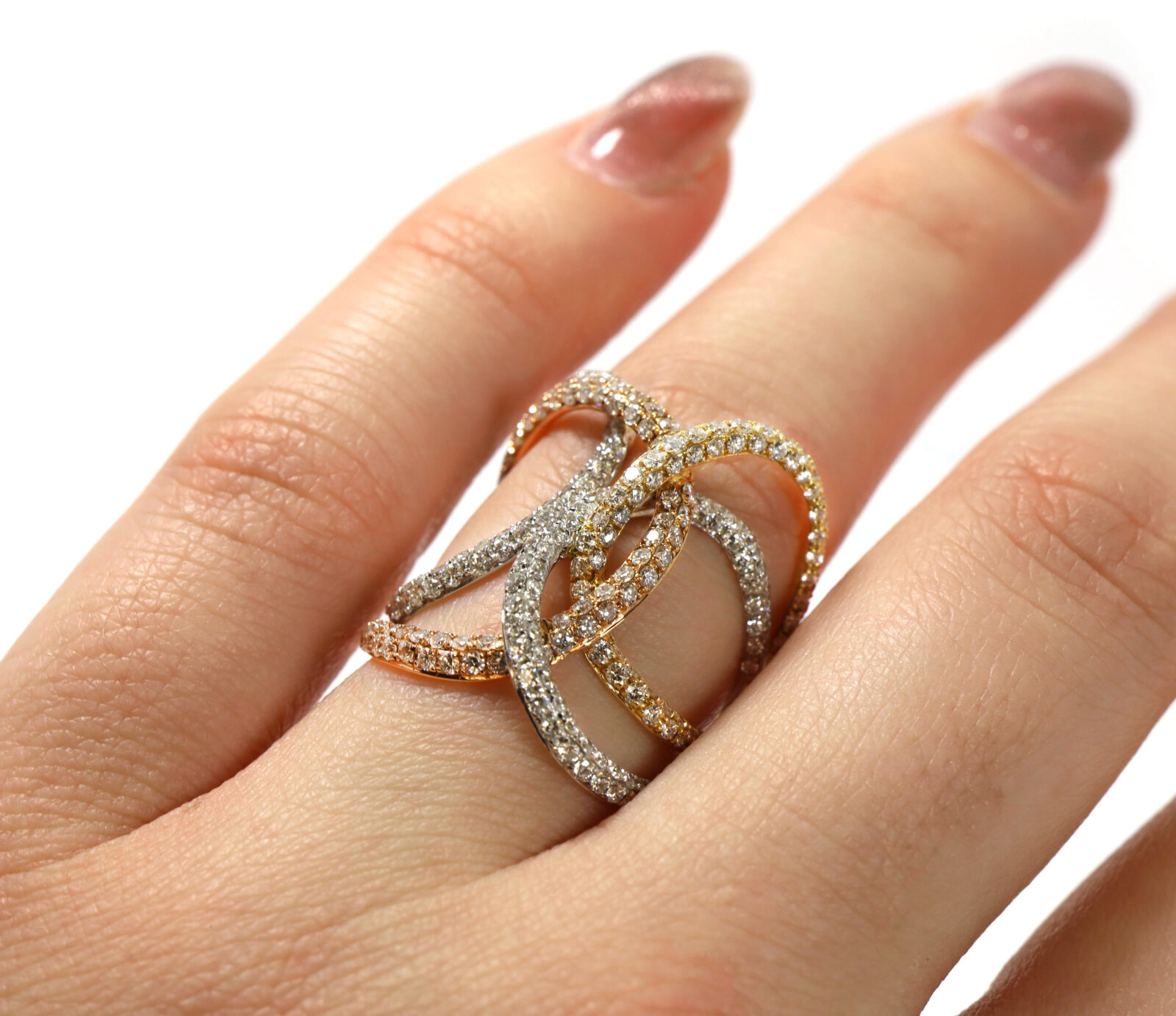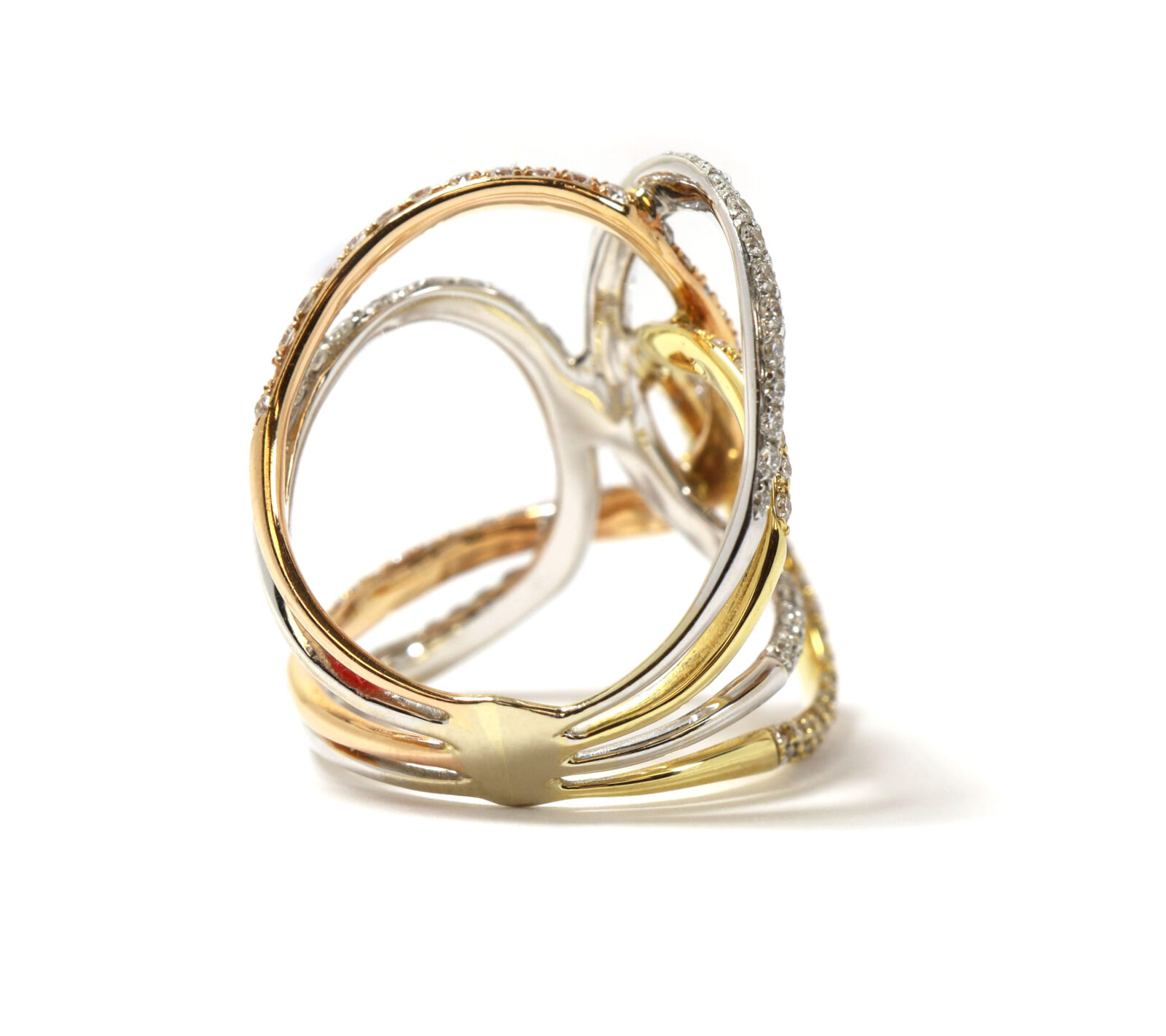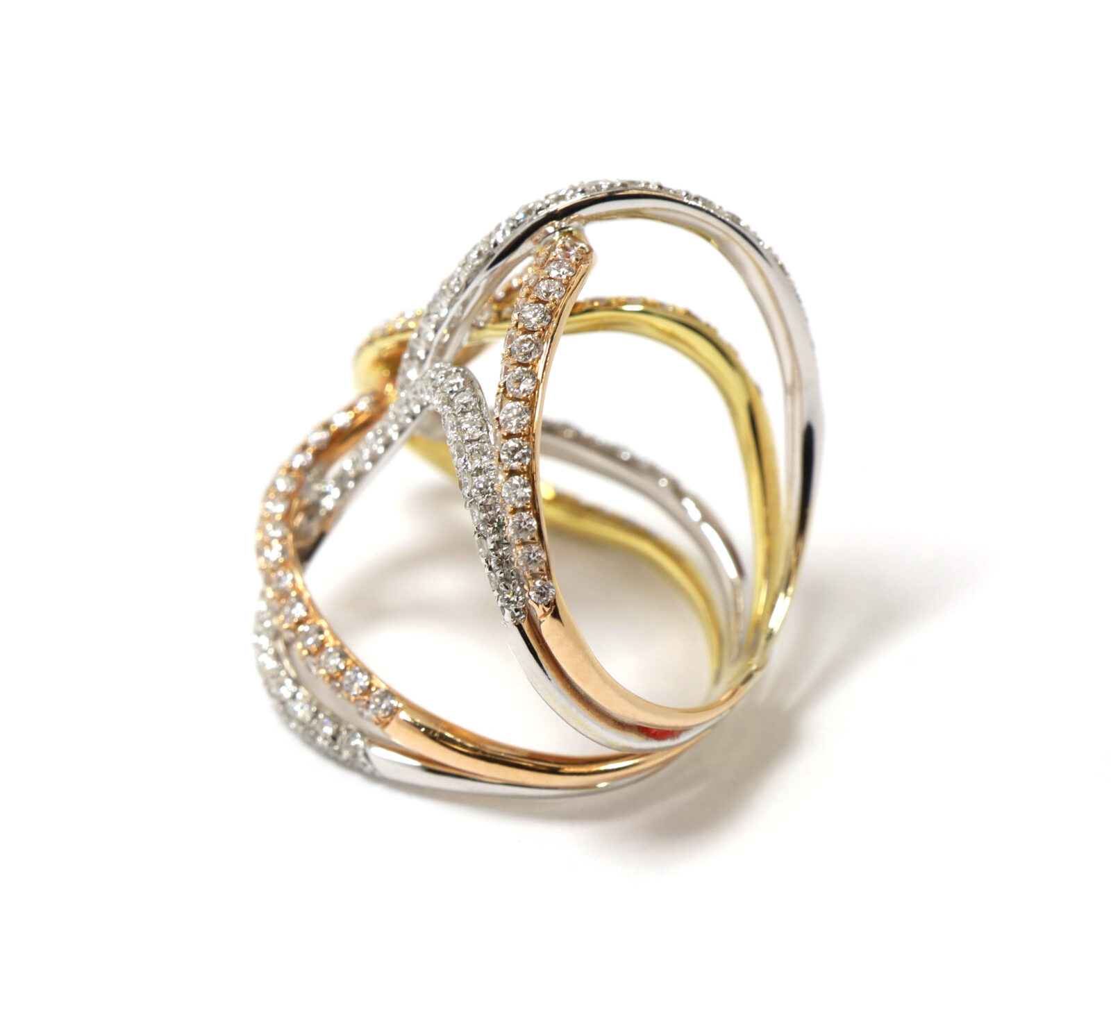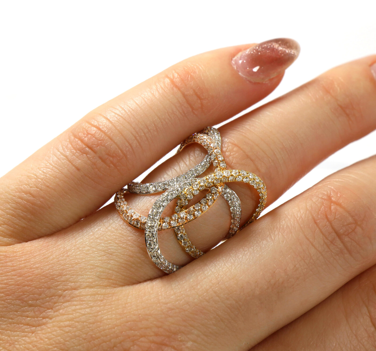 Read Moremetal: 18k yellow/rose/white gold ring size: 5.5 width: front – 24mm, back – 5.3mm gemstone: diamond carat weight total: 1.55 carat cut: round clarity: vs color: e/f buy with confidence from tns diamonds, a trusted and established jeweler with a brick-and-mortar storefront and over 40 years of combined experience in the ethical watch and jewelry trade. At tns diamonds, we are proud to have trusted gia graduate gemologists on staff, ensuring that every piece of jewelry meets the highest standards of quality and craftsmanship. With our expertise and commitment to ethical practices, you can shop with peace of mind knowing you’re receiving a genuine product. If you have any questions or need further assistance, please don’t hesitate to reach out!