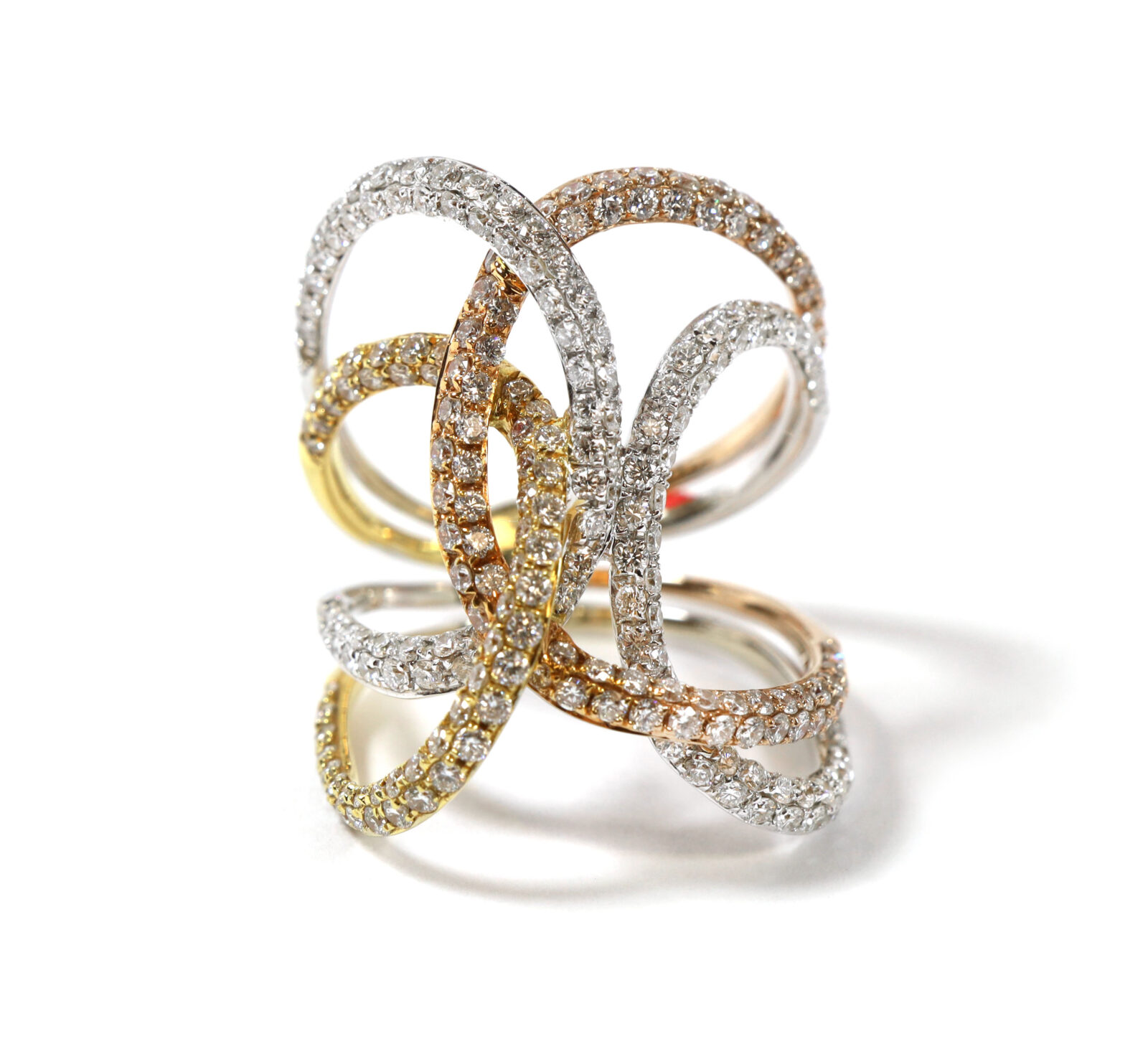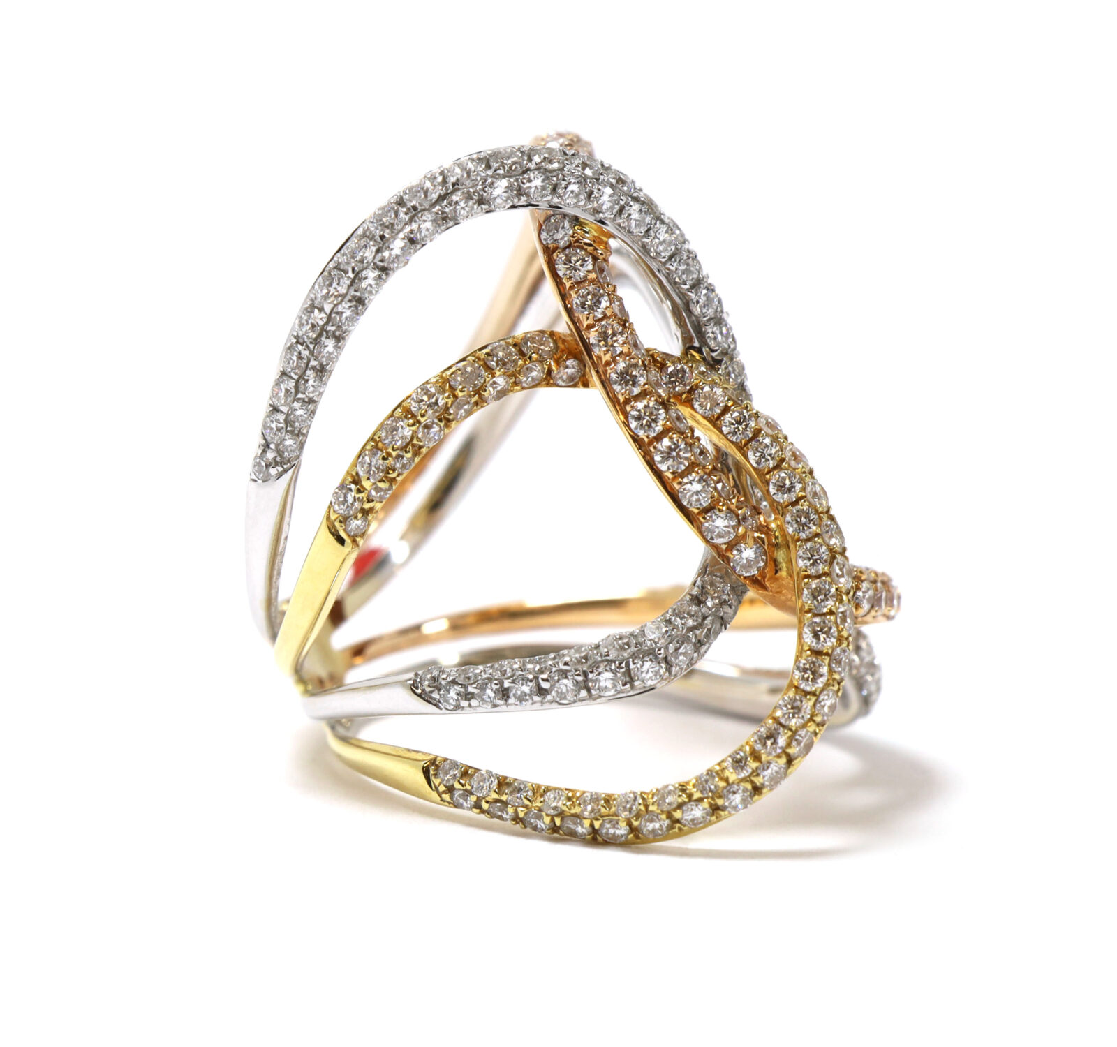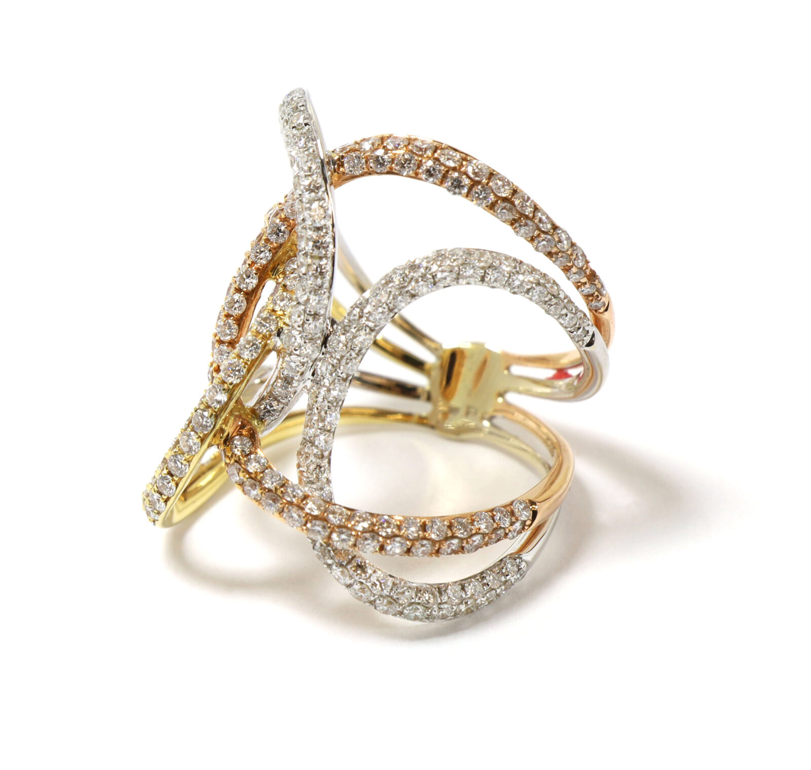 Metal: 18k Yellow/Rose/White Gold Ring Size: 5.5 Width: Front - 24mm, Back - 5.3mm Gemstone: Diamond Carat Weight Total: 1.55 Carat Cut: Round Clarity: VS Color: E/F Buy with confidence from TNS Diamonds, a trusted and established jeweler with a brick-and-mo...