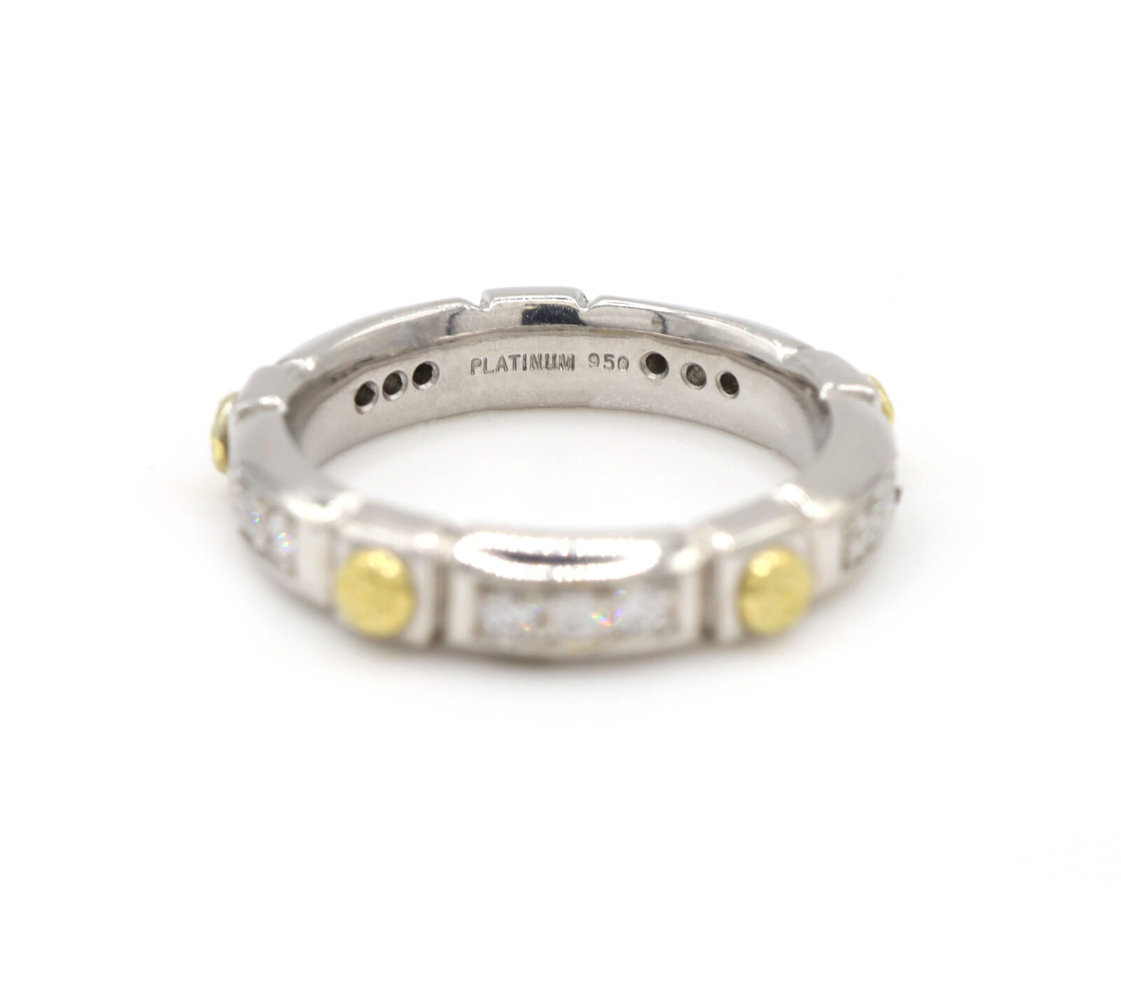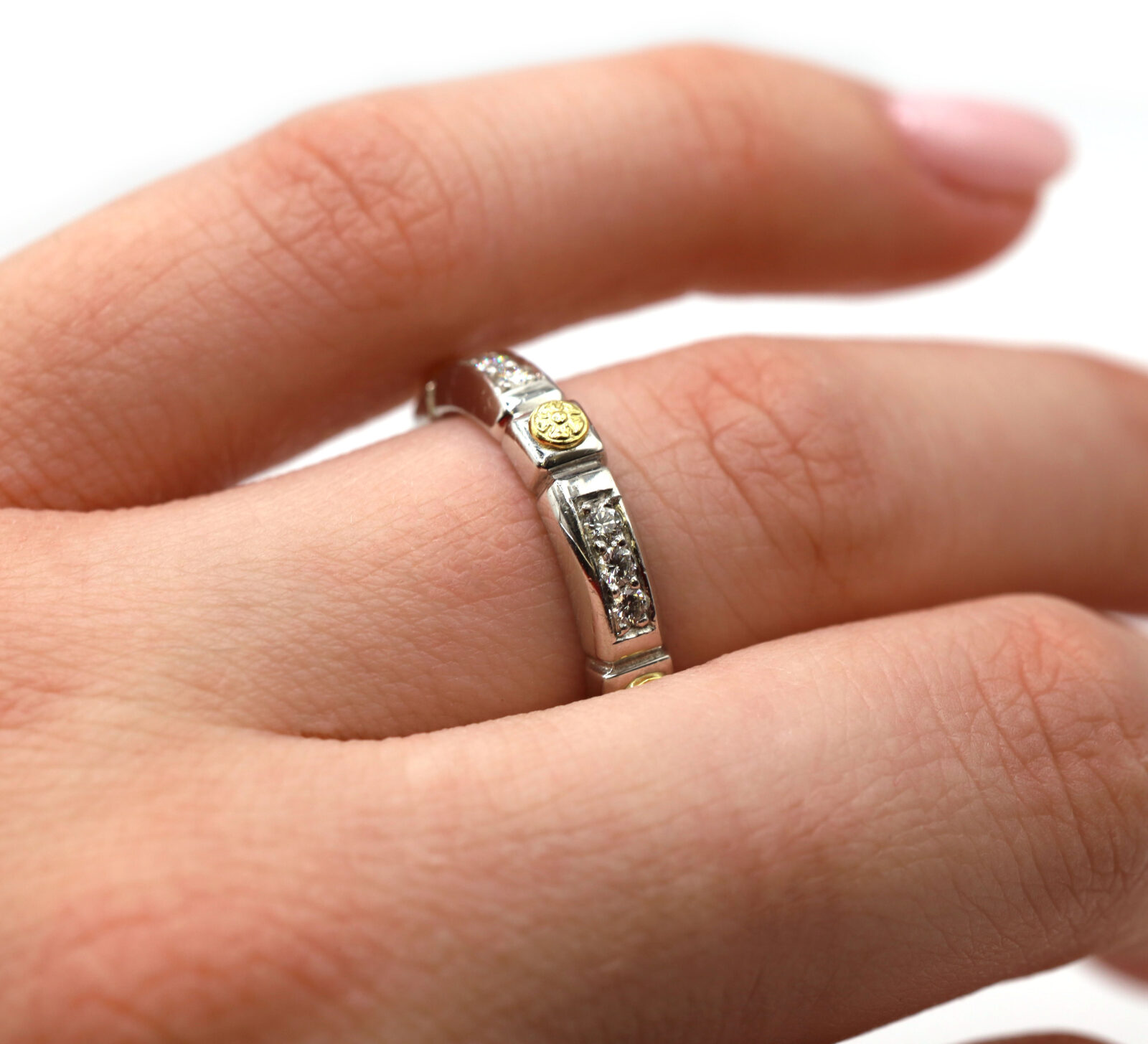 metal: platinum & 18k yellow gold band width: 4.2mm size: 6.75 gemstone: diamond carat weight: approximately 0.45 carat cut: round stone setting: prong set