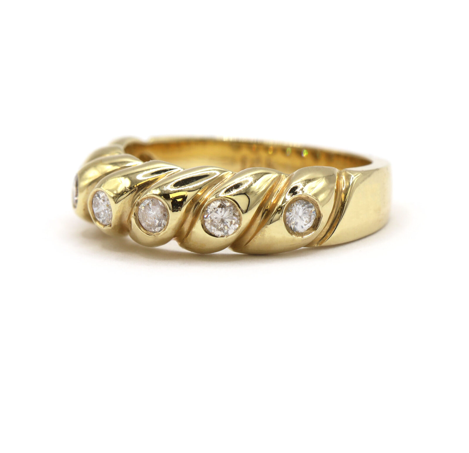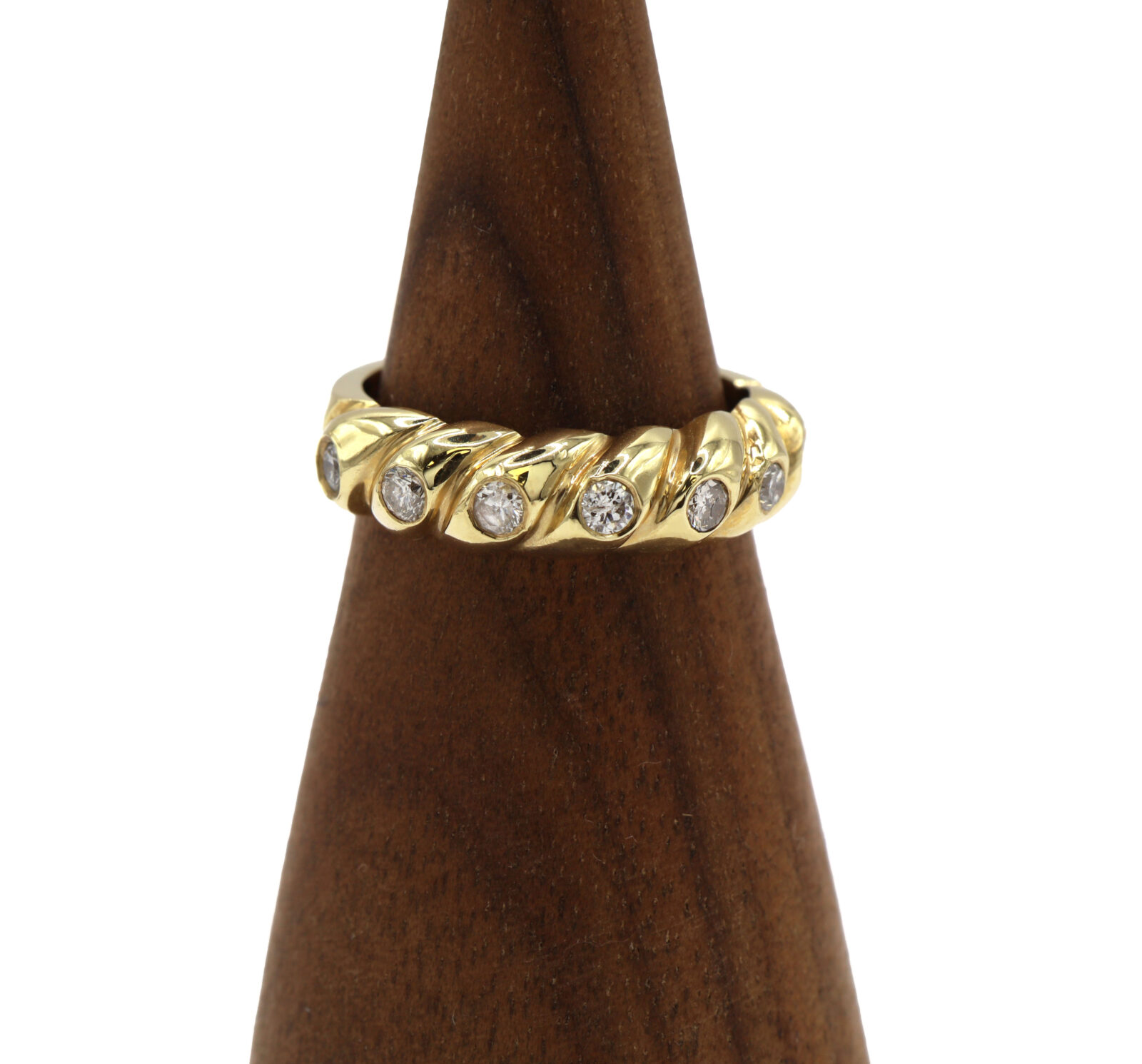 Material: 14k Yellow Gold Gemstone: Natural Diamond Carat Weight: 0.36 Carat Ring Size: 6.75 Front Width: 6mm Back Width: 4.8mm Weight: 6.4 Grams