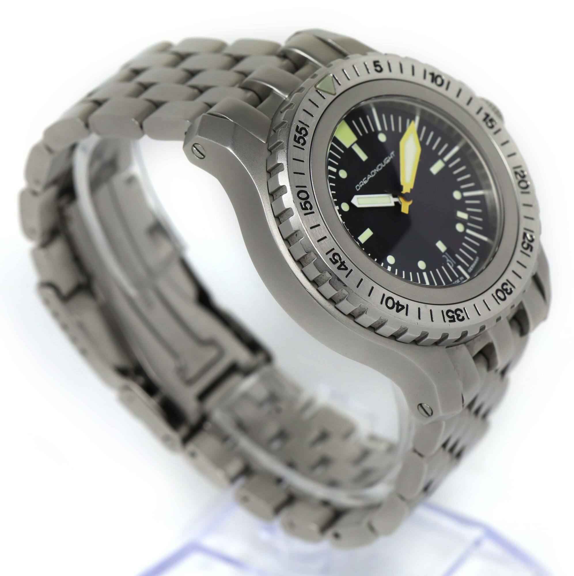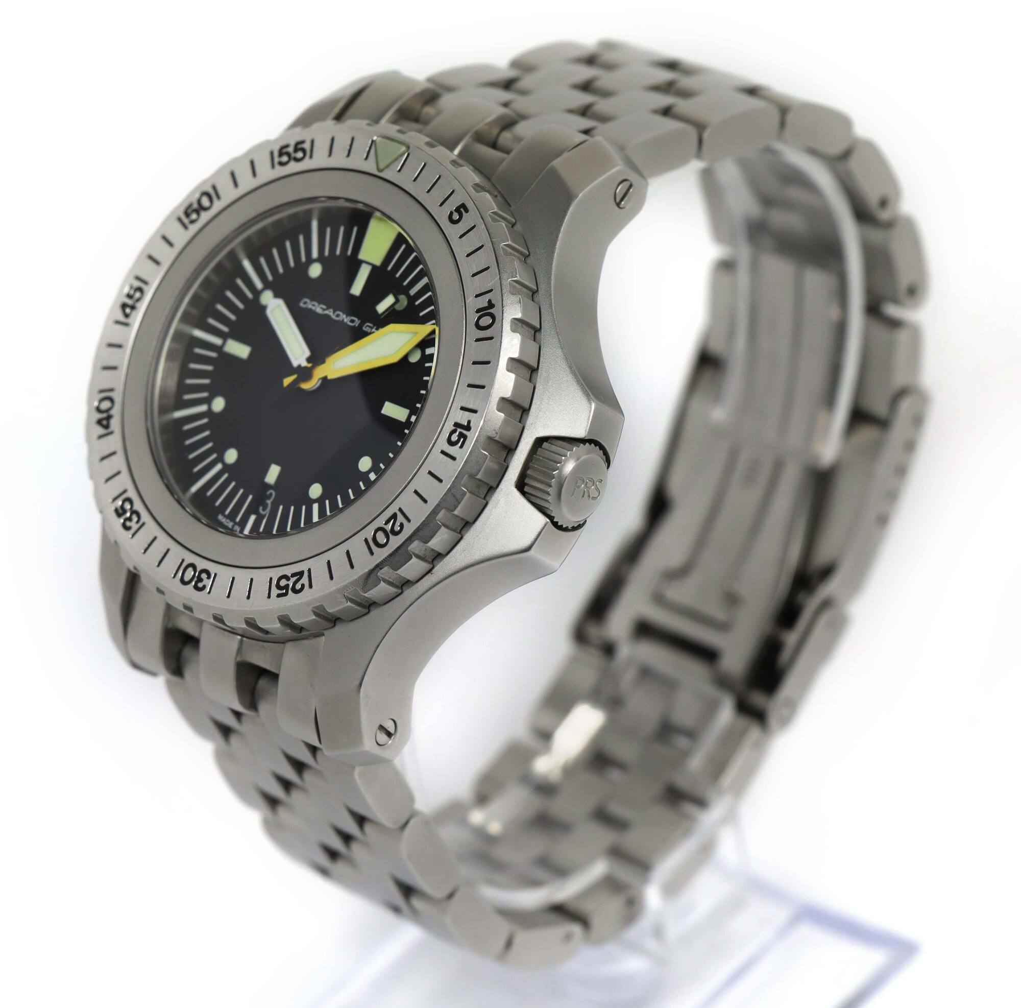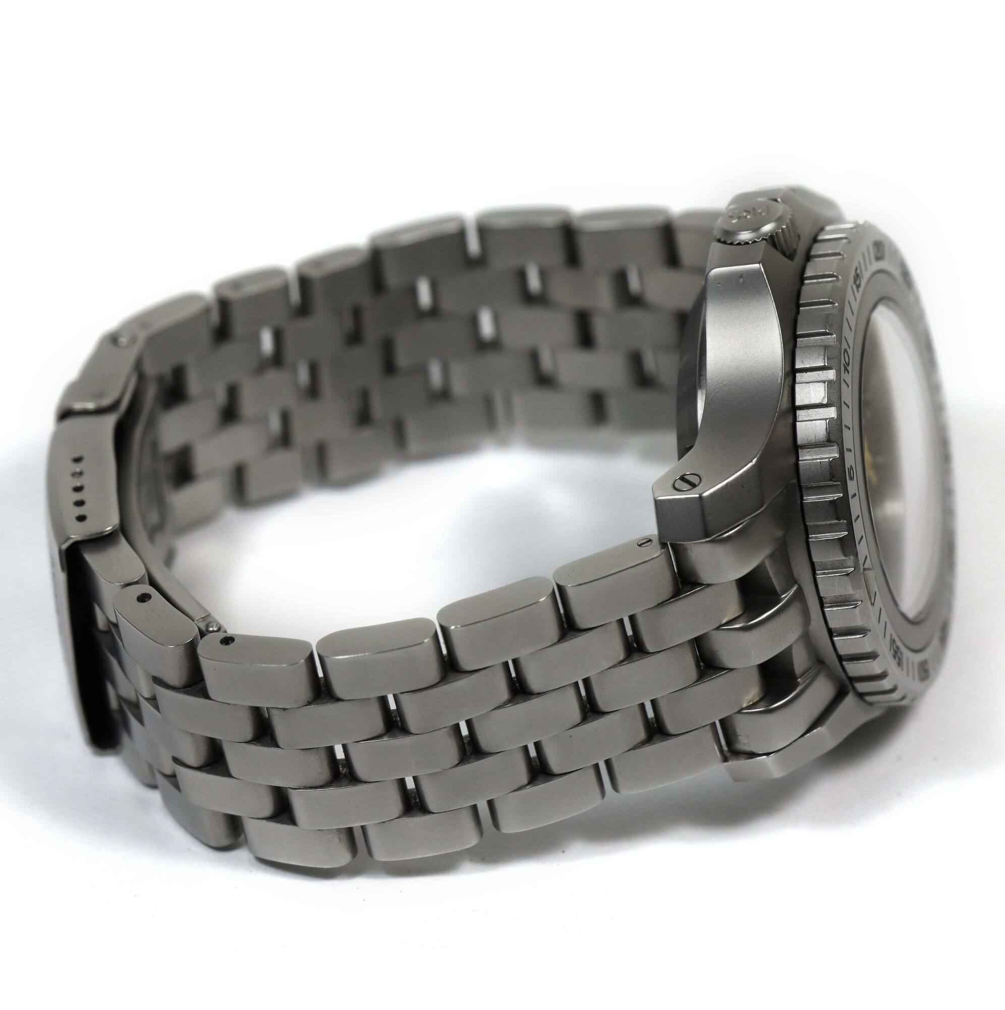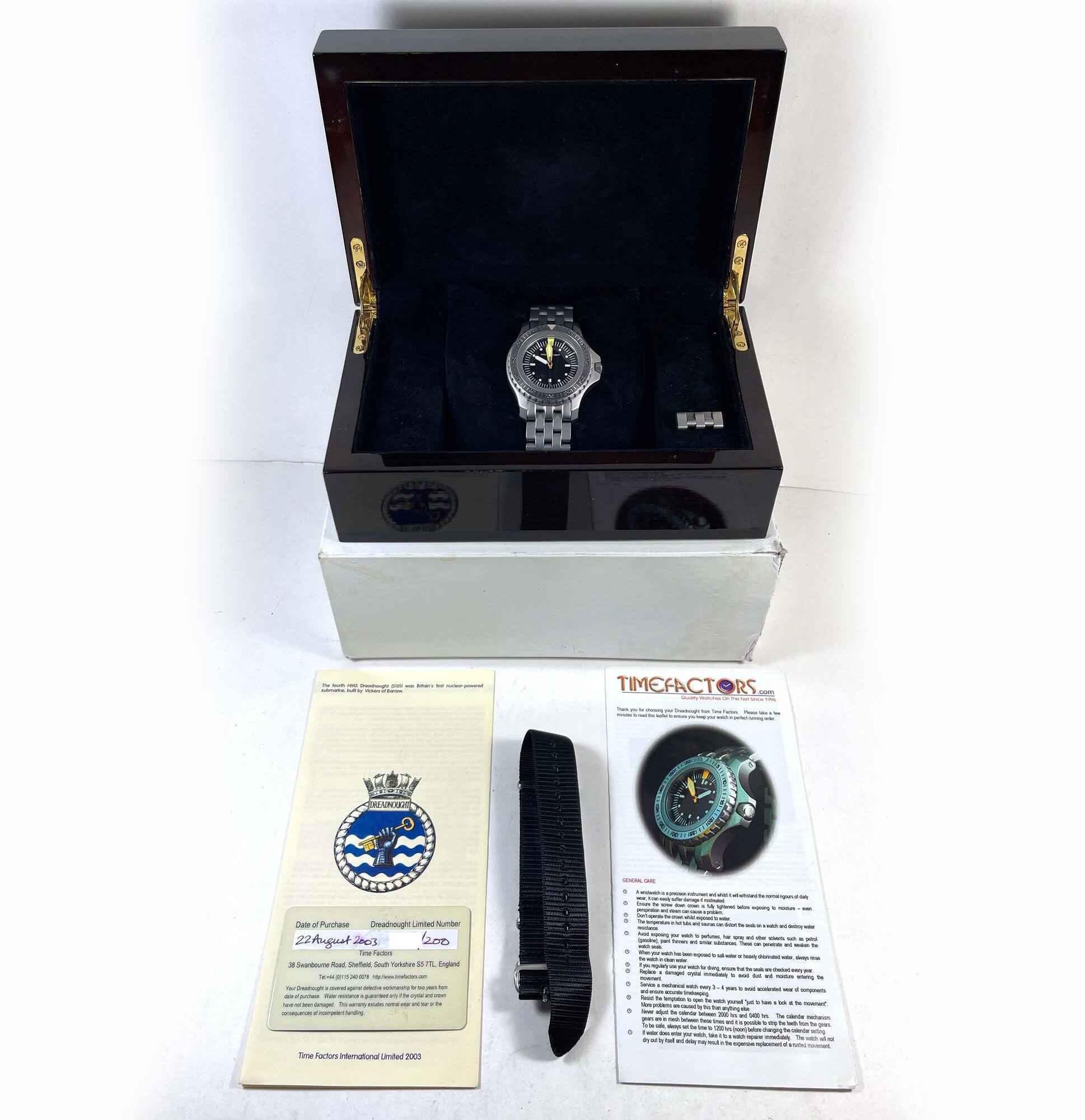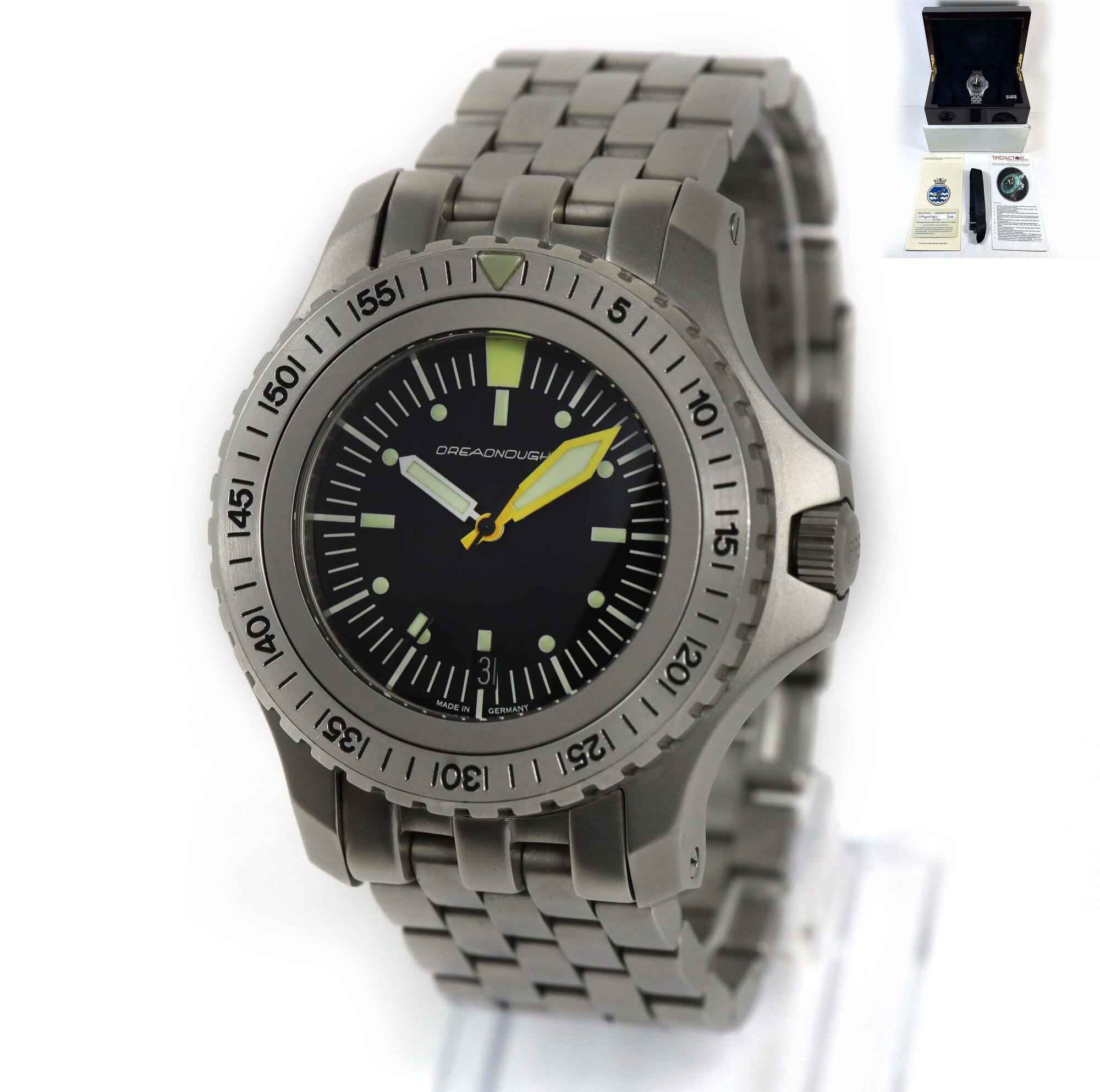 this dreadnought watch is in excellent condition and comes with its box, booklets, one spare link, one additional black strap, and warranty card dated august 22nd, 2003 as shown in the pictures attached. This watch is in stock and available to ship immediately!