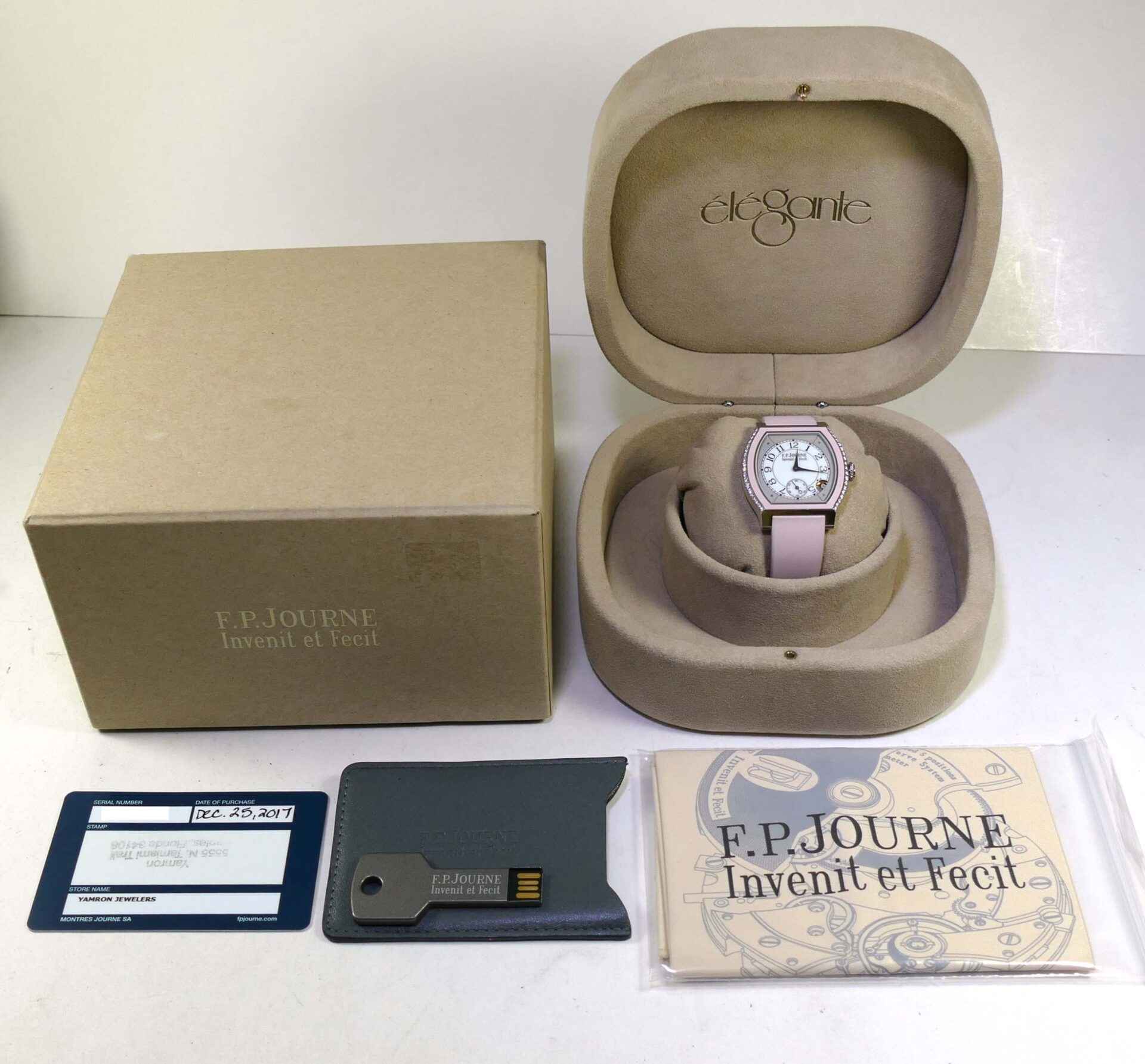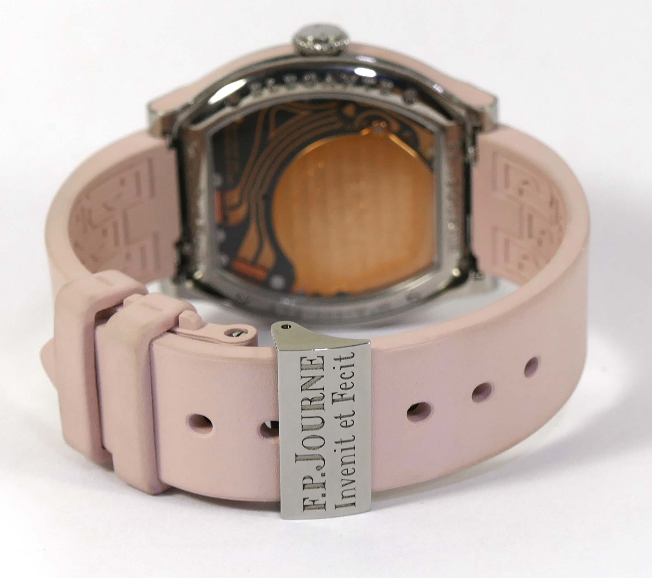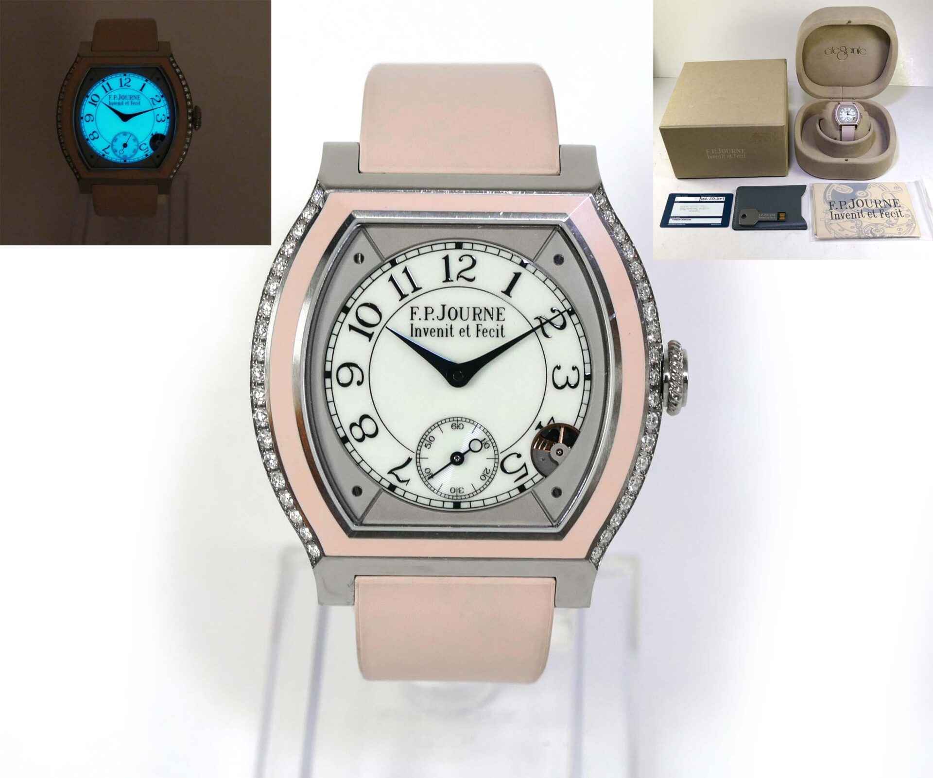 Read Morethis watch is in excellent condition and comes with its complete set, the warranty card is dated december 25th, 2017. This is an extremely rare version featuring factory diamonds, with light pink ceramic inserts around the bezel and sides of the case, and rubber strap. Fp journe calls this color scheme “powder rose”. The entire dial glows in the dark, making it extremely easy to read at night. Also, the watch goes to “sleep” when it is not being worn, once you pick it back up it quickly adjusts itself to the correct time. The 40mm case is measured from top to bottom, the side to side width is 35mm.