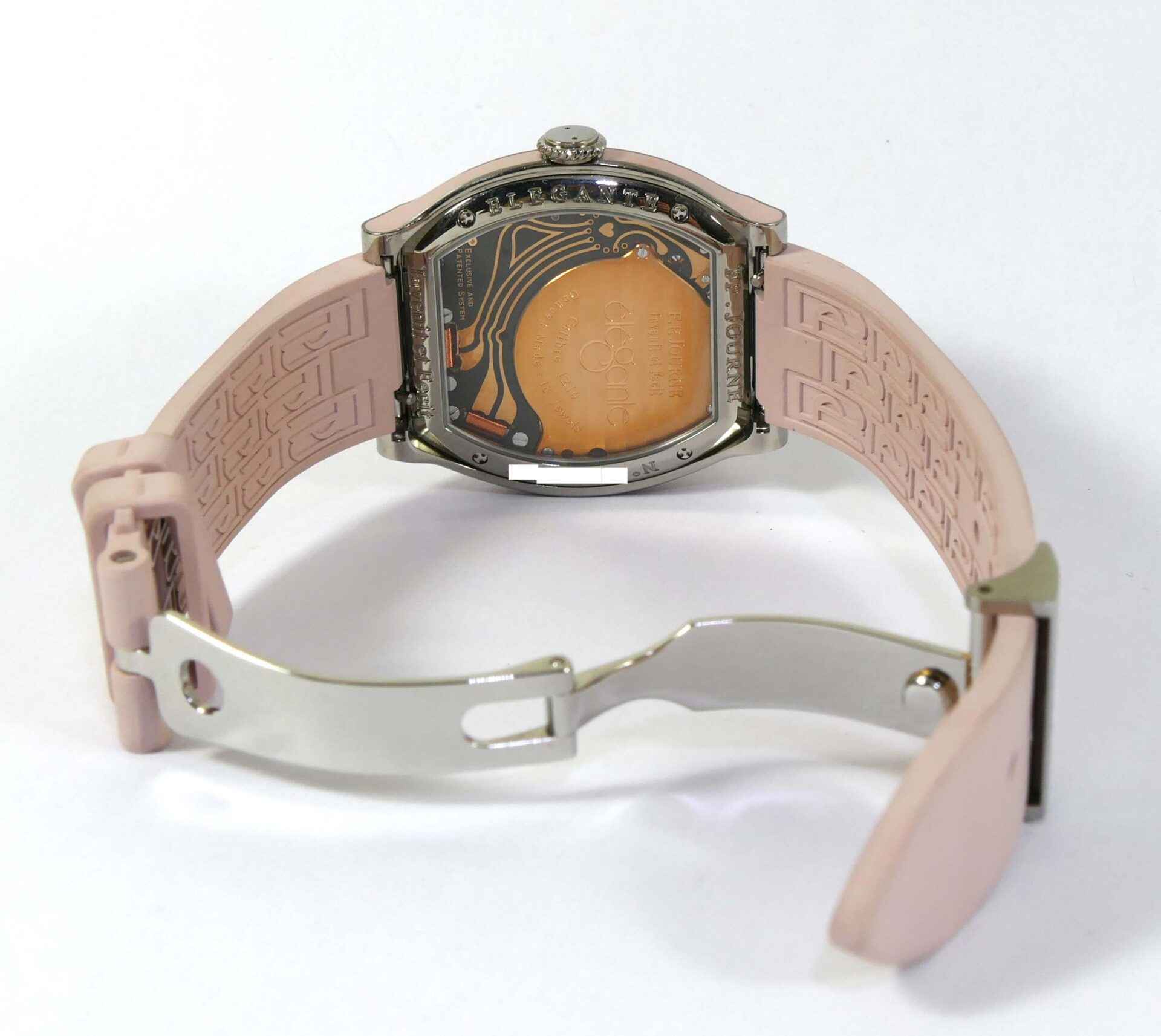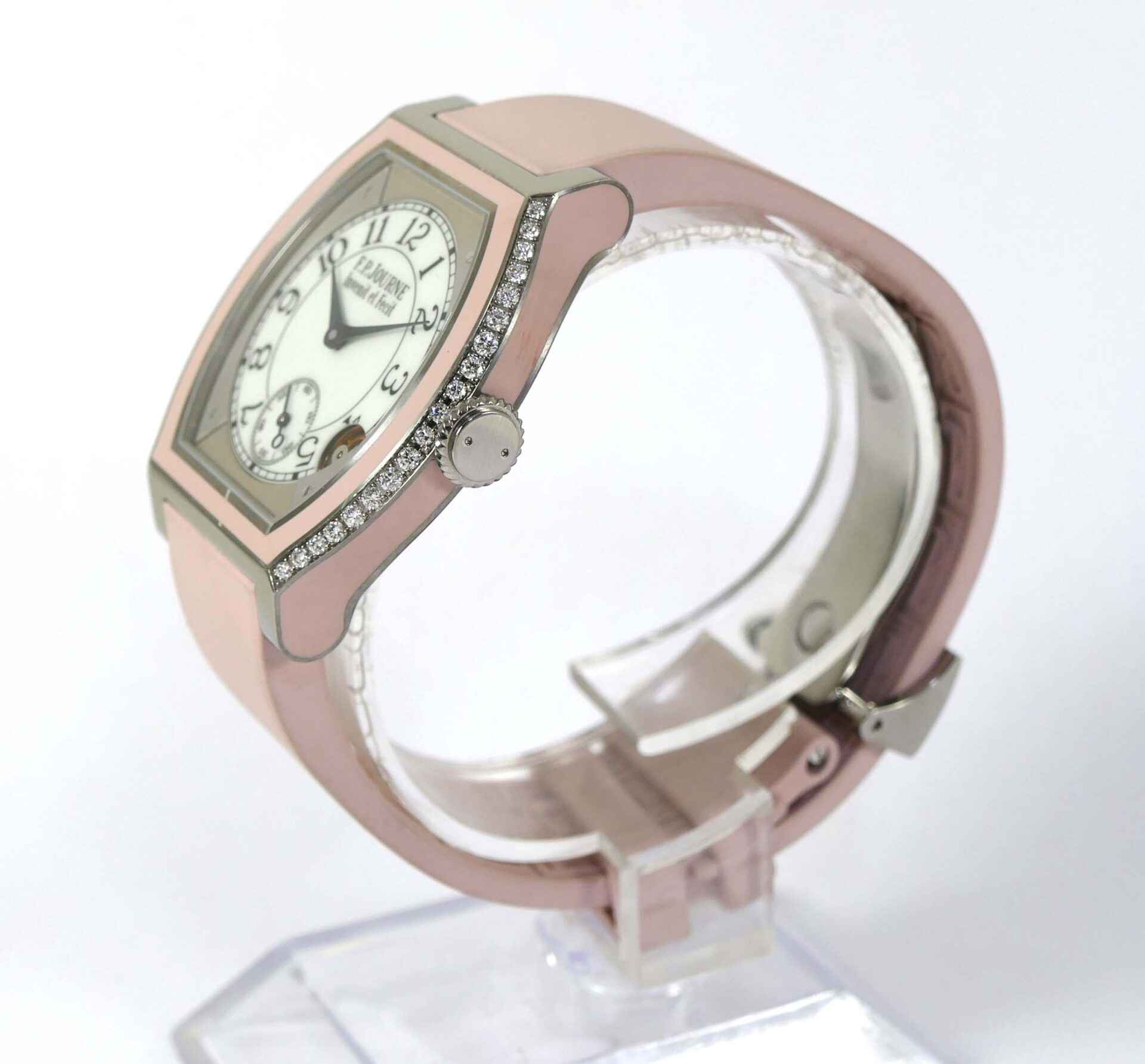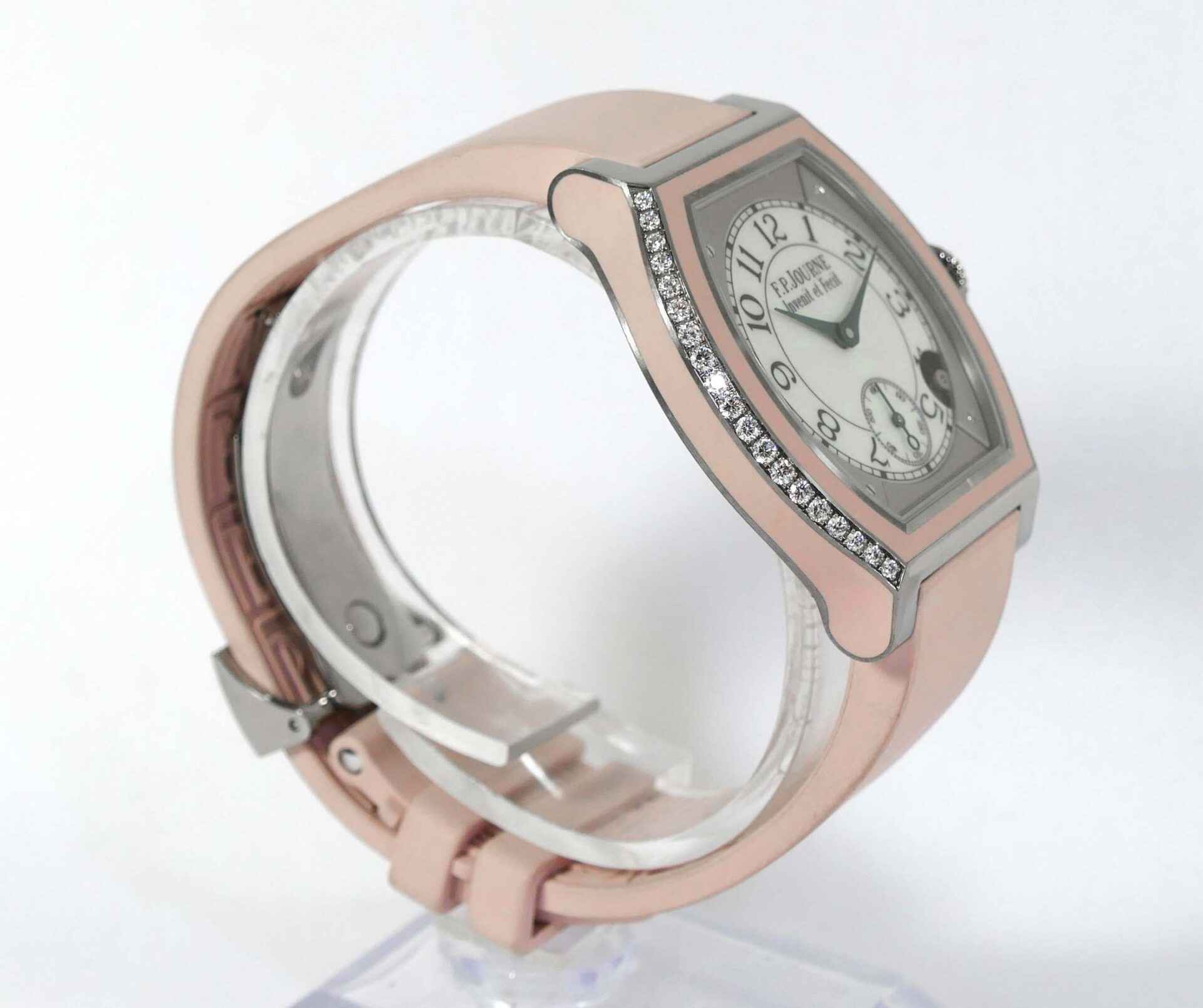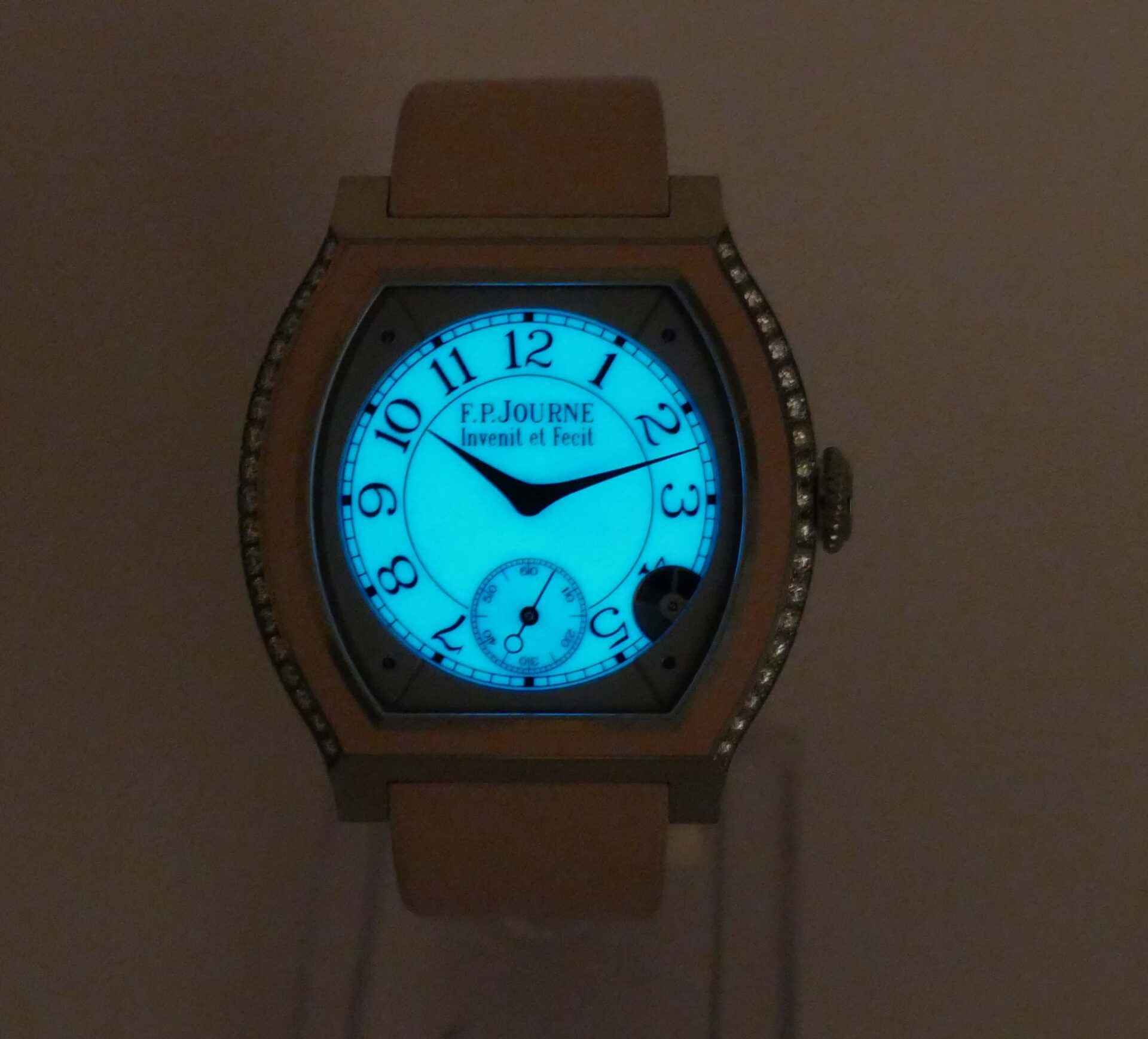Read Morethis watch is in excellent condition and comes with its complete set, the warranty card is dated december 25th, 2017. This is an extremely rare version featuring factory diamonds, with light pink ceramic inserts around the bezel and sides of the case, and rubber strap. Fp journe calls this color scheme “powder rose”. The entire dial glows in the dark, making it extremely easy to read at night. Also, the watch goes to “sleep” when it is not being worn, once you pick it back up it quickly adjusts itself to the correct time. The 40mm case is measured from top to bottom, the side to side width is 35mm.