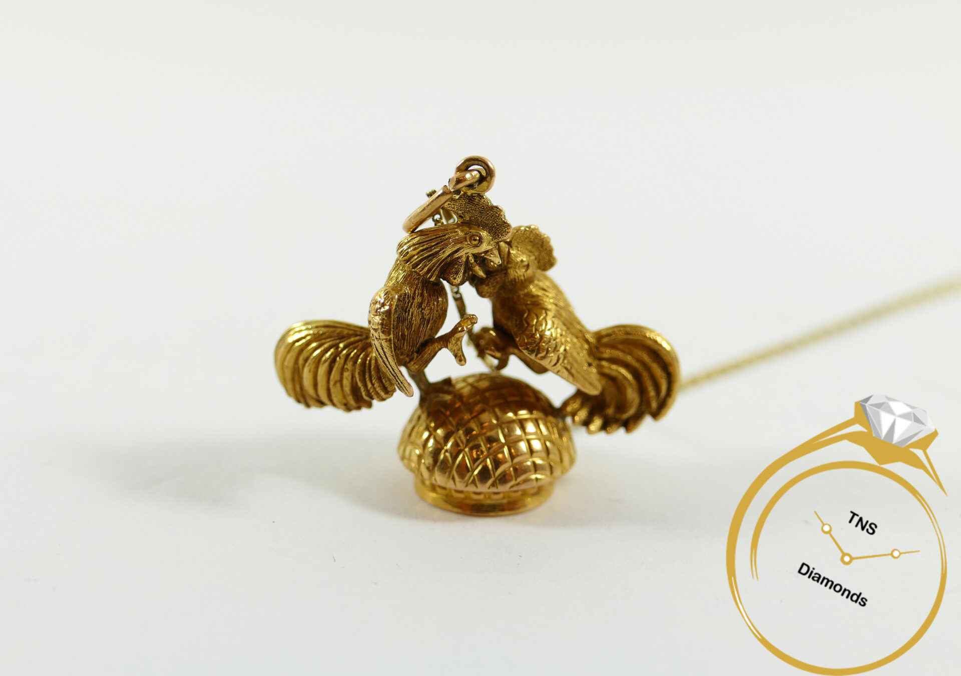 Read Morethis amazing custom made pendant is shaped as two fighting roosters, extremely detailed in solid 18k yellow gold. This is definitely a one of a kind piece of jewelry! this pendant doesn’t come with a chain, but we have a wide selection of chains that we can pair with it for you.