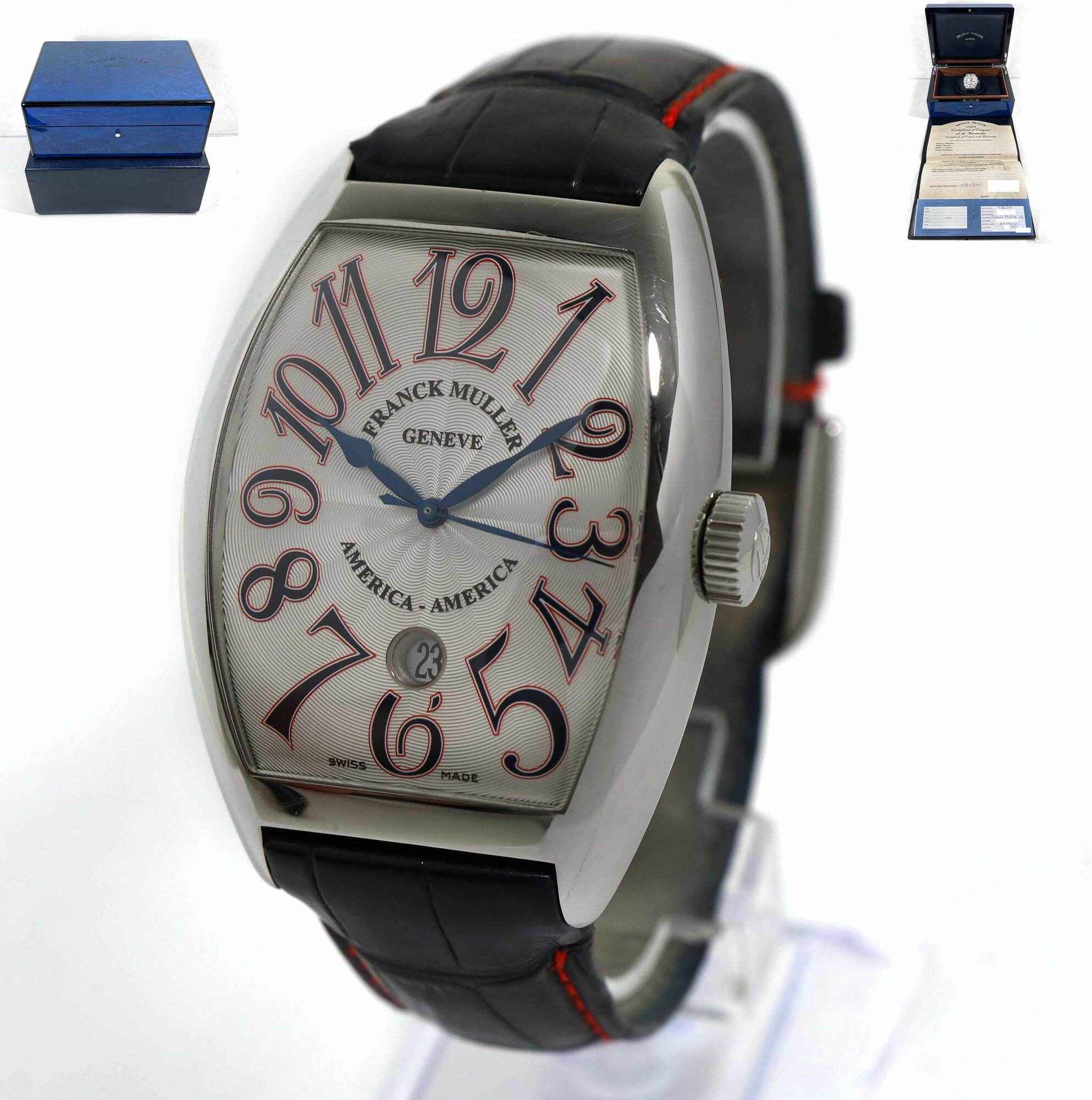 Read Morethis franck muller is in great overall condition showing some signs of wear on the case consistent with preowned watches. This comes with its box and warranty paper dated november 20th, 2010 as shown in the pictures attached. This watch is part of a limited edition with only 100 pieces released in this reference. This watch is in stock and available to ship immediately!