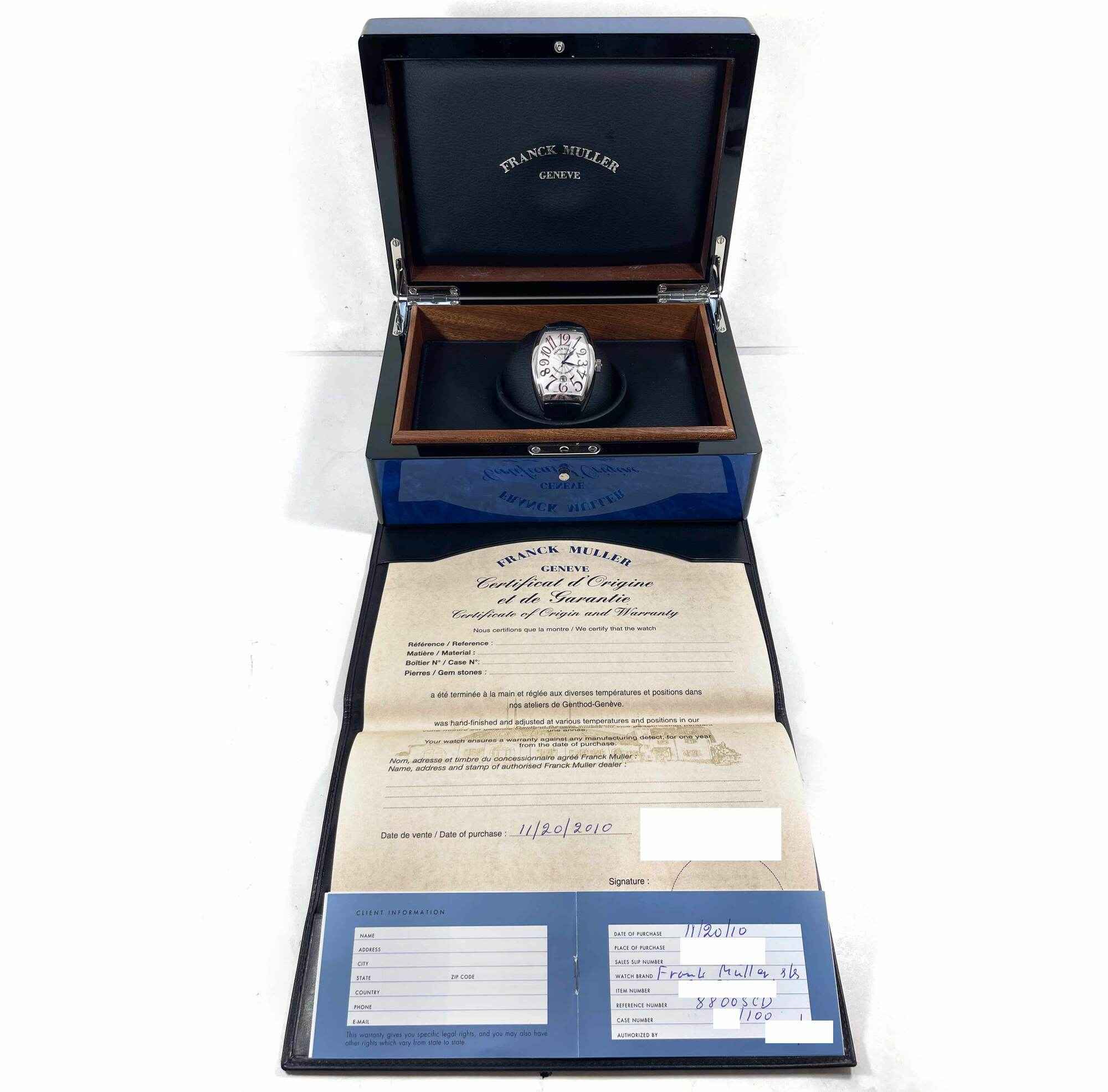 THIS FRANCK MULLER IS IN GREAT OVERALL CONDITION SHOWING SOME SIGNS OF WEAR ON THE CASE CONSISTENT WITH PREOWNED WATCHES. THIS COMES WITH ITS BOX AND WARRANTY PAPER DATED NOVEMBER 20TH, 2010 AS SHOWN IN THE PICTURES ATTACHED. THIS WATCH IS PART OF A LIMITED...