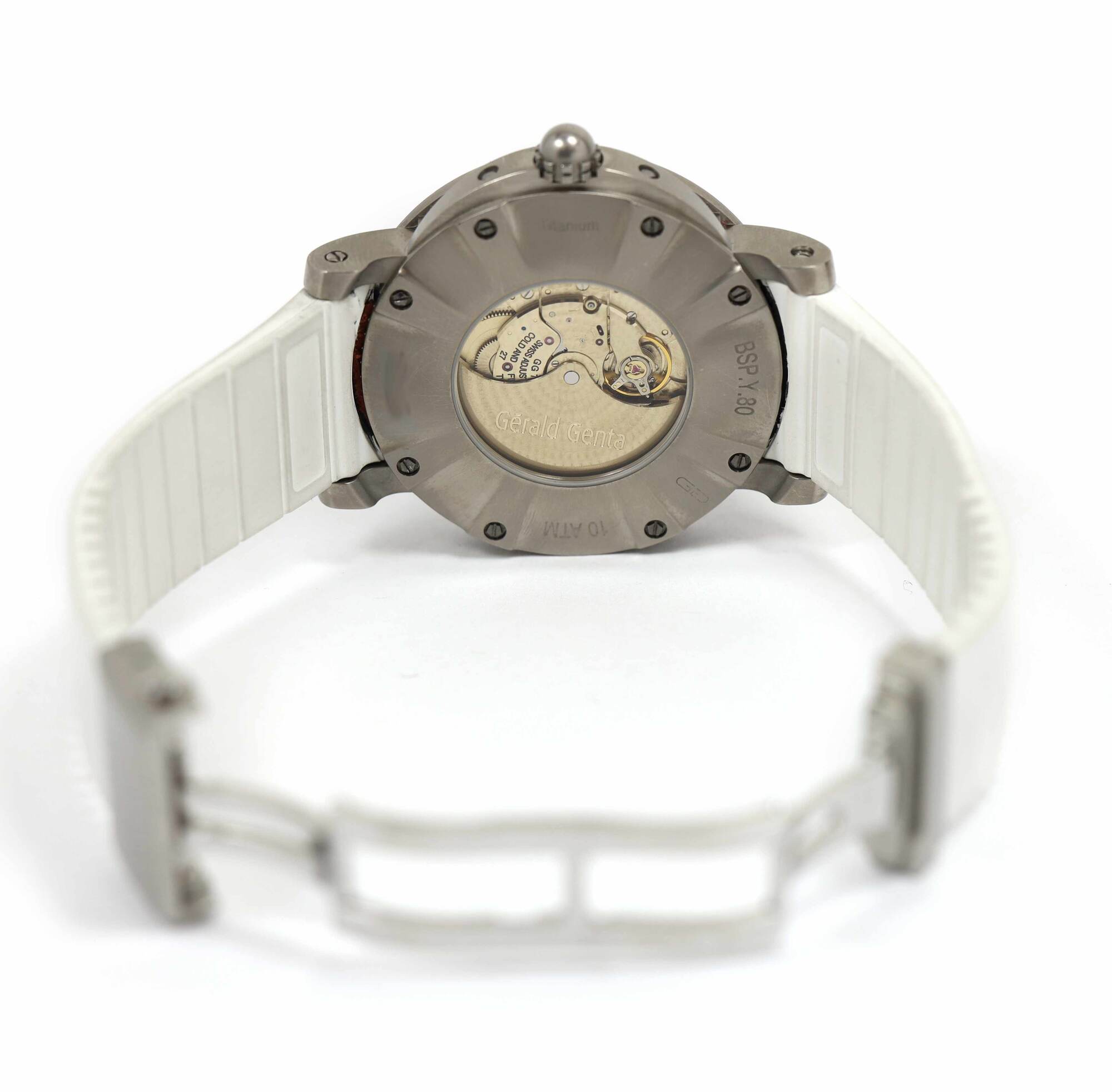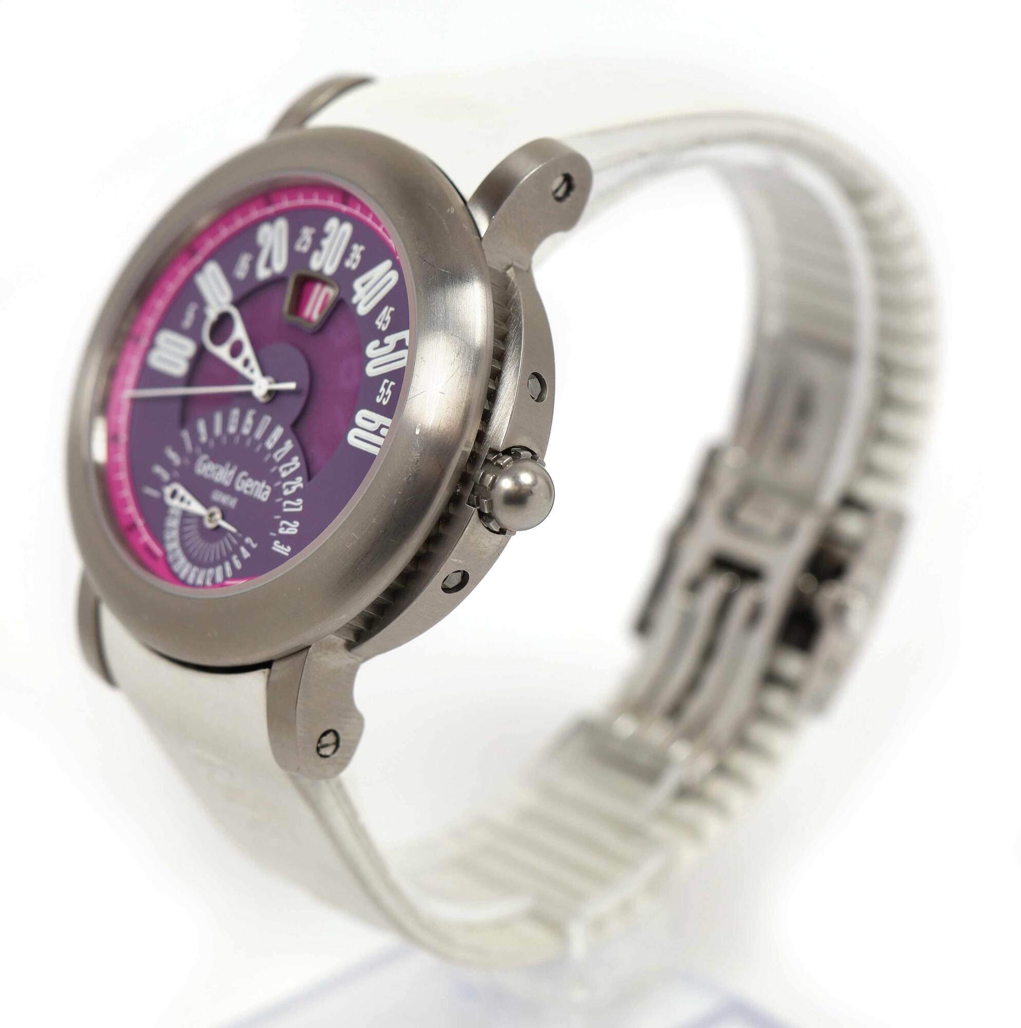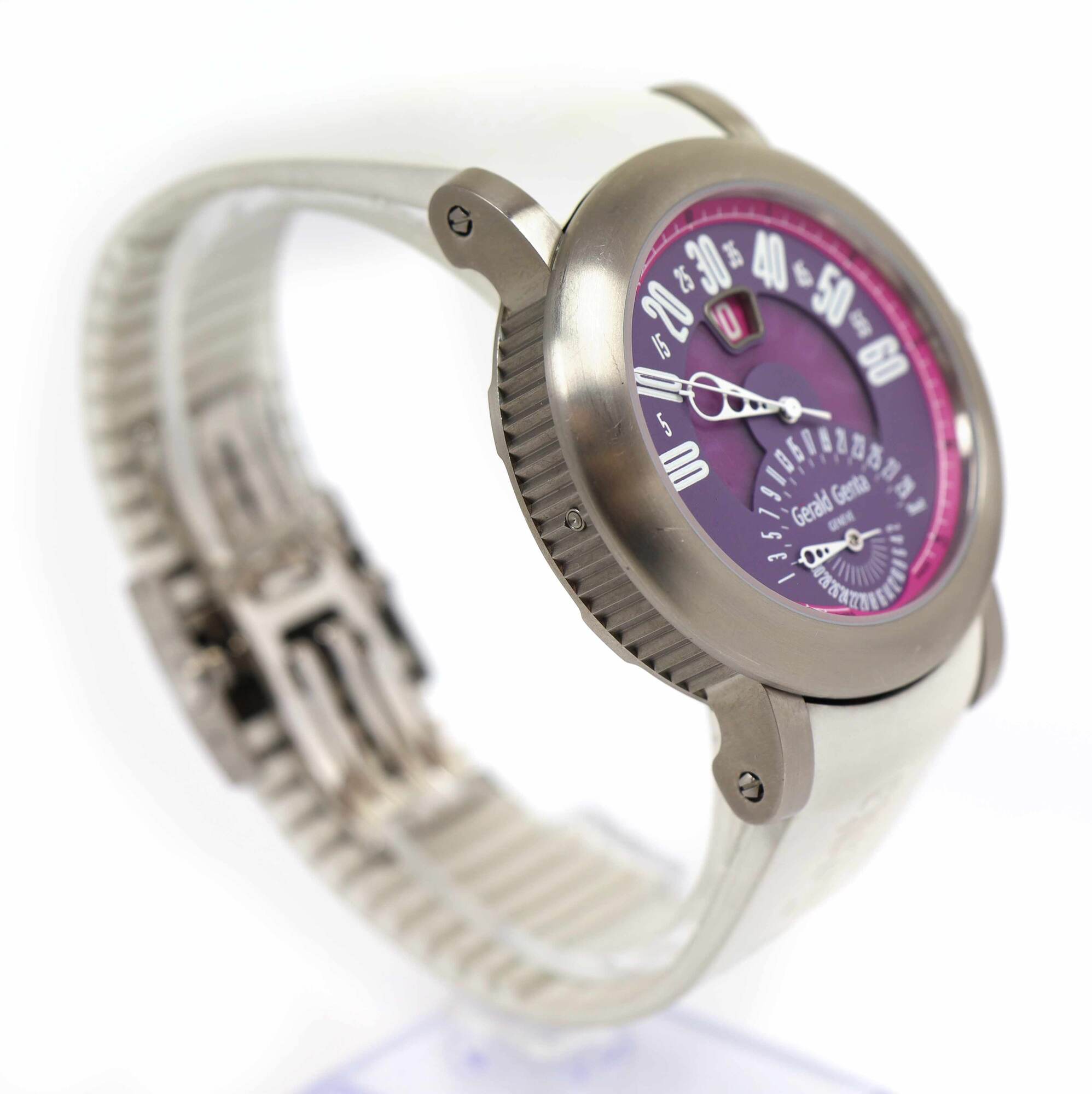 THIS GERALD GENTA WATCH IS IN GREAT OVERALL CONDITION AND COMES AS WATCH ONLY AS SHOWN IN THE PICTURES ATTACHED. THIS WATCH FEATURES A 45MM TITANIUM CASE THAT SURROUNDS A PINK/PURPLE DIAL AND COMES ON A WHITE RUBBER STRAP. THIS WATCH IS IN STOCK AND AVAILAB...