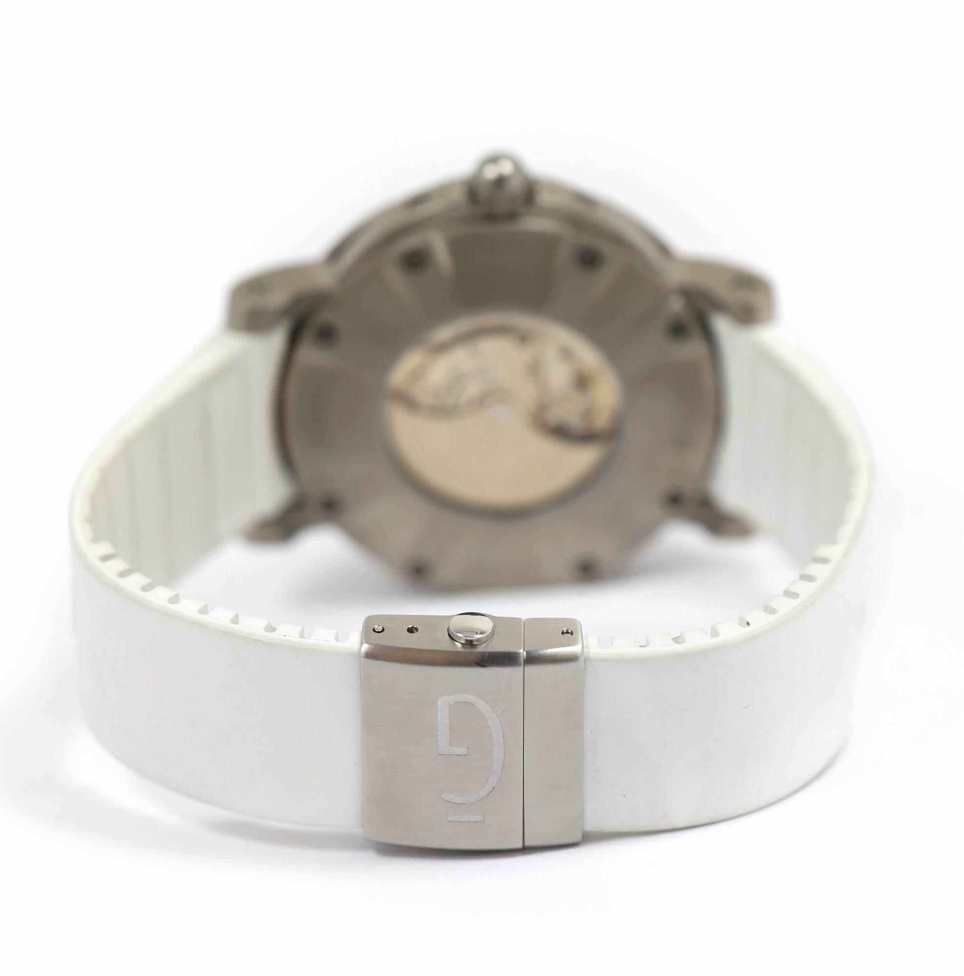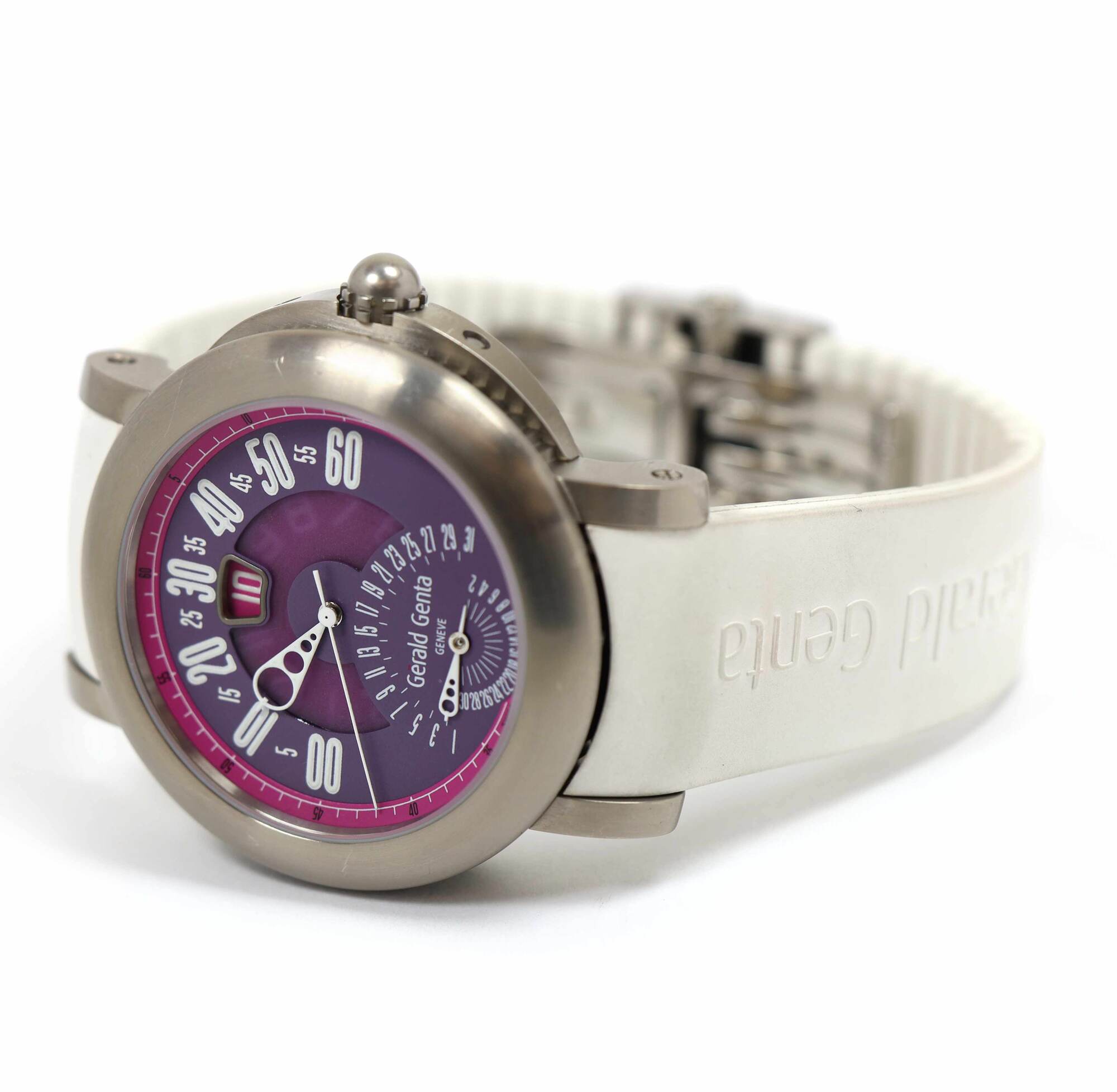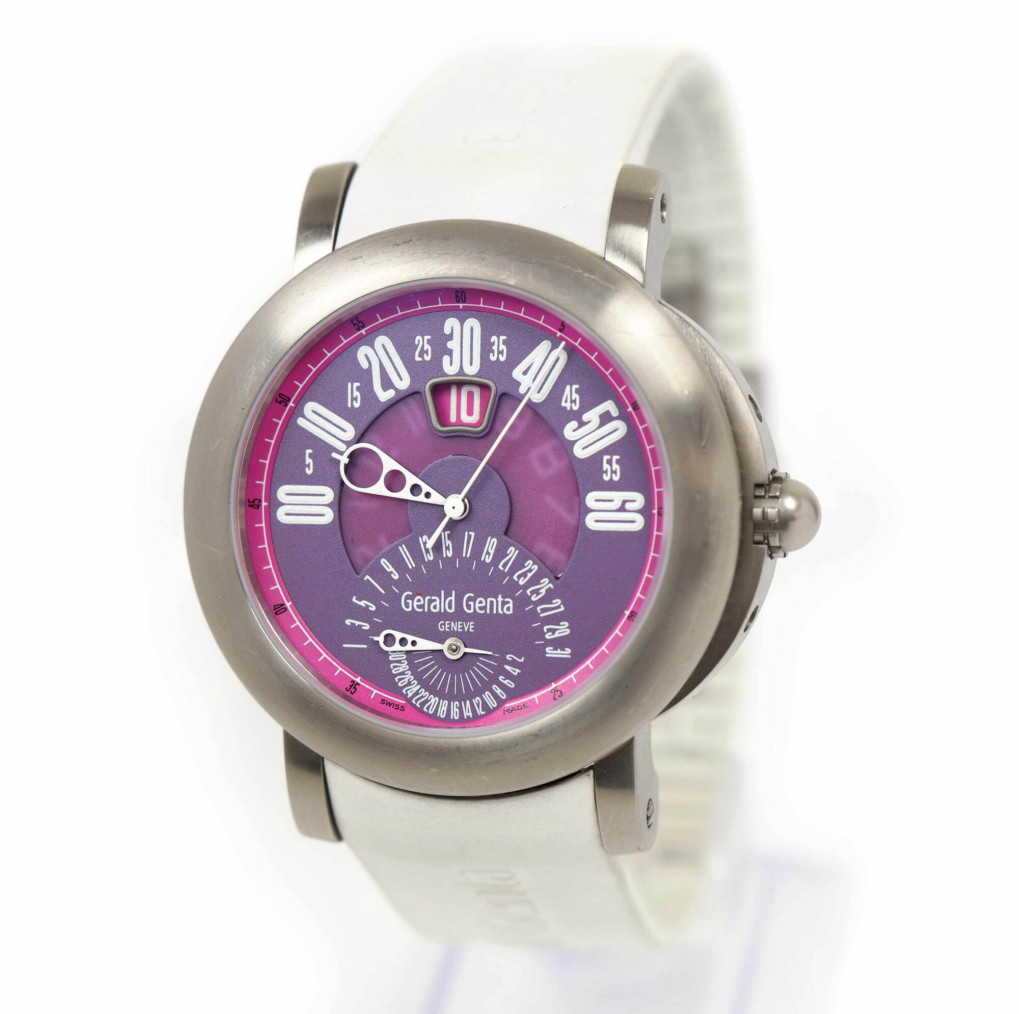 Read Morethis gerald genta watch is in great overall condition and comes as watch only as shown in the pictures attached. This watch features a 45mm titanium case that surrounds a pink/purple dial and comes on a white rubber strap. This watch is in stock and available to ship immediately!