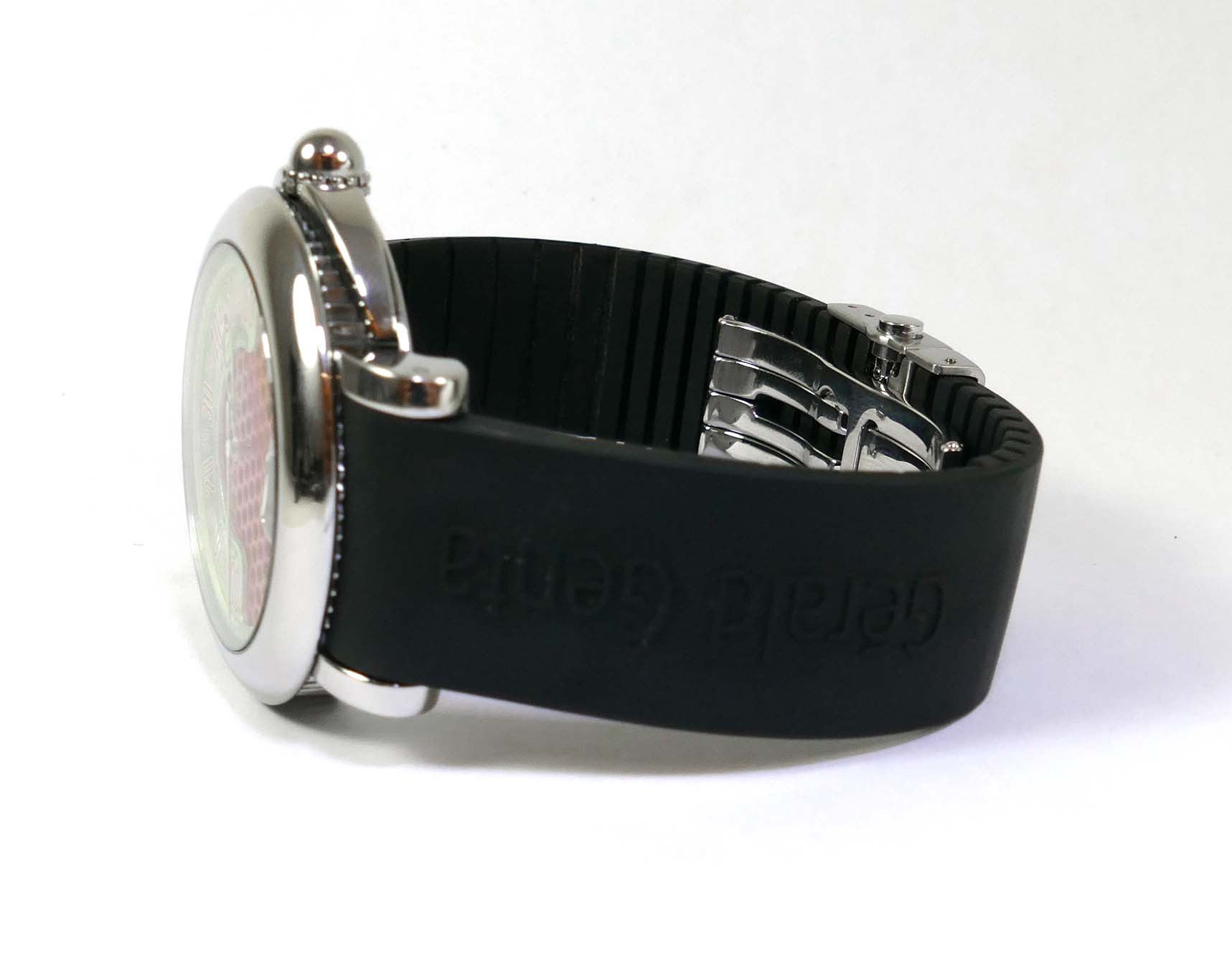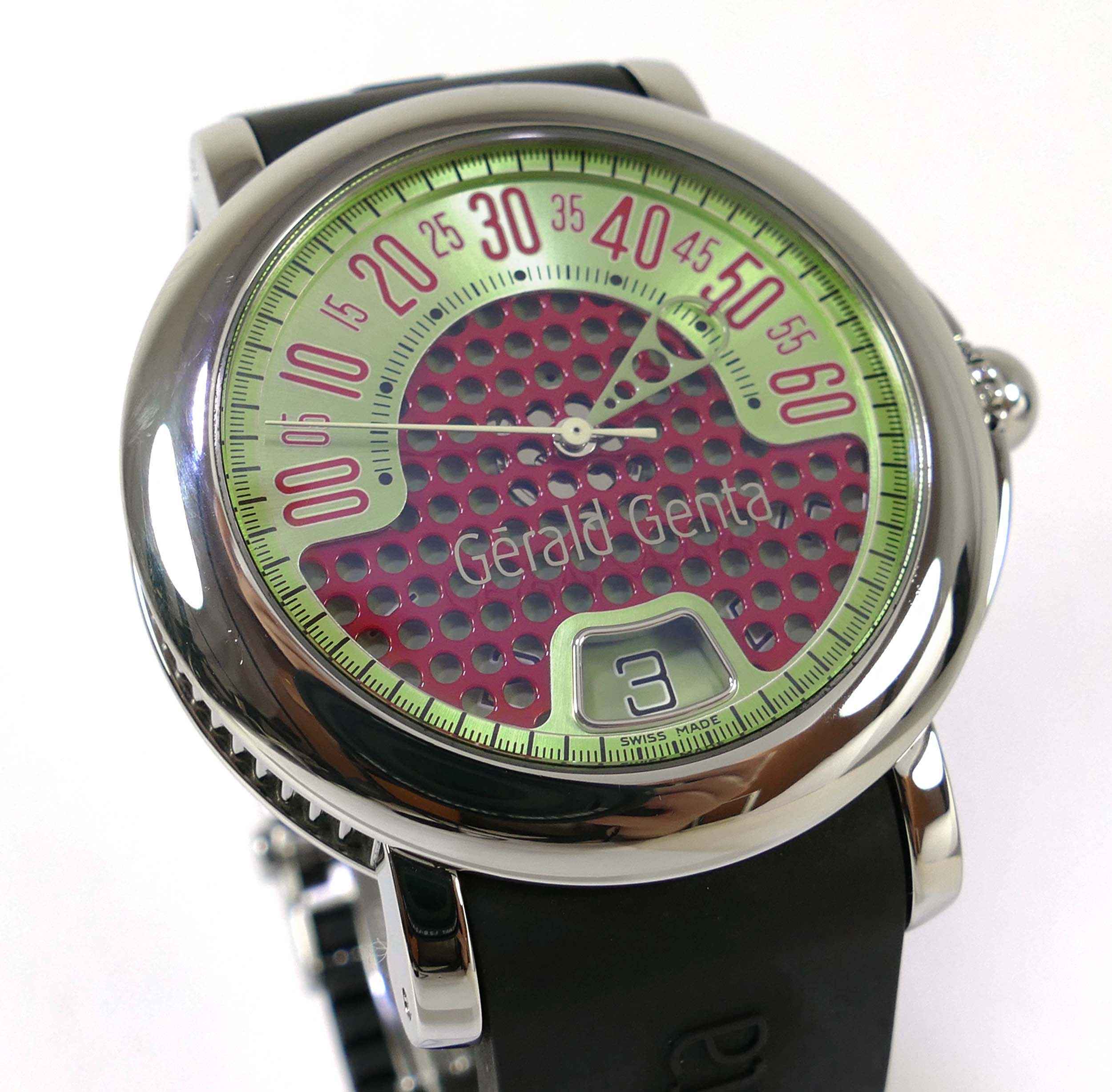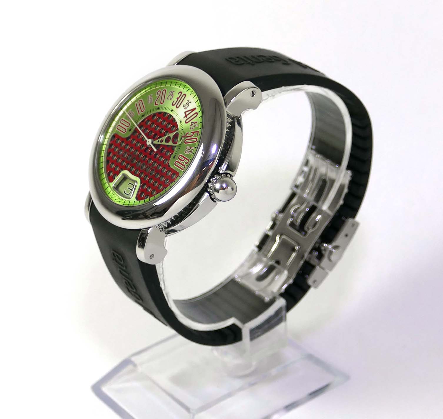 Read Morethis amazing watch features a very cool green and red dial. The first photo of the watch reads the time as 3:50 and 5 seconds. The bottom number is the hour, and once the minute hand reaches the 60 minute mark, it jumps back to 0, and the hour at the bottom changes. It is very neat to watch.