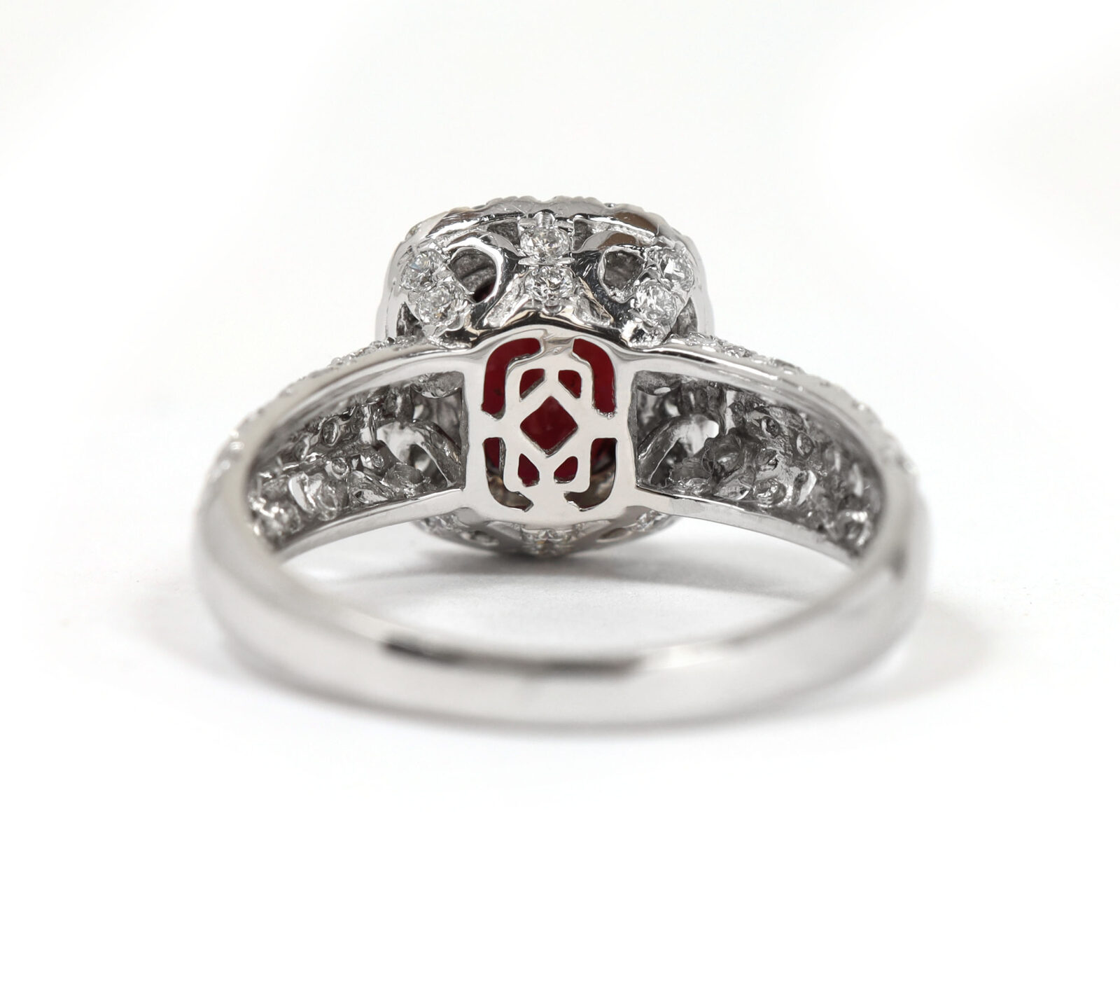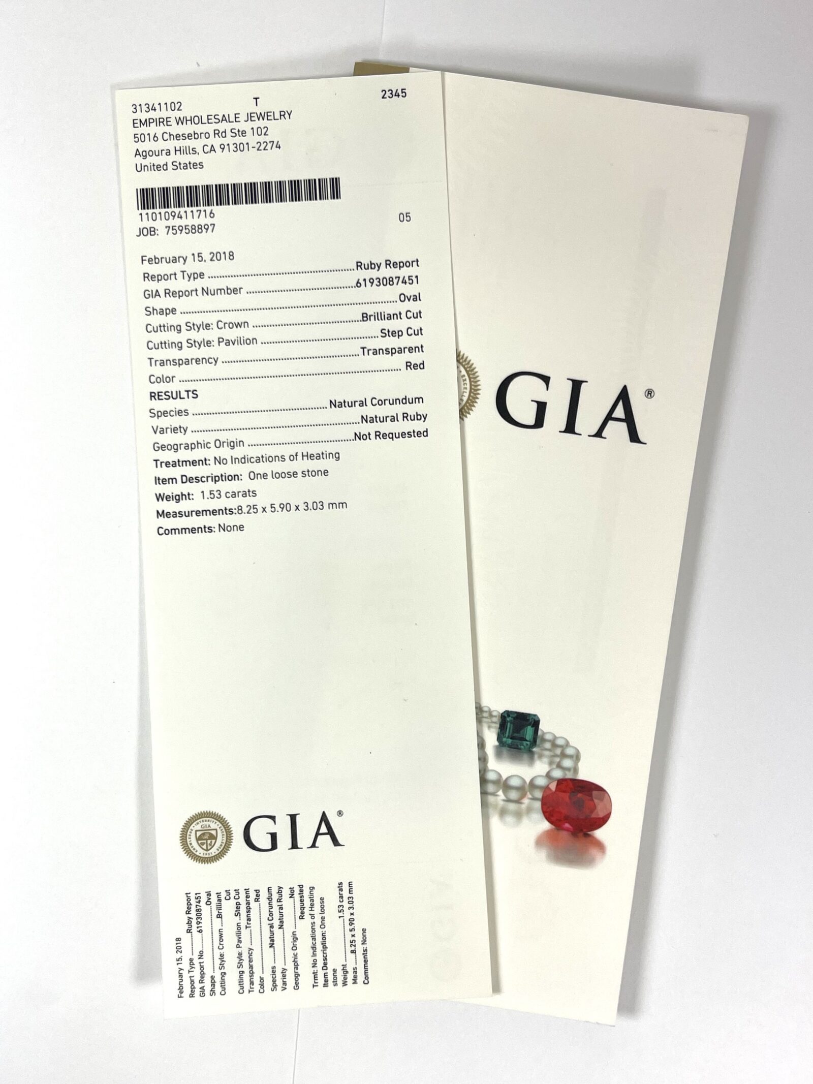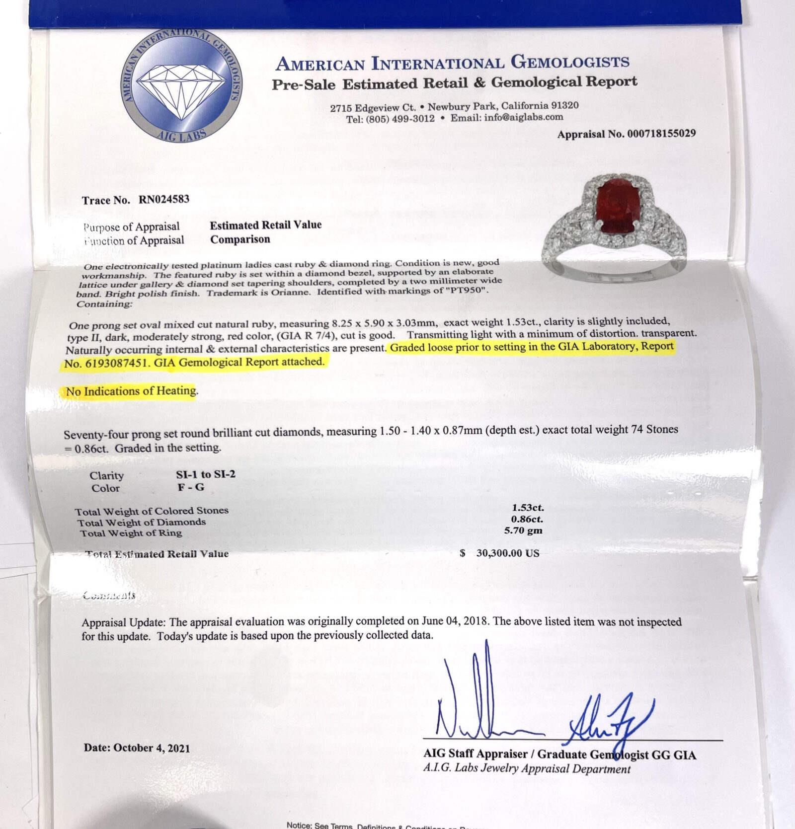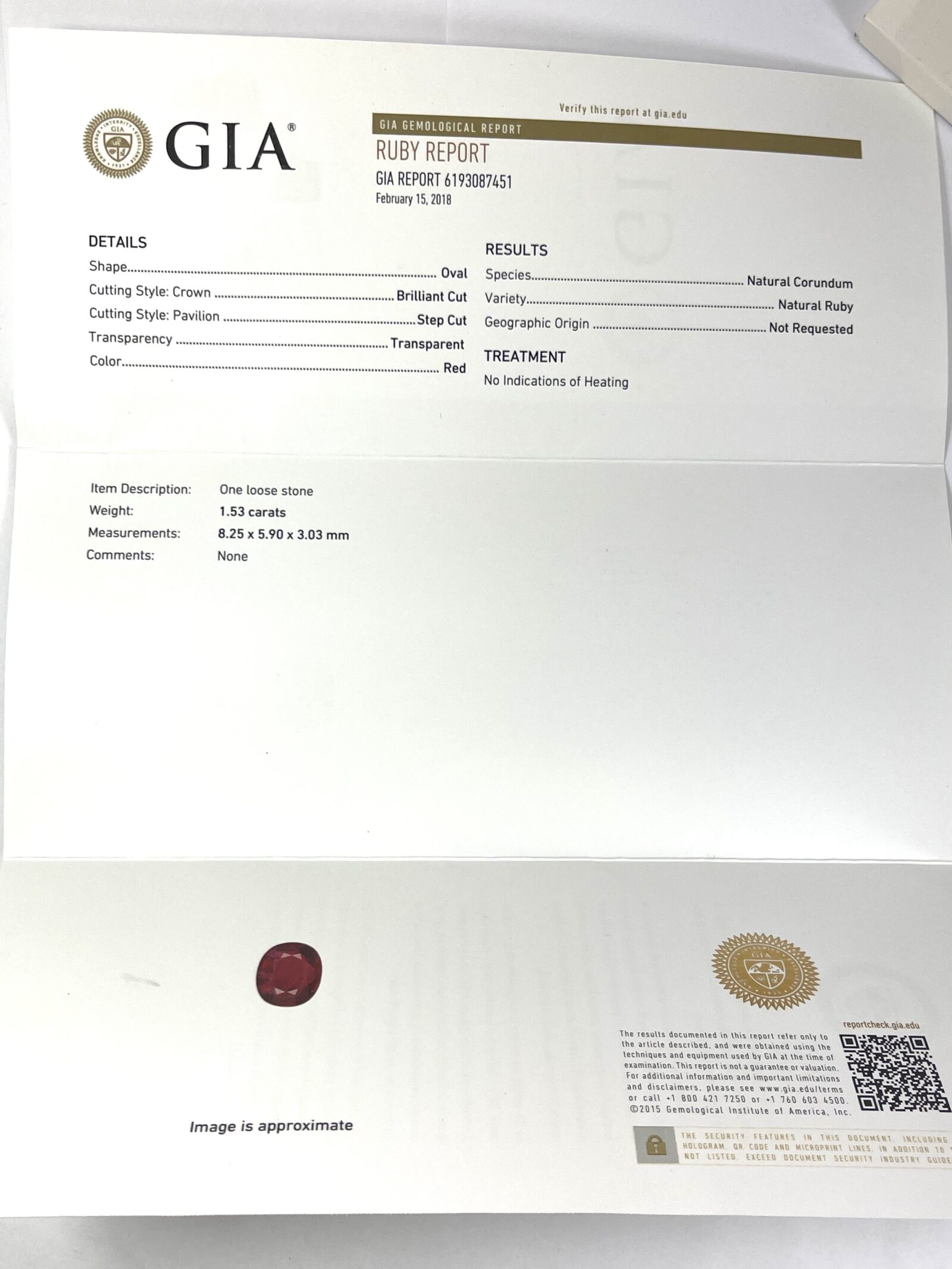 Metal: Platinum Gemstone: Ruby and Diamond Ring Size: 7 Band Width: 2mm Center Stone Gemstone: Ruby - GIA Report Included - No Treatments Color: Cut: Oval Carat Weight: 1.53 Carat Center Stone Measurements: 8.25 x 5.90 x 3.03 mm Side Stones Gemstone: Diamond ...