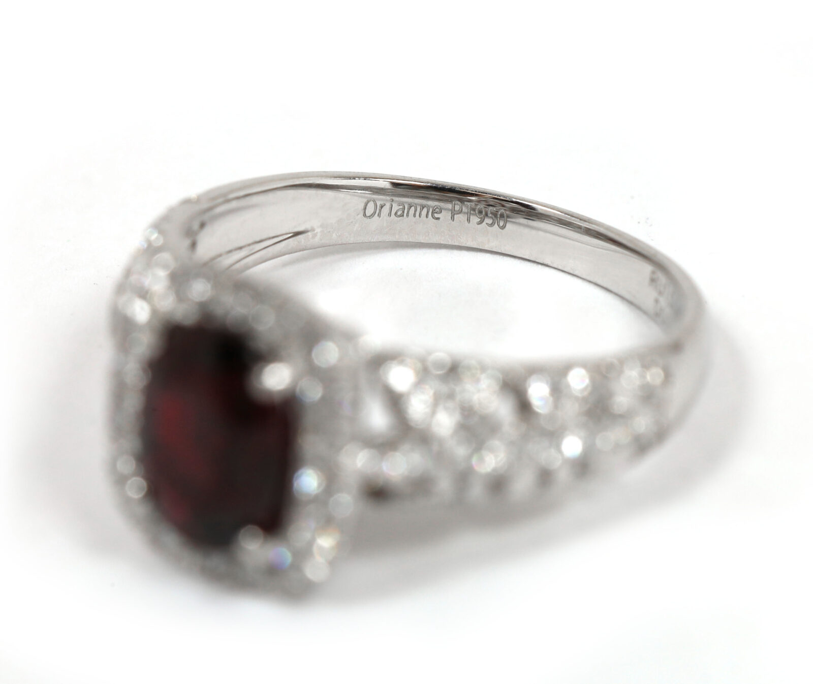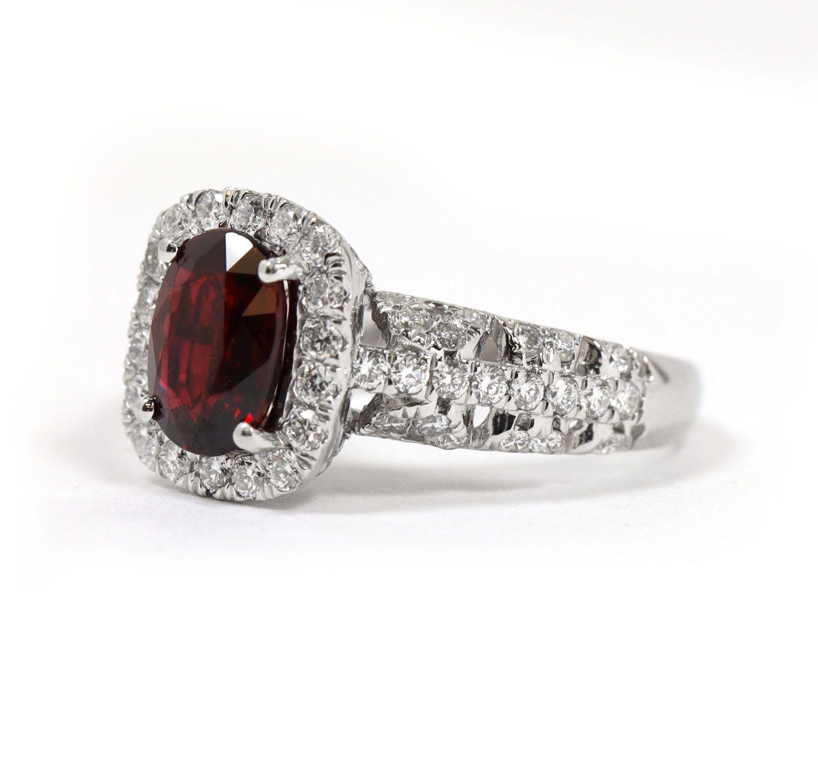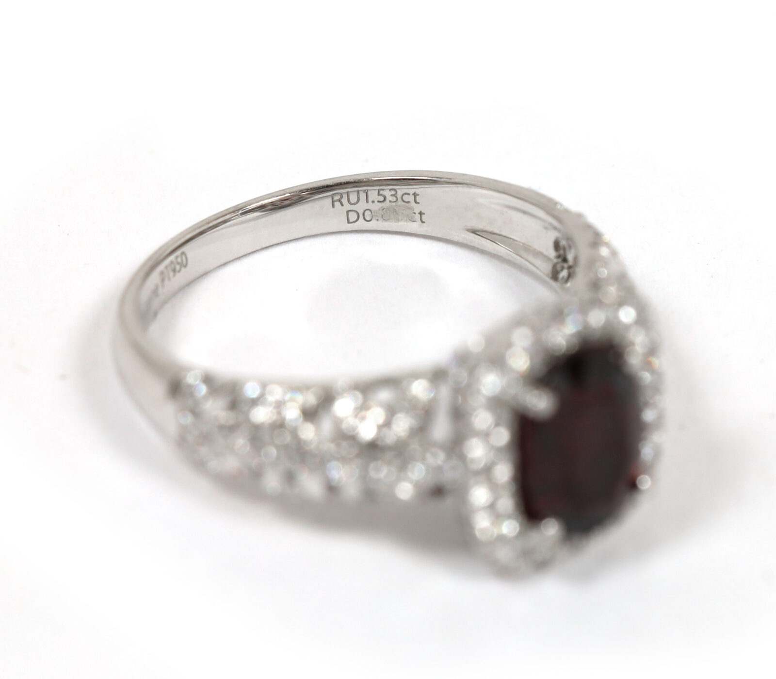 Read Moremetal: platinum gemstone: ruby and diamond ring size: 7 band width: 2mm center stone gemstone: ruby – gia report included – no treatments color: cut: oval carat weight: 1.53 carat center stone measurements: 8.25 x 5.90 x 3.03 mm side stones gemstone: diamond side stone carat weight: approximately 0.86 carats clarity: si1/si2 color: f/g cut: round buy with confidence from tns diamonds, a trusted and established jeweler with a brick-and-mortar storefront and over 40 years of combined experience in the ethical watch and jewelry trade. At tns diamonds, we are proud to have trusted gia graduate gemologists on staff, ensuring that every piece of jewelry meets the highest standards of quality and craftsmanship. With our expertise and commitment to ethical practices, you can shop with peace of mind knowing you’re receiving a genuine product. If you have any questions or need further assistance, please don’t hesitate to reach out!