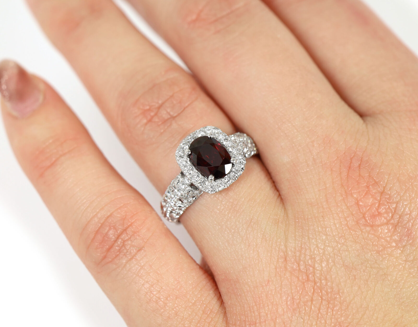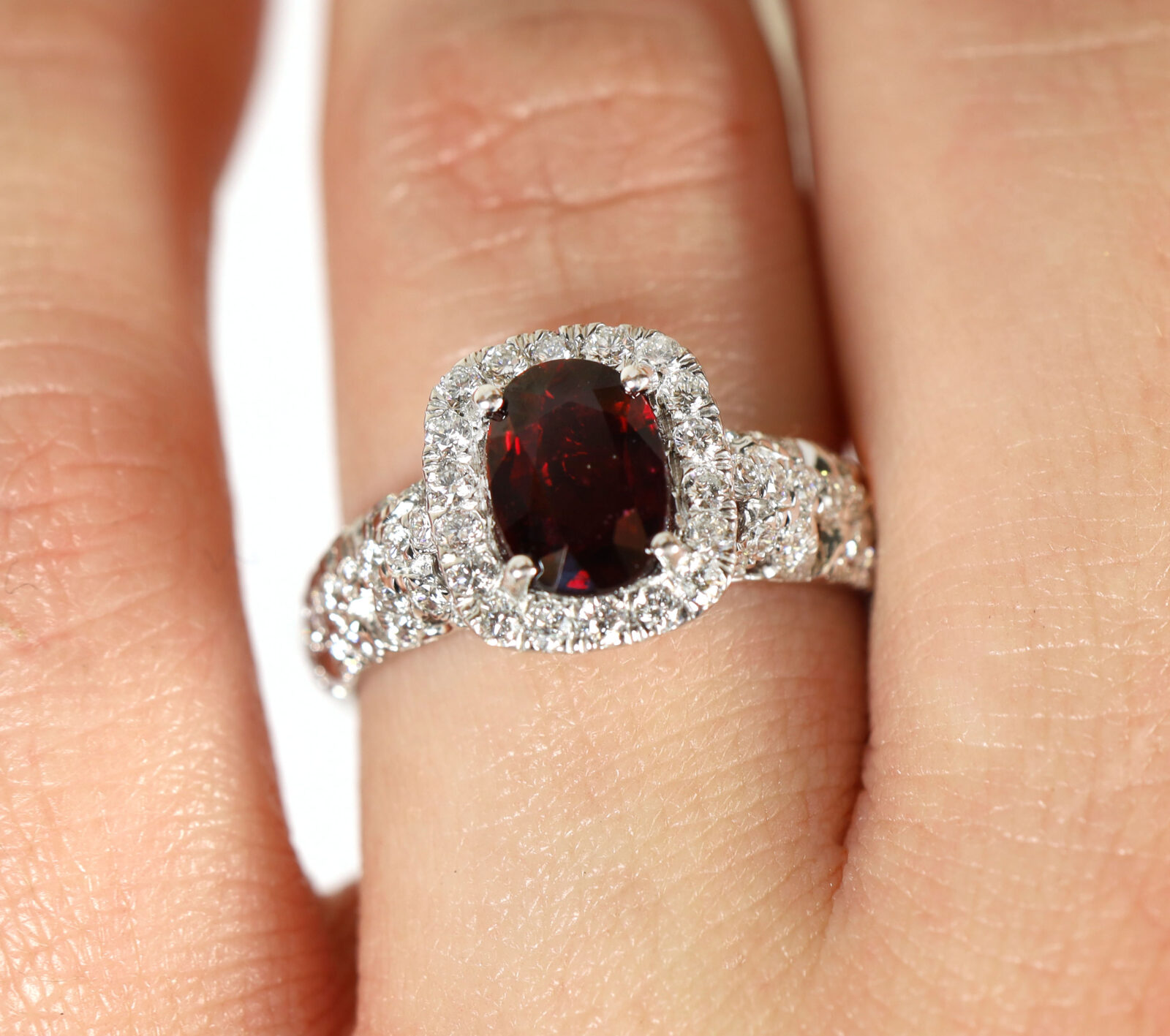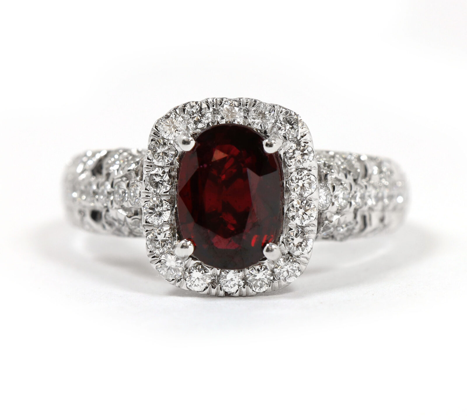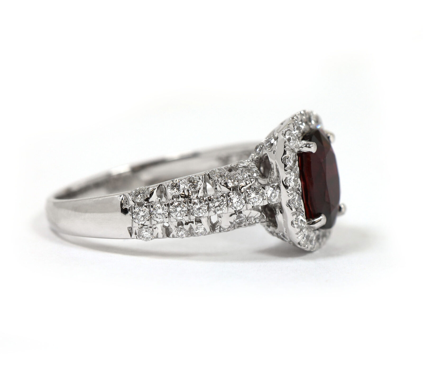 Read Moremetal: platinum gemstone: ruby and diamond ring size: 7 band width: 2mm center stone gemstone: ruby – gia report included – no treatments color: cut: oval carat weight: 1.53 carat center stone measurements: 8.25 x 5.90 x 3.03 mm side stones gemstone: diamond side stone carat weight: approximately 0.86 carats clarity: si1/si2 color: f/g cut: round buy with confidence from tns diamonds, a trusted and established jeweler with a brick-and-mortar storefront and over 40 years of combined experience in the ethical watch and jewelry trade. At tns diamonds, we are proud to have trusted gia graduate gemologists on staff, ensuring that every piece of jewelry meets the highest standards of quality and craftsmanship. With our expertise and commitment to ethical practices, you can shop with peace of mind knowing you’re receiving a genuine product. If you have any questions or need further assistance, please don’t hesitate to reach out!