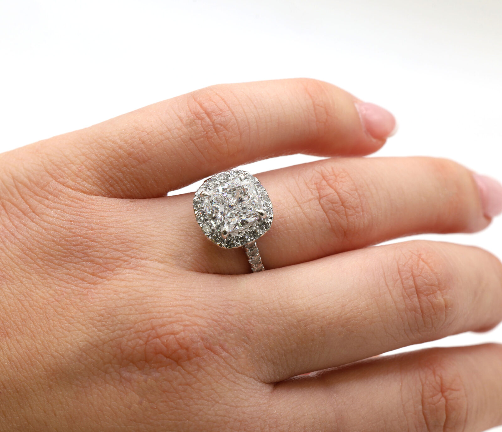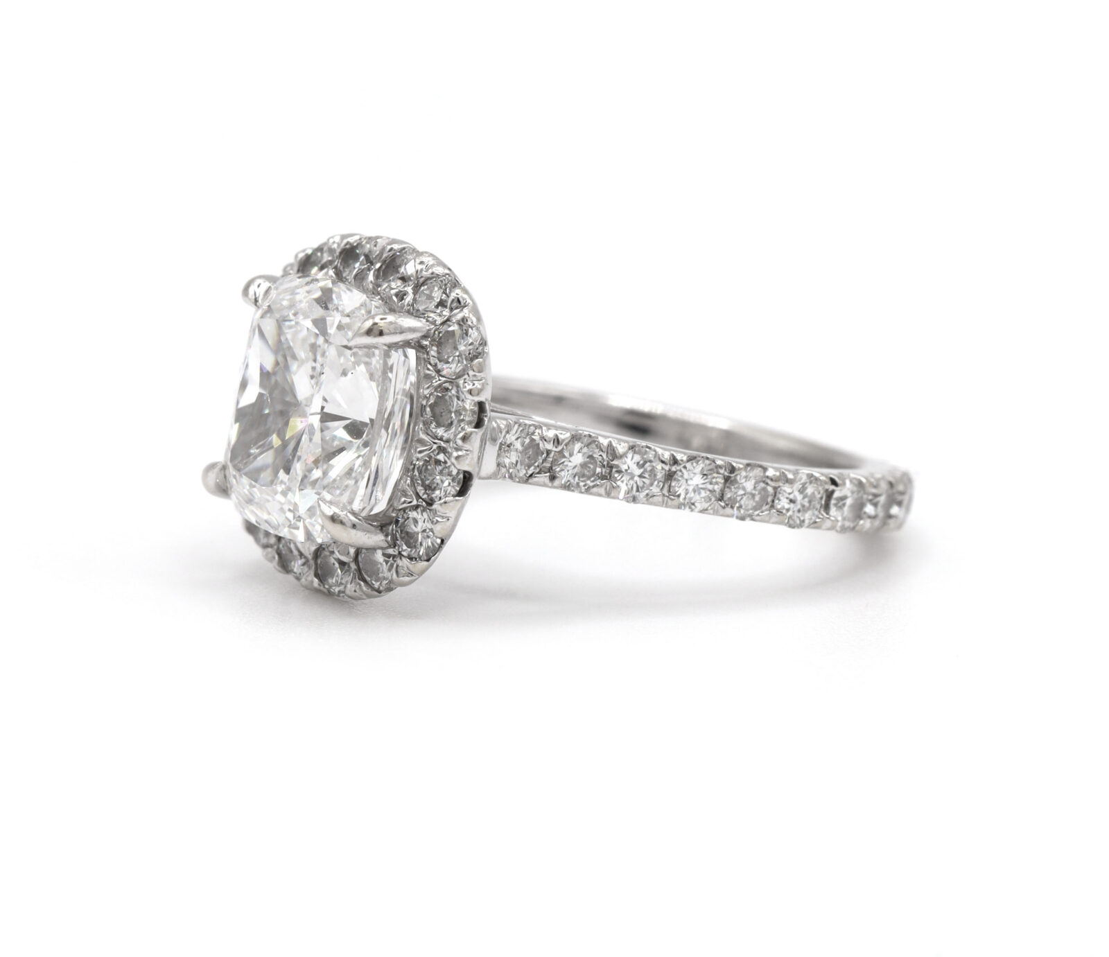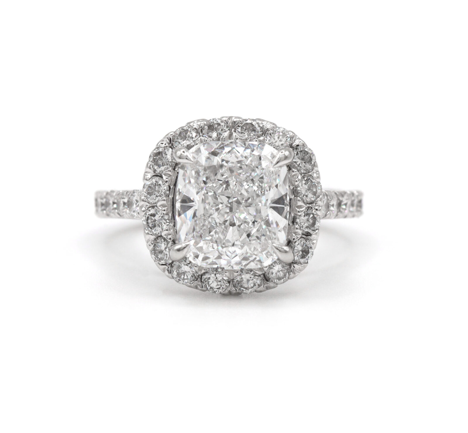celebrate forever with this elegant 14k white gold engagement ring, featuring a gia-certified 3.33-carat elongated cushion-cut diamond. With d color, vs2 clarity, and exceptional brilliance, the center stone is enhanced by a sparkling diamond halo and a 2mm band adorned with 0.85 carats of d color, si2 clarity side stones for added radiance. Metal: 14k white gold band width: 2mm size: 5.5 total diamond carat weight: 4.18 carat center stone: gia graded diamond center stone carat weight: 3.33 carat color: d clarity: vs2 cut: elongated modified brilliant cushion side stones: diamond side stone carat weight: 0.85 carat clarity: si2 color: d