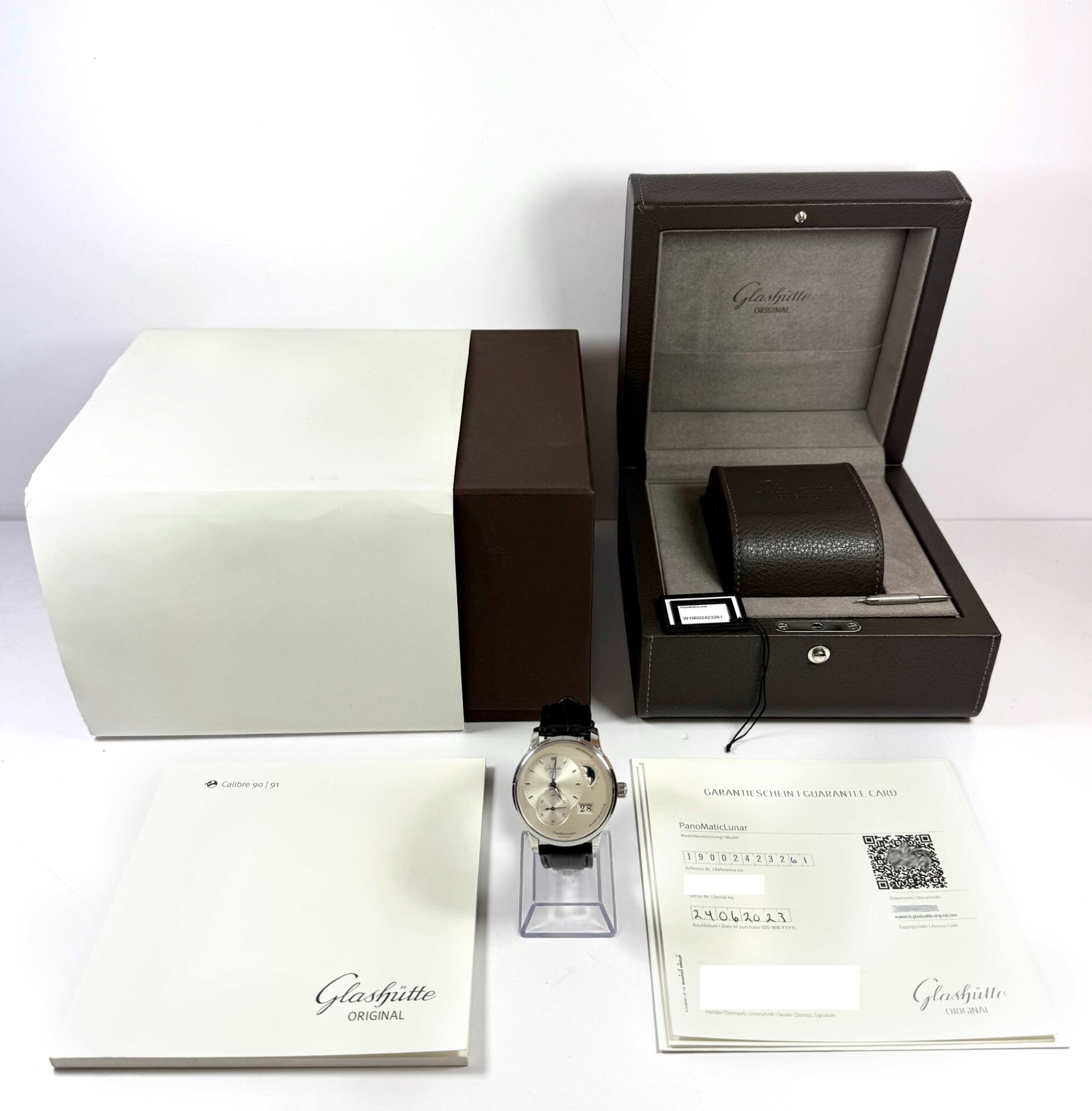 this glashutte watch is in excellent condition and comes with its box, booklets, hang tag, and warranty paper dated june 24th, 2023 as shown in the pictures attached. This watch is in stock and available to ship immediately!