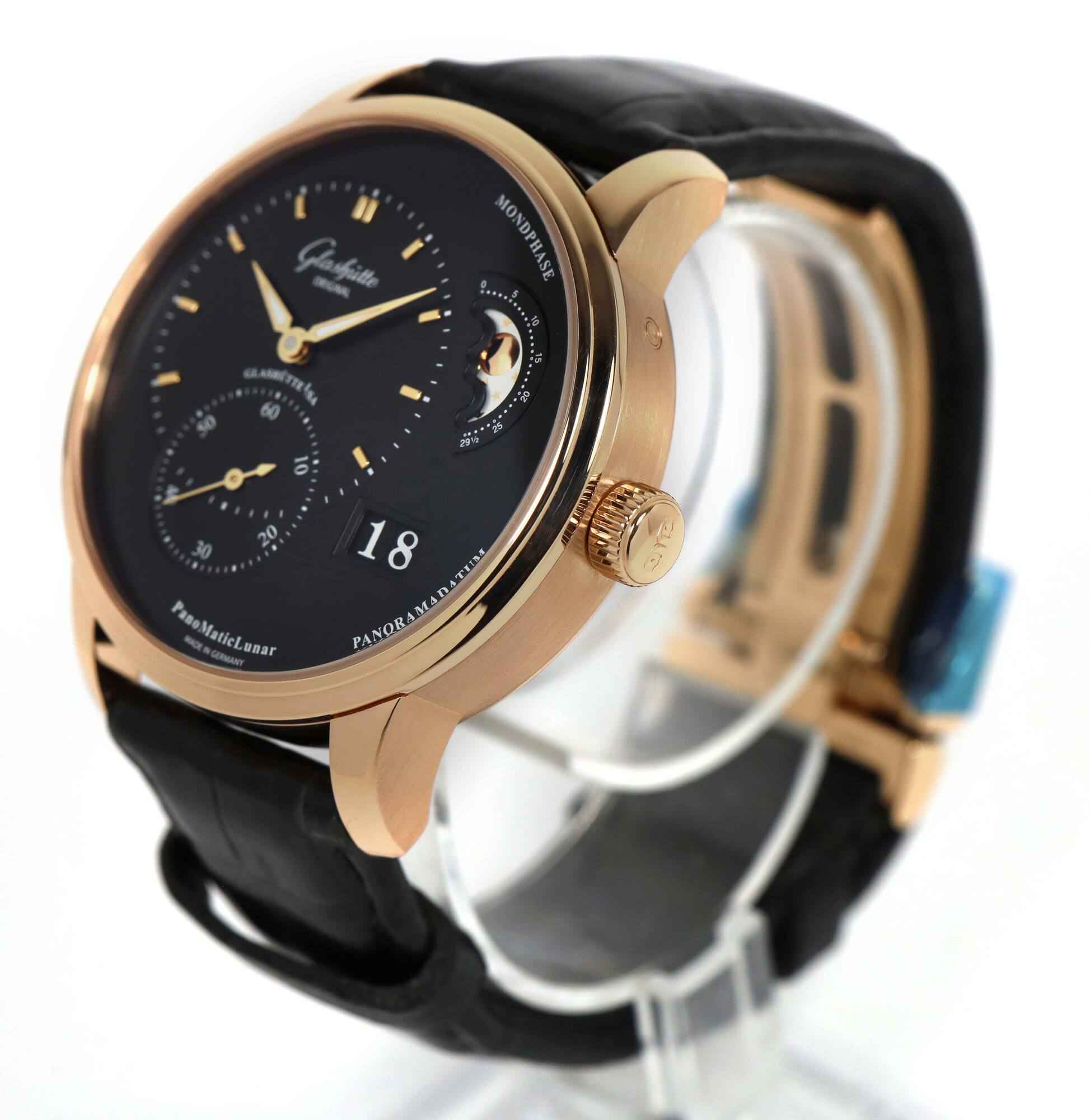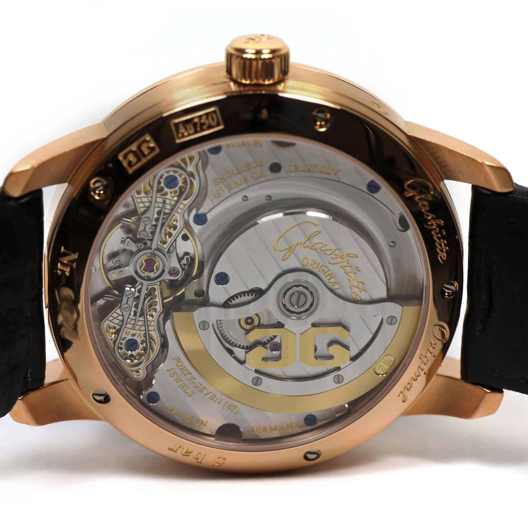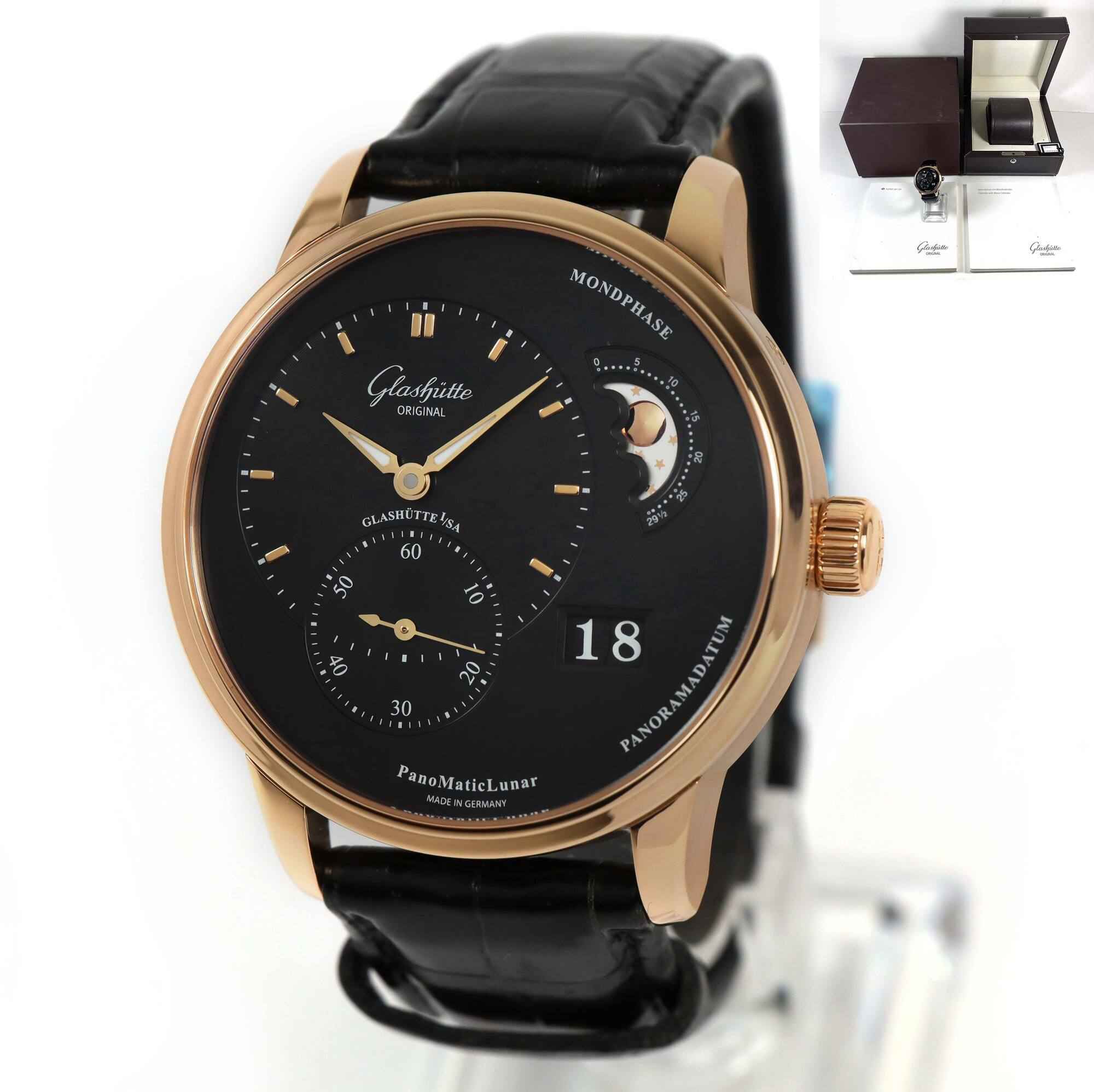 Read Morethis glashutte is in super condition and was just recently serviced by glashutte original in september, 2023 as shown in the pictures attached. This watch comes with its box, booklets, hang tag, and warranty paper dated march 22nd, 2016. This watch features a 40mm 18k rose gold case surrounding a black dial and comes on a black crocodile strap with an 18k rose gold deployant buckle. The watch functions include hours, minutes, small-seconds, date, and moonphase. This watch is in stock and available to ship immediately!