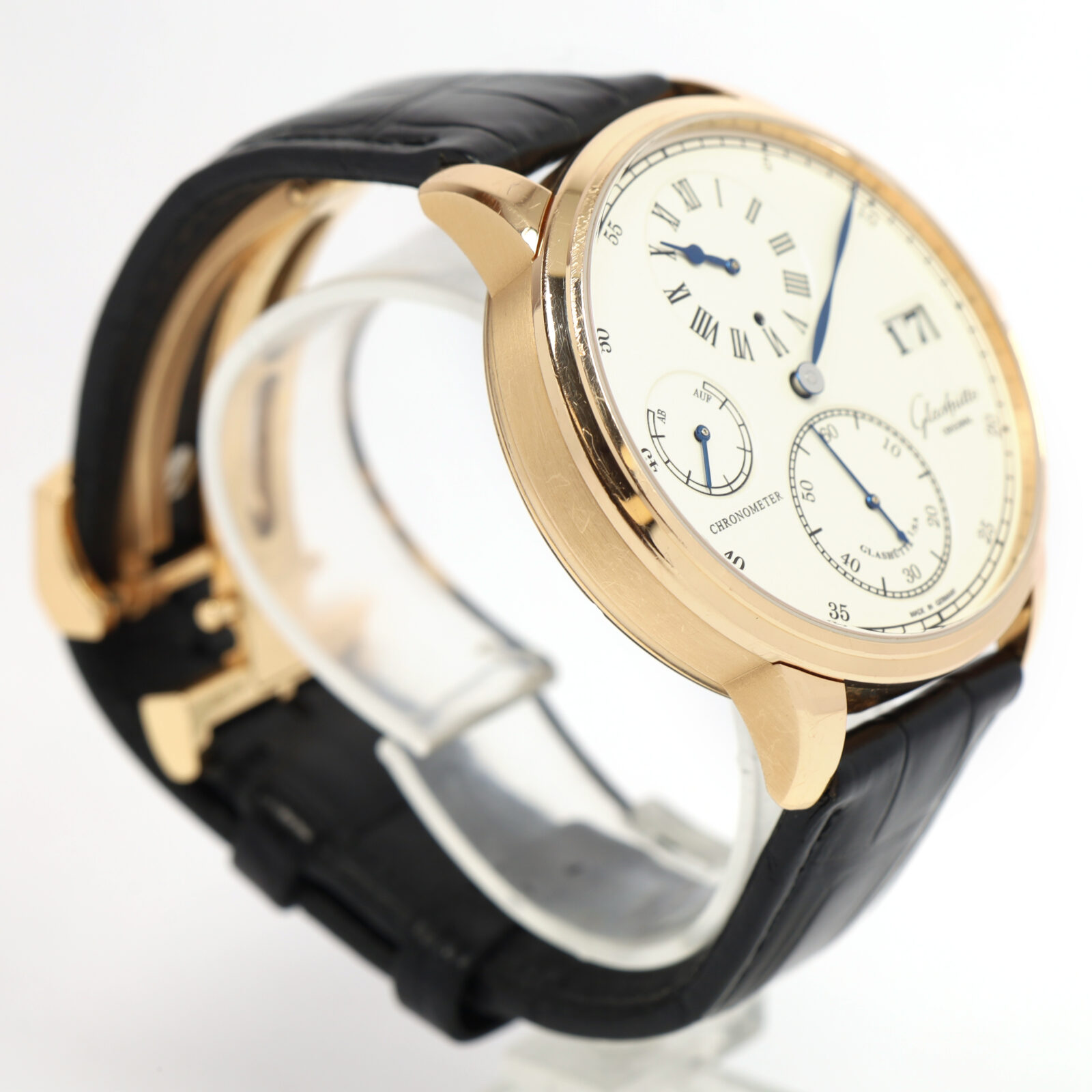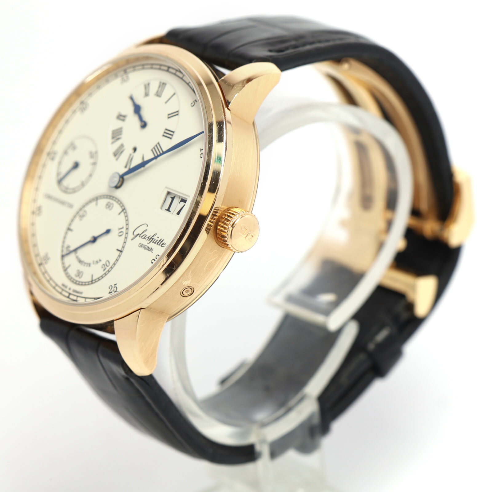 this glashutte watch is in excellent overall condition showing some signs of surface wear consistent with preowned watches. This comes as watch only and is in stock and available to ship immediately!