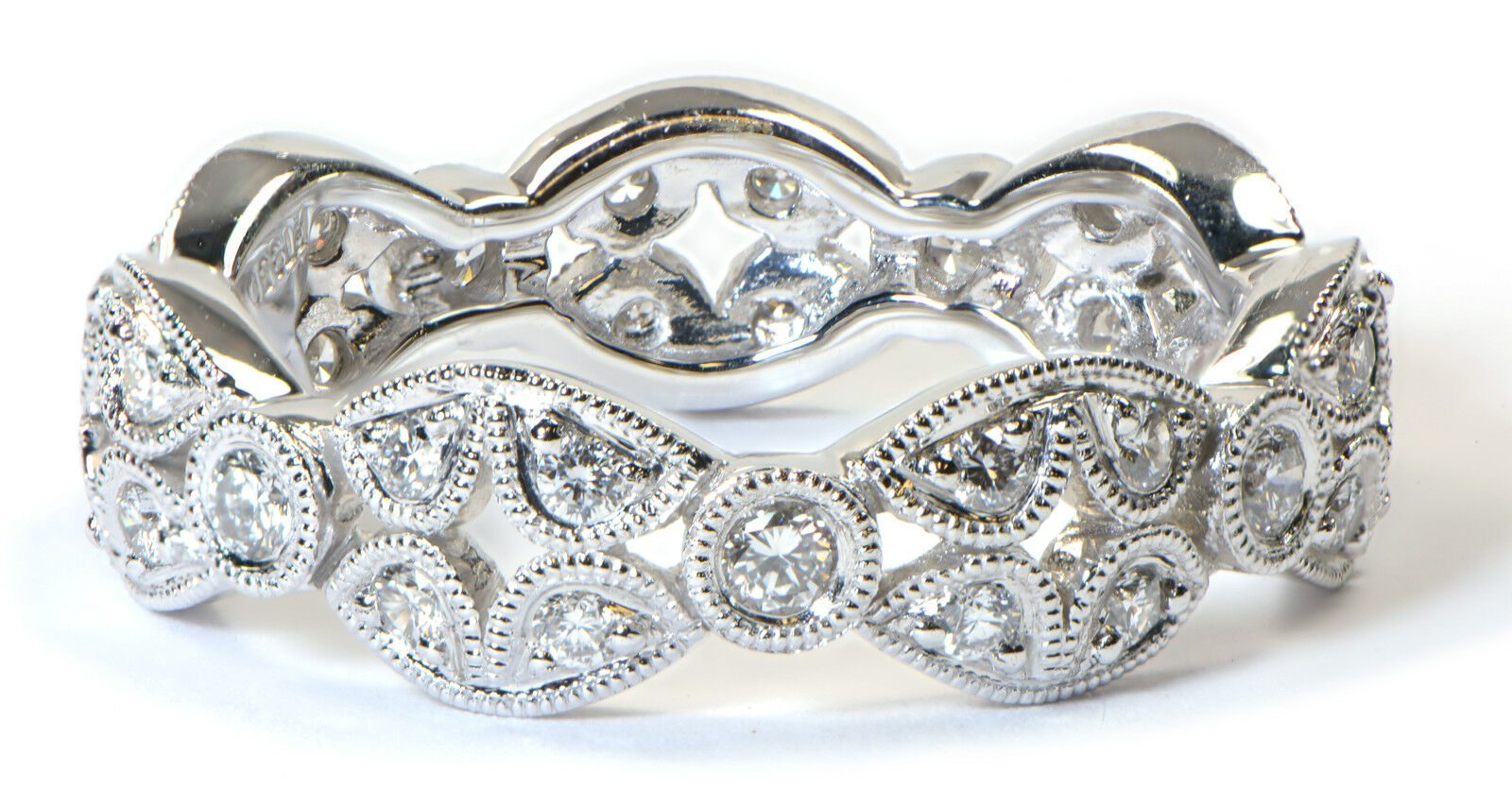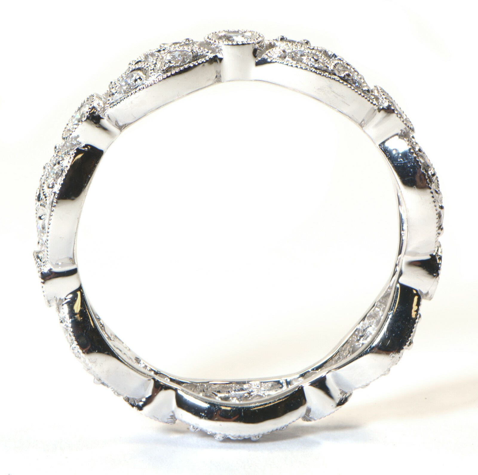 this gorgeous platinum eternity wedding band features an amazing art deco design with diamonds set around the entire ring. This ring is very unique and sure to stand out from standard wedding bands.