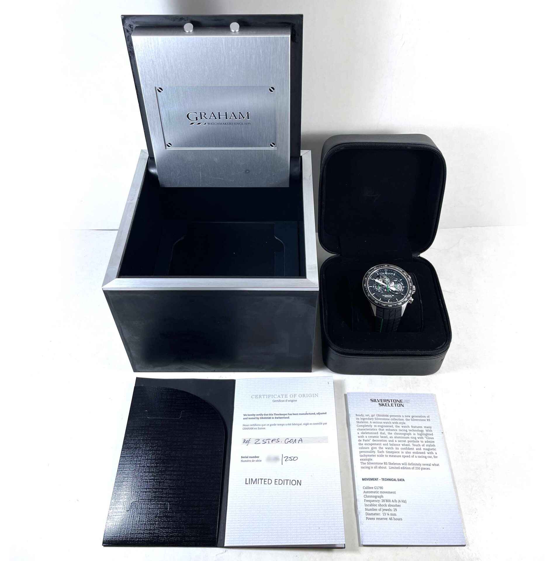Read Morethis graham watch is in excellent condition and comes with its box, papers, and warranty booklet as shown in the pictures attached. This watch is part of a limited edition with only 250 pieces produced and is in stock and available to ship immediately!