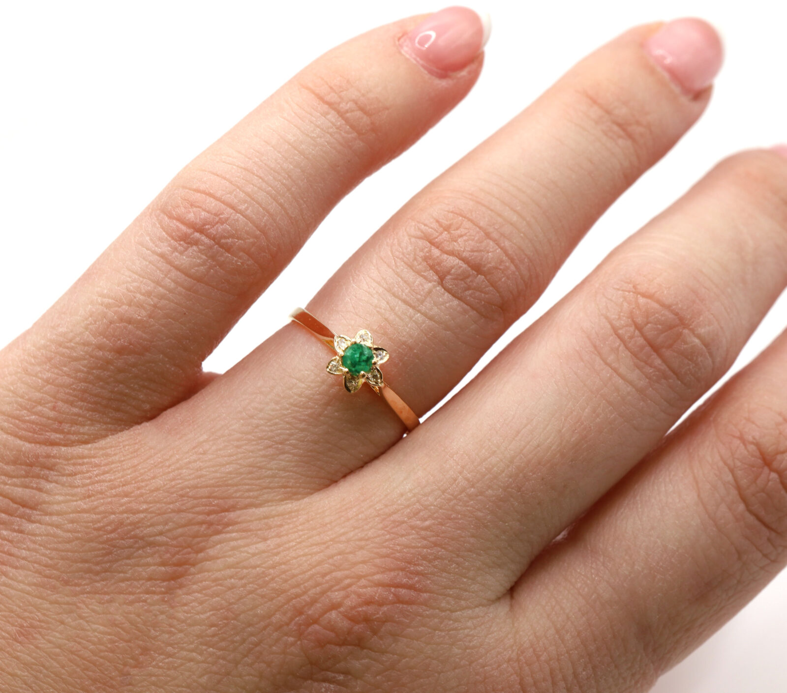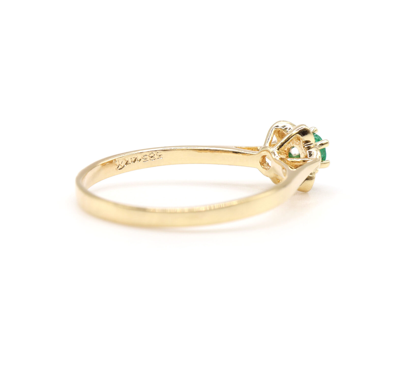 Metal: 14k Yellow Gold Band Width: 1.5mm Size: 5.5 Center Stone Gemstone: Emerald Color: Green Side Stone Gemstone: Diamond Cut: Round Brilliant