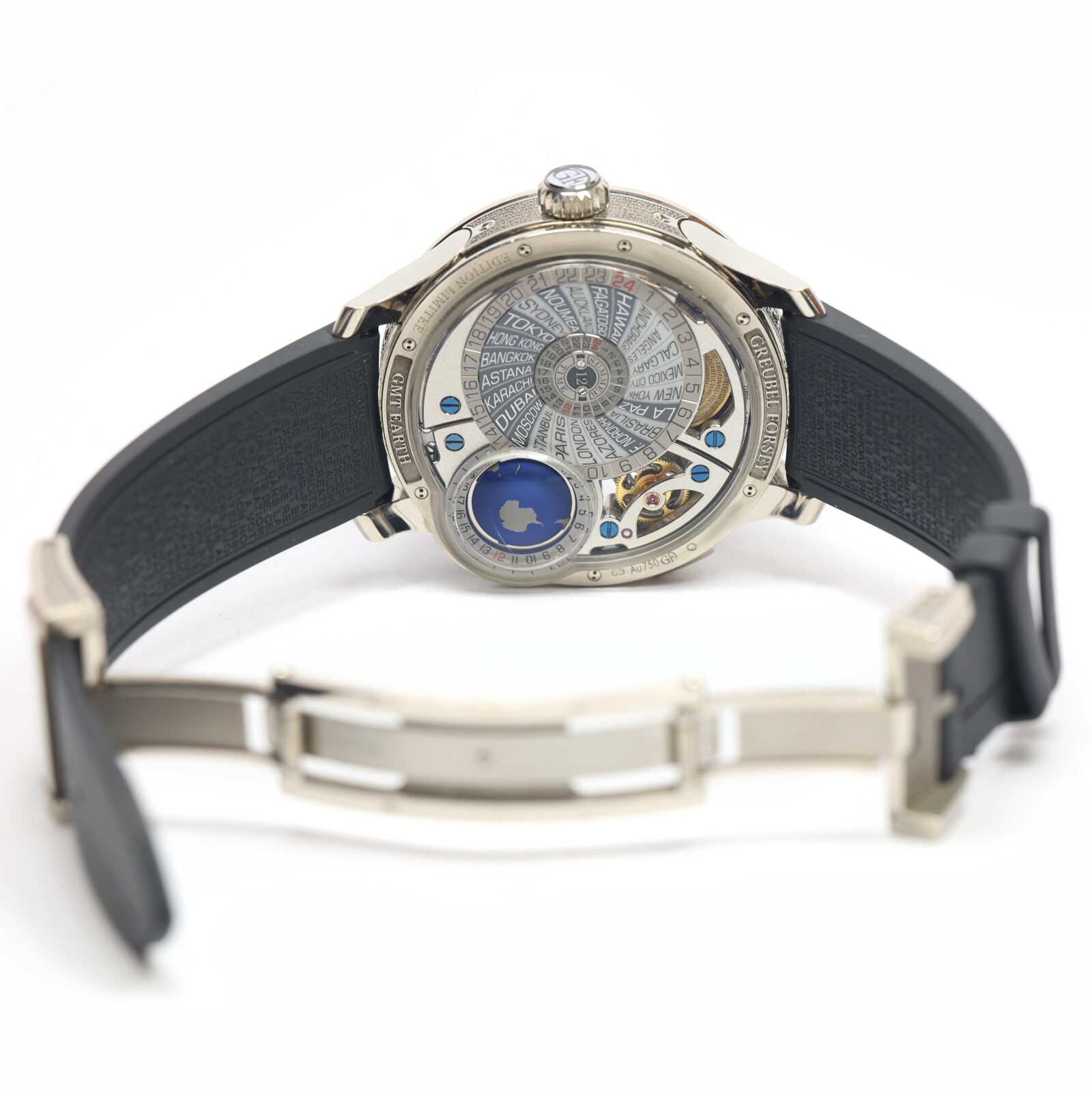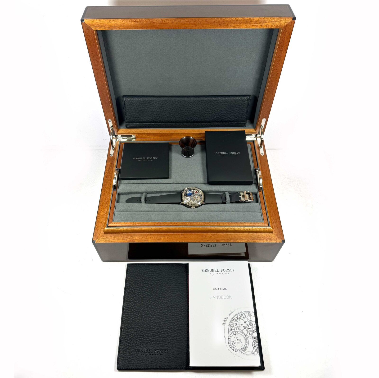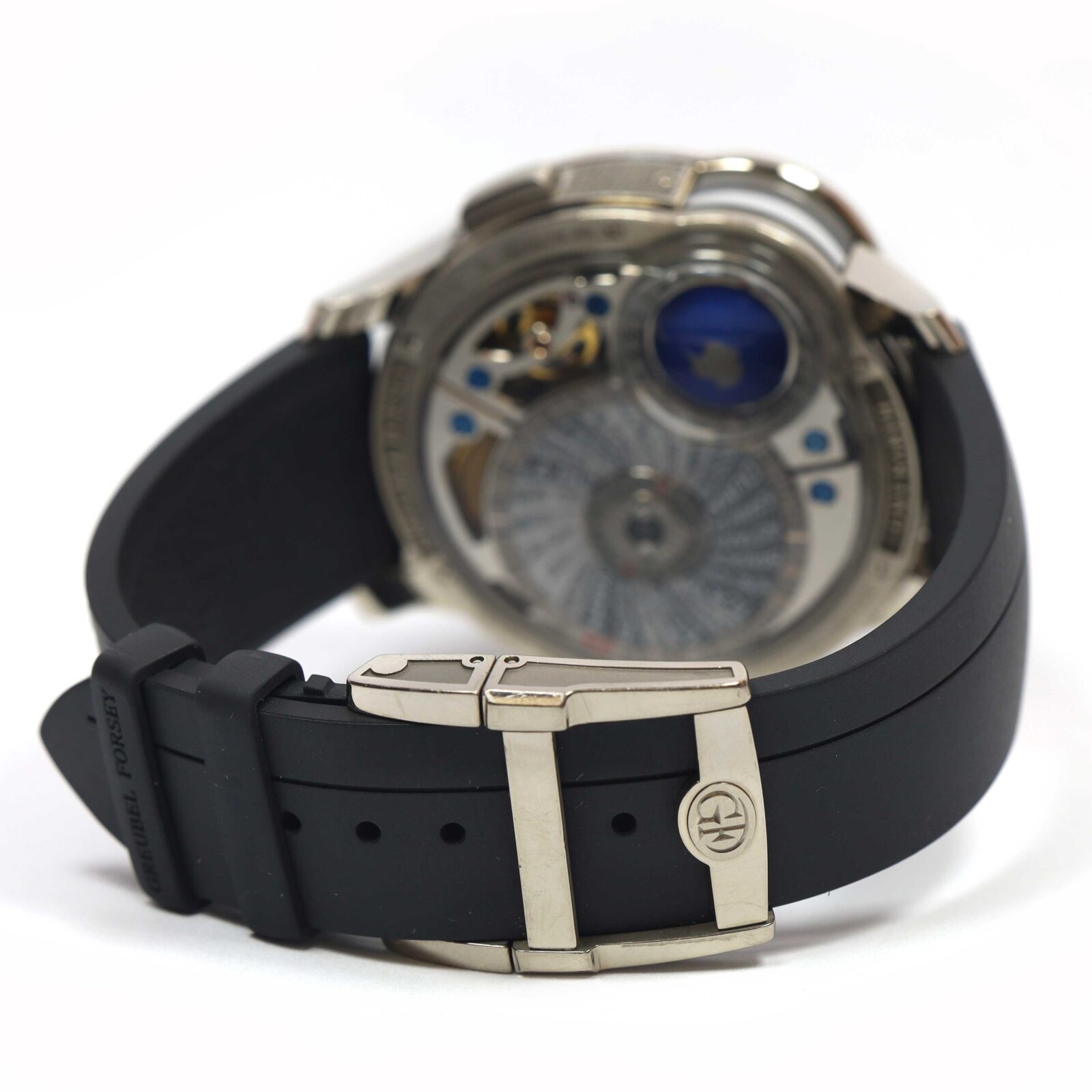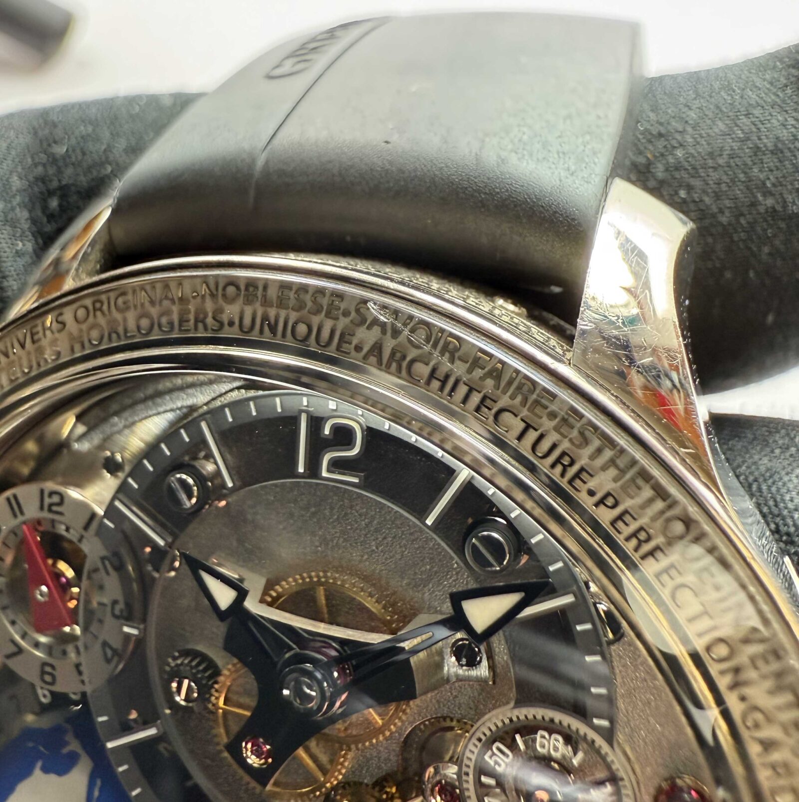 this greubel forsey watch is in excellent overall condition and comes with its box, booklets, watch loupe, and warranty card. This watch is part of a very limited edition with only 33 total pieces produced in this model. Please note there is a tiny scratch on the bezel above the 12 o’clock hour marker as shown in the close up image #5. This watch is in stock and available to ship immediately!