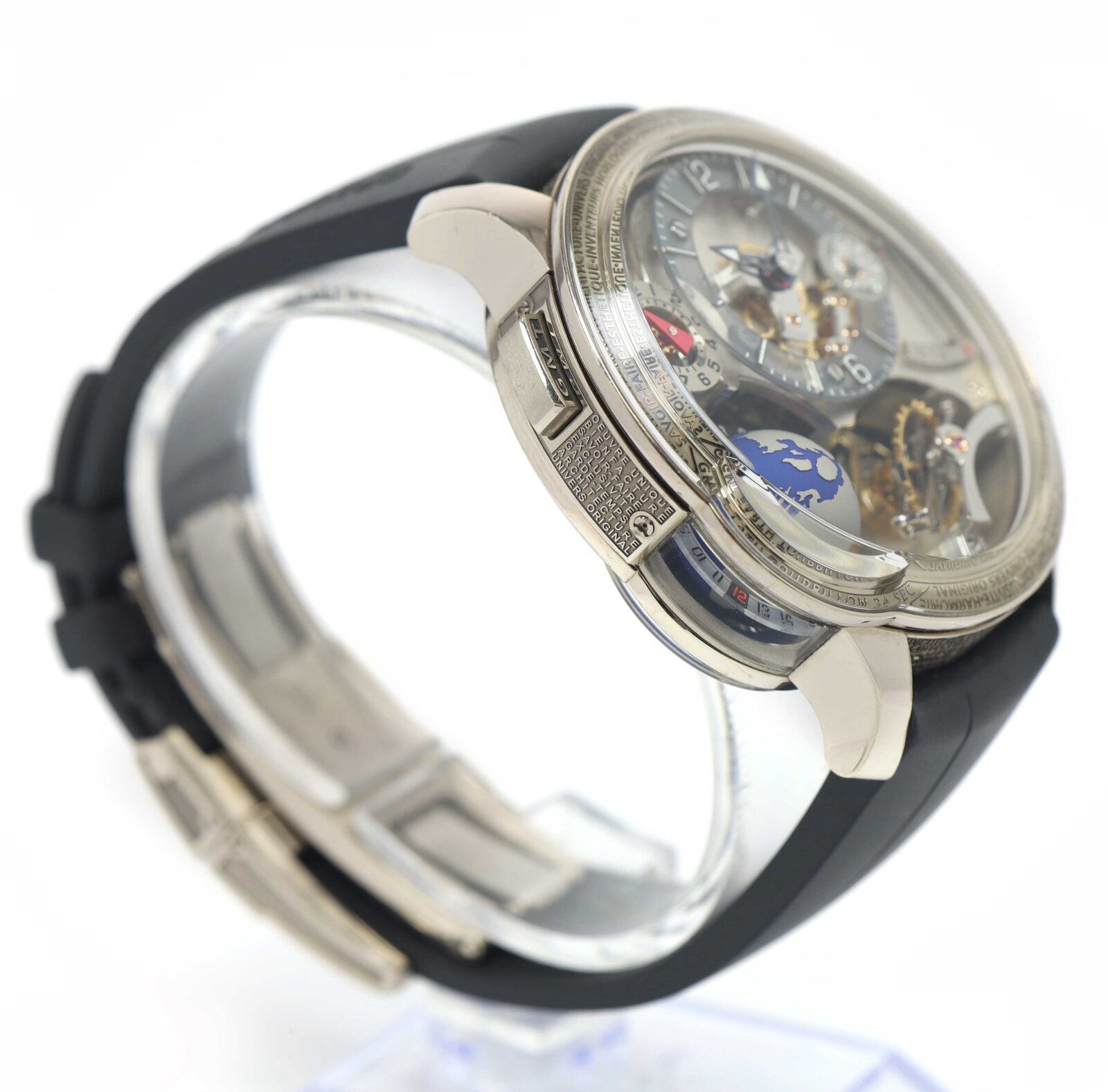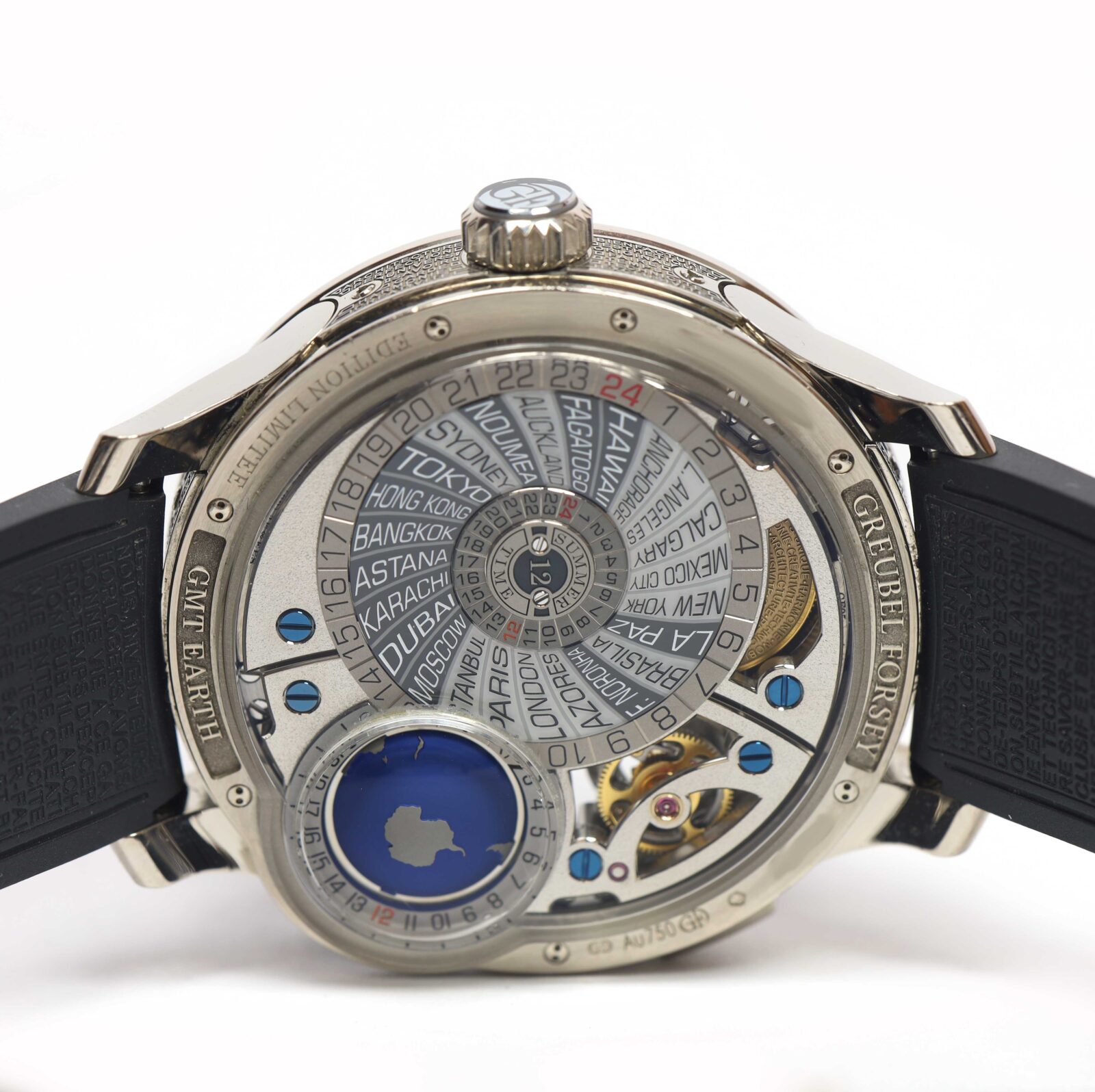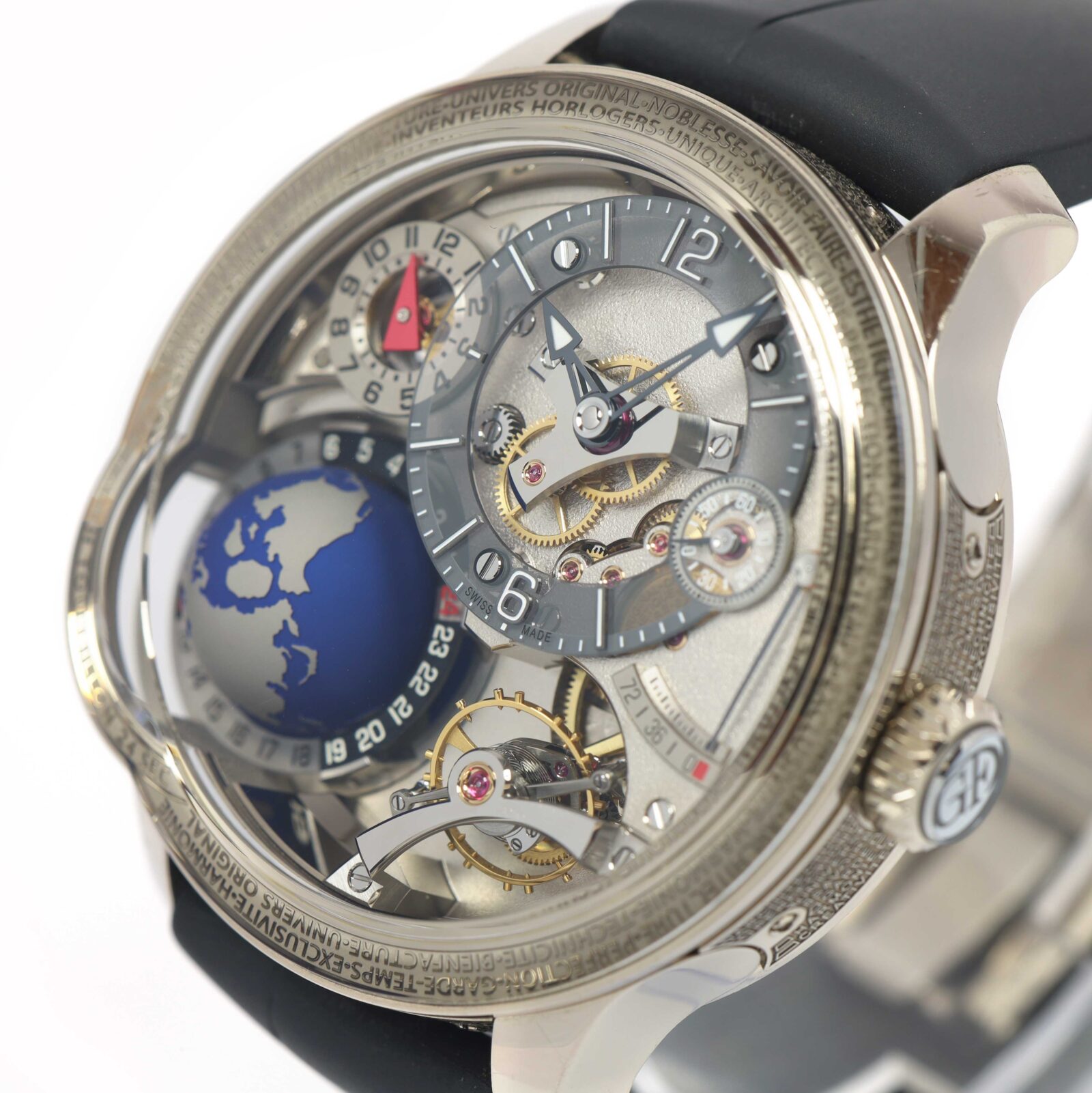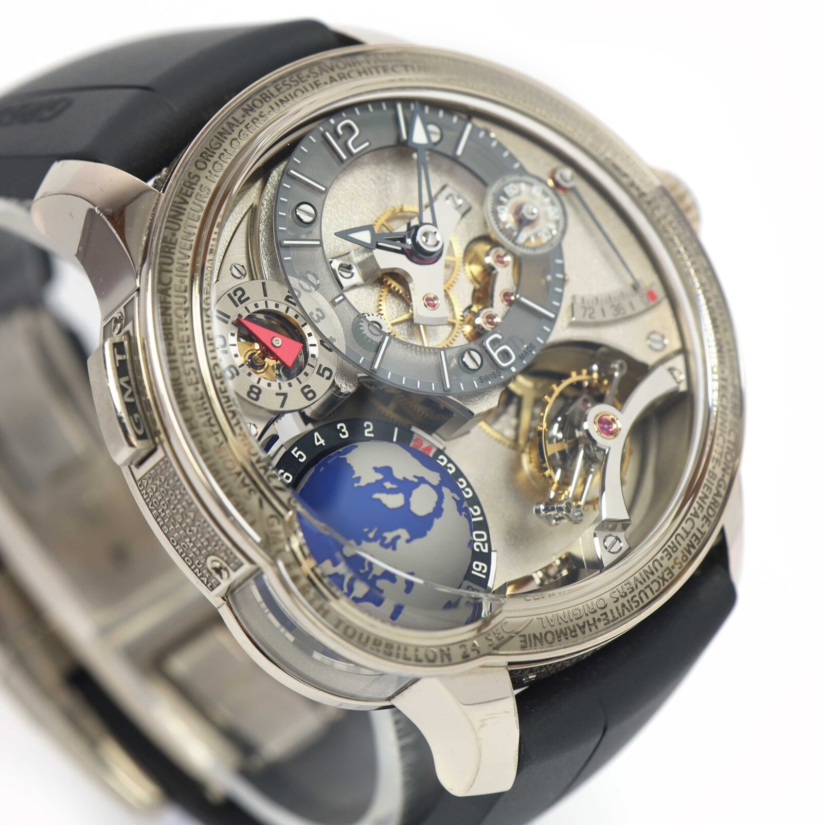 this greubel forsey watch is in excellent overall condition and comes with its box, booklets, watch loupe, and warranty card. This watch is part of a very limited edition with only 33 total pieces produced in this model. Please note there is a tiny scratch on the bezel above the 12 o’clock hour marker as shown in the close up image #5. This watch is in stock and available to ship immediately!