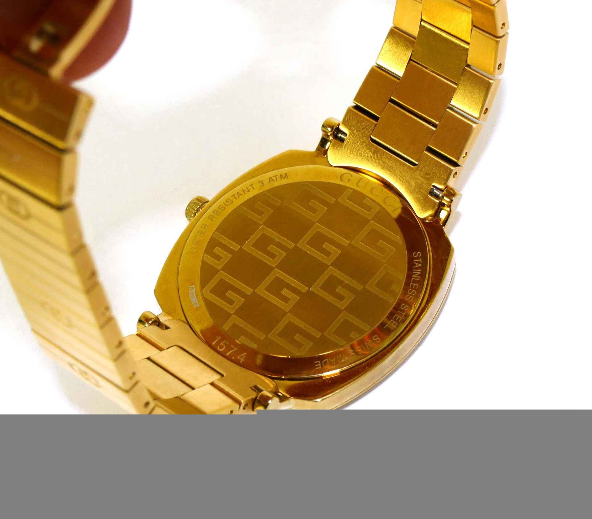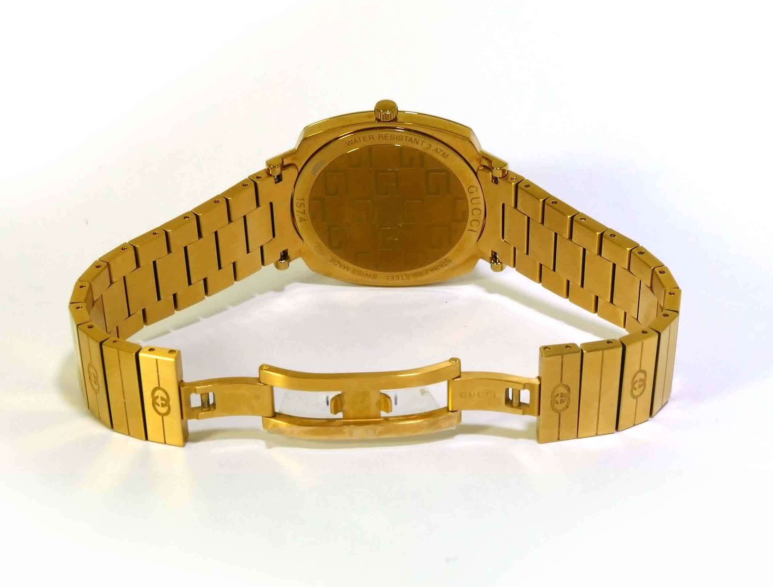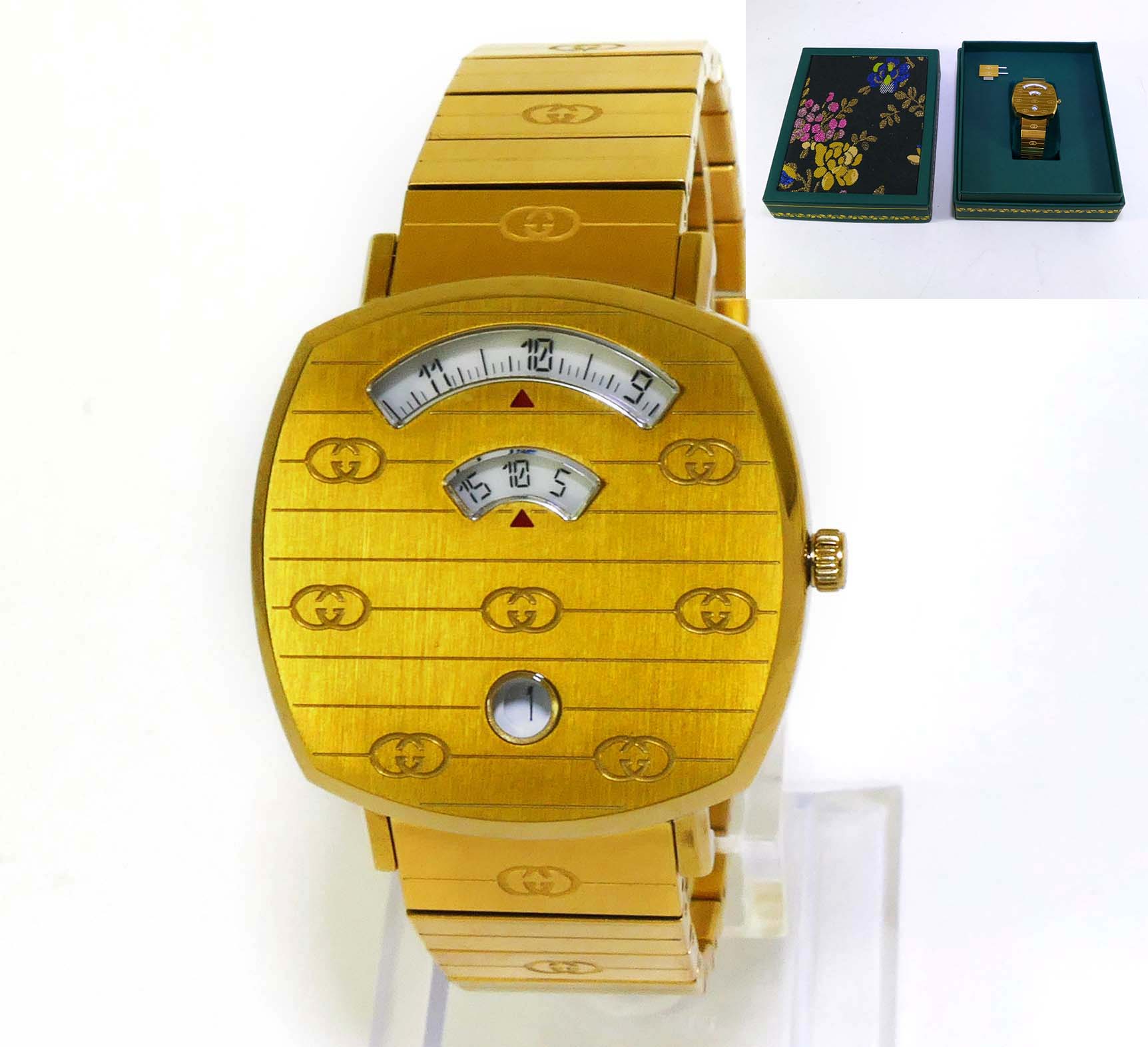 This Gucci watch is in mint condition and appears to be unworn. It comes with its original box and all original links.